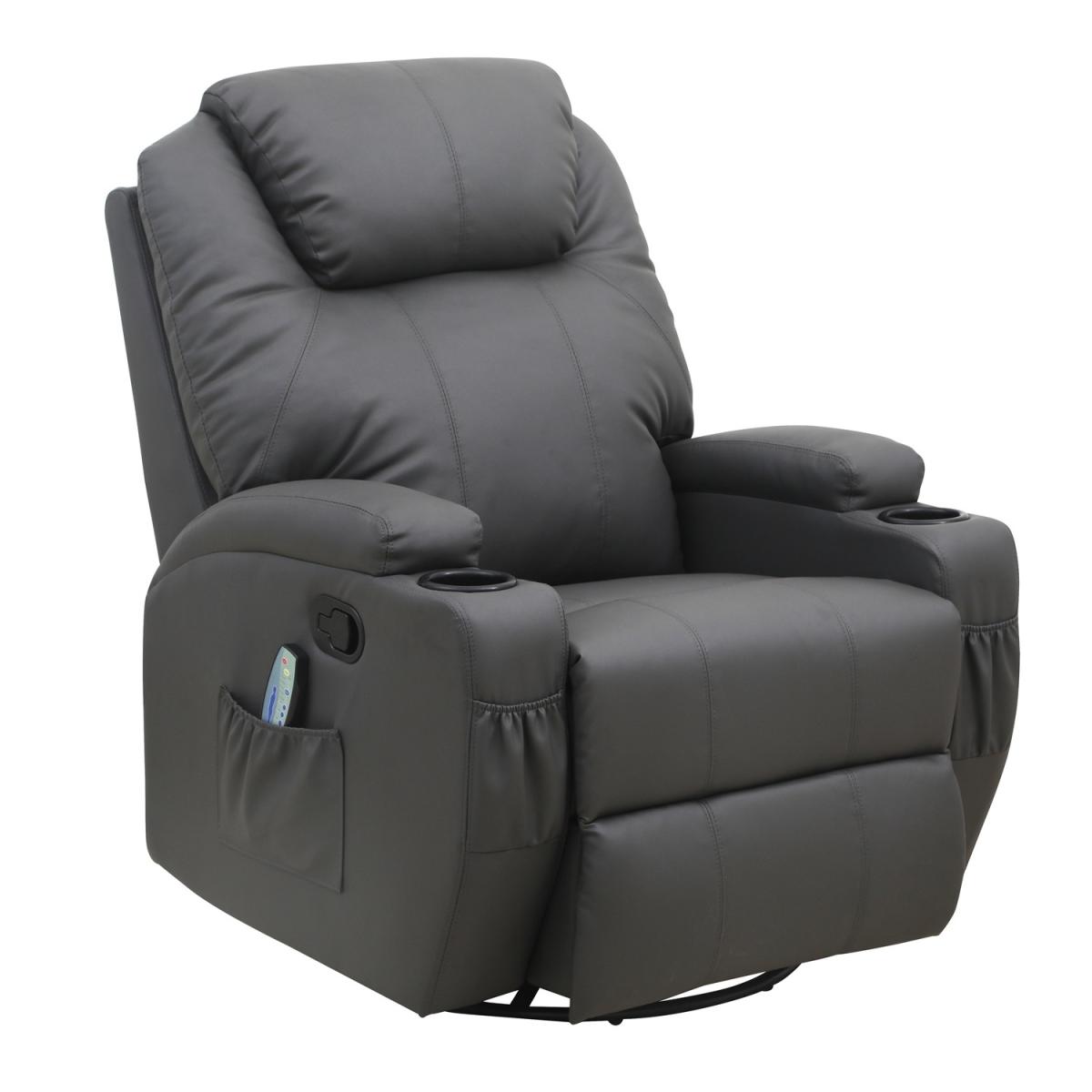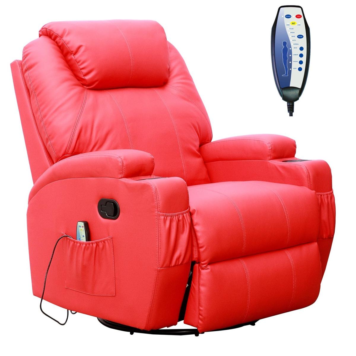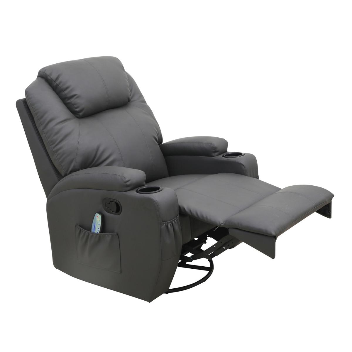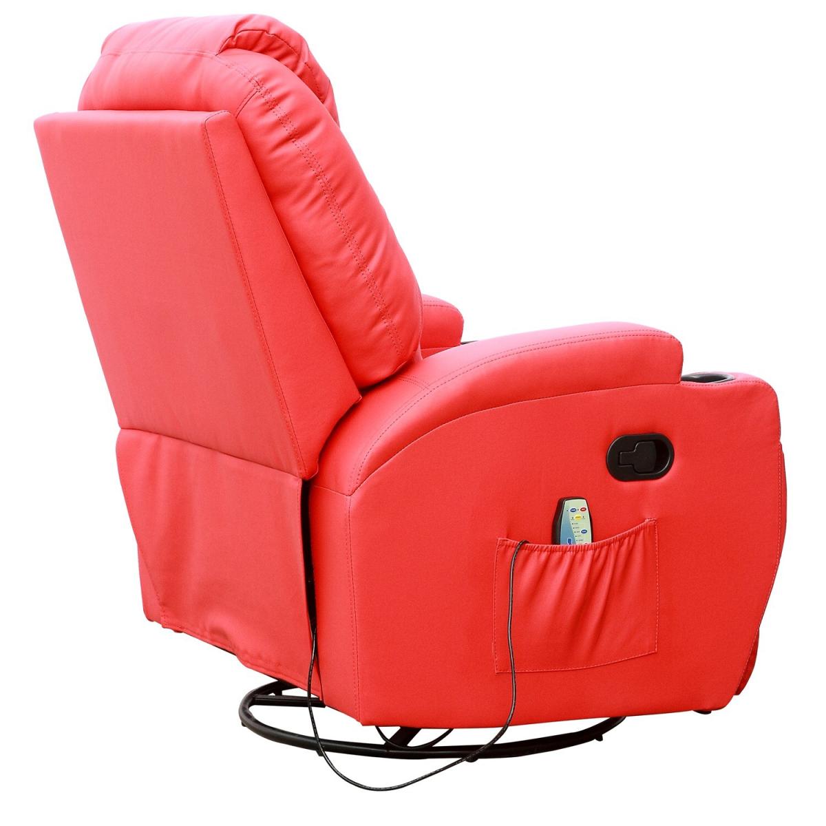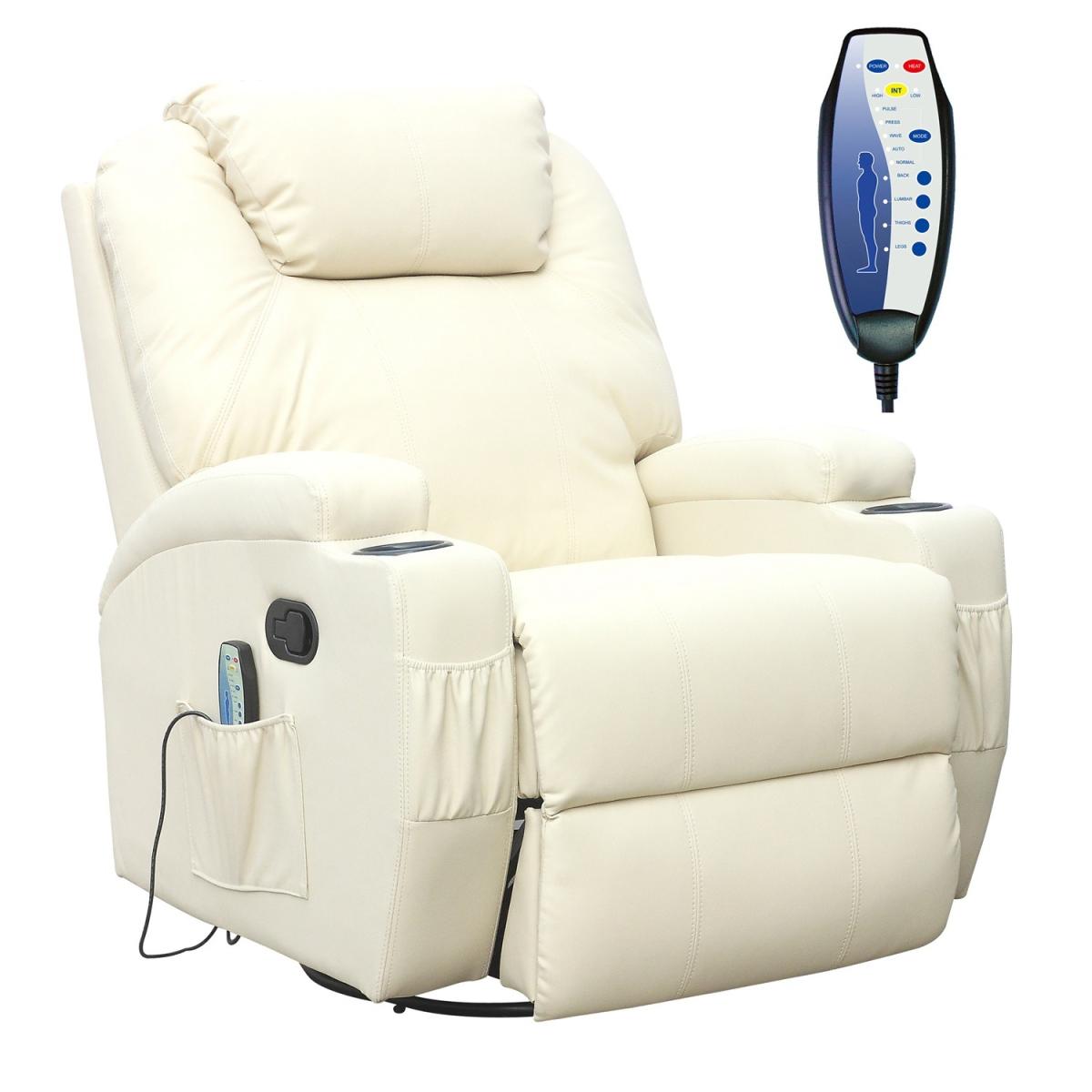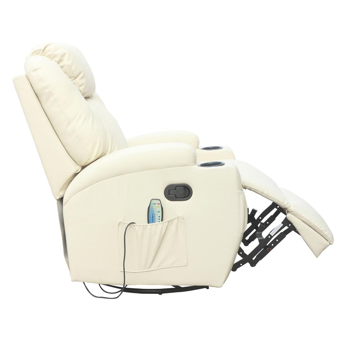 Pull the latch mechanism on the side turn the chair into a recliner and then you can apply the massage and heat just for relaxing or easing aches and pains and helping circulation. Additional functions are a 360-degree swivel and a backwards and forwards rocking action. Just for fun, the chair is fitted with a cup/bottle holder in each arm. Four pockets have been added for storage (Remote control or magazines). Swivel and rock function: Facilitated by an integral metal base under the chair. Easy to operate. Fully faced with thick bonded leather on the backrest and the seat. We do not use cheap PU or PVC (plastics) on the face of our chair.