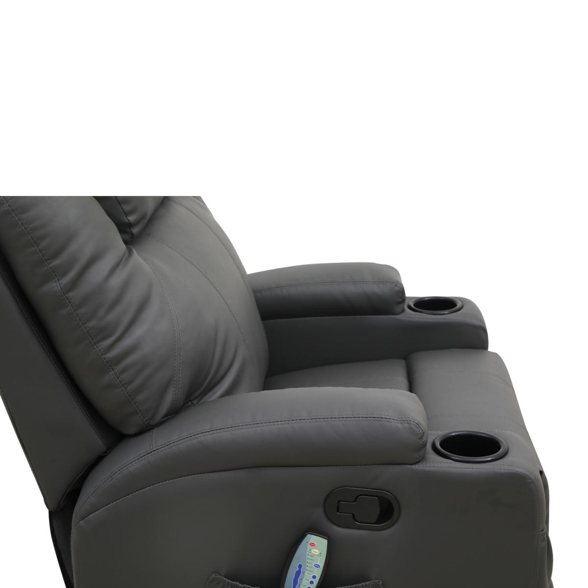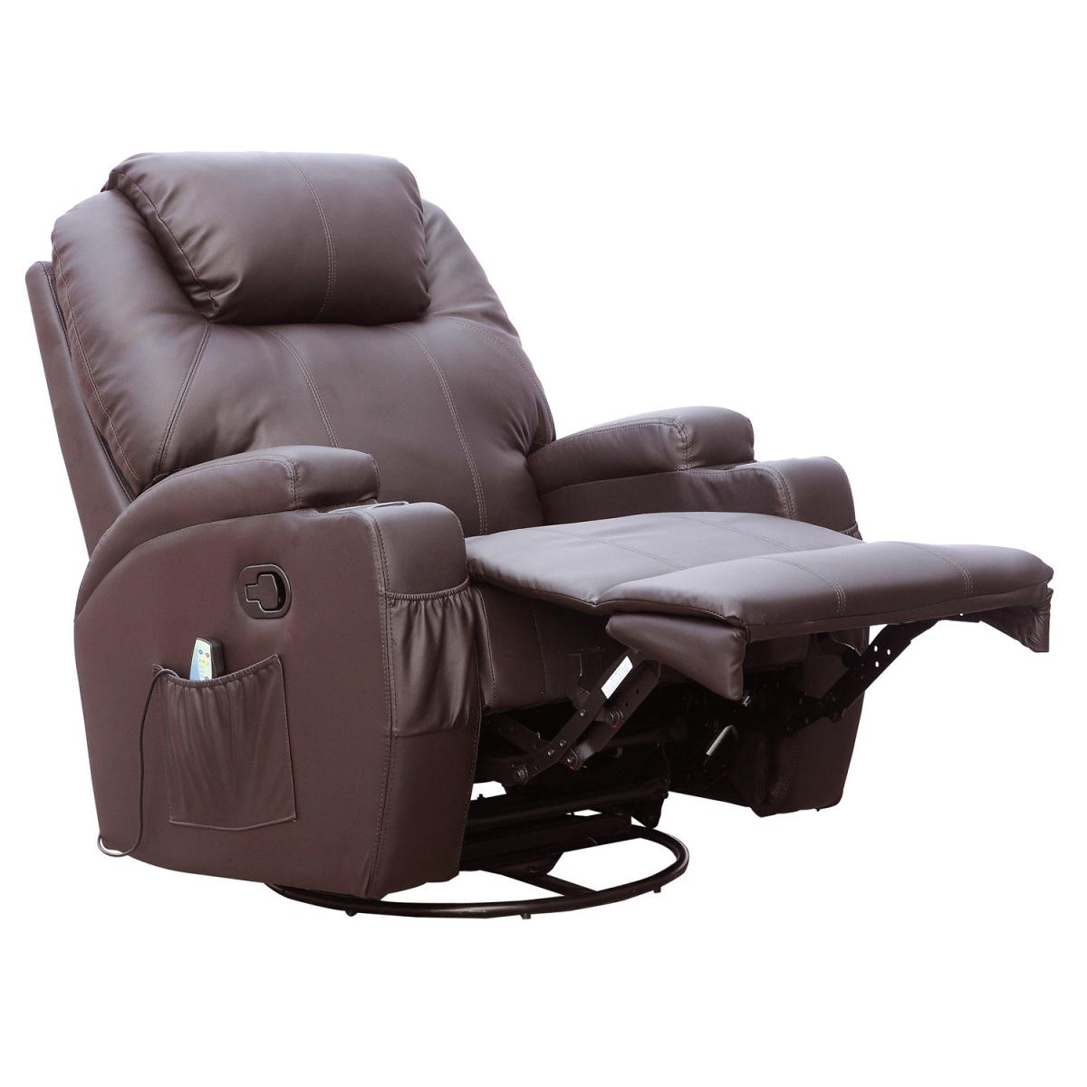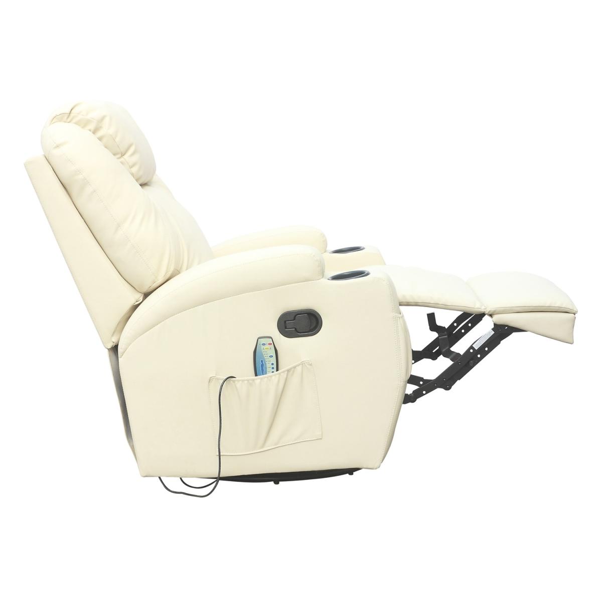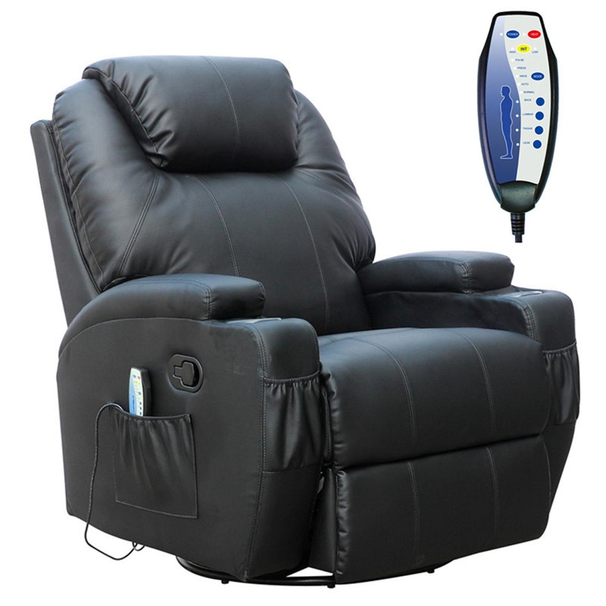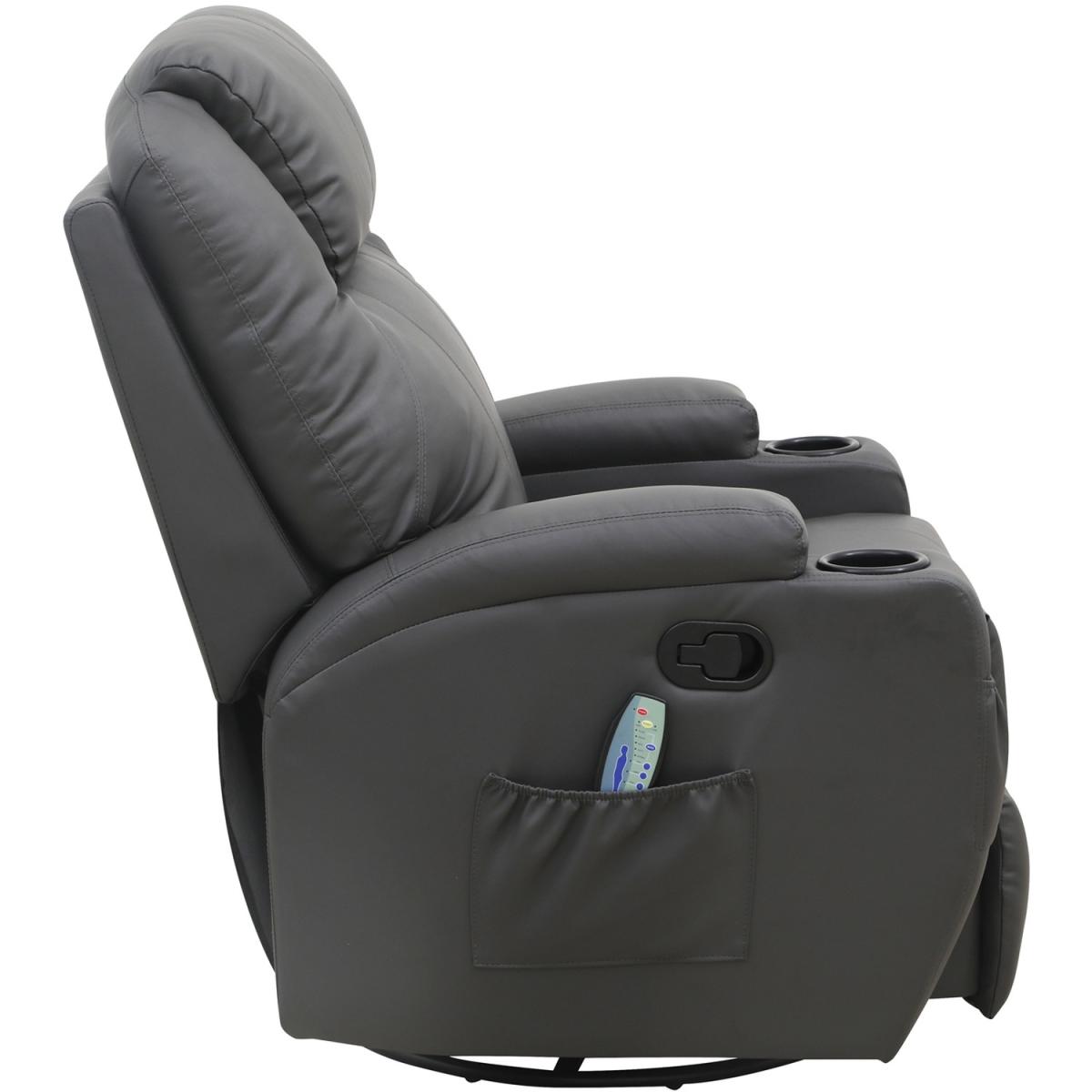 Pull the latch mechanism on the side turn the chair into a recliner and then you can apply the massage and heat just for relaxing or easing aches and pains and helping circulation. Additional functions are a 360-degree swivel and a backwards and forwards rocking action. Just for fun, the chair is fitted with a cup/bottle holder in each arm. Four pockets have been added for storage (Remote control or magazines). Swivel and rock function: Facilitated by an integral metal base under the chair. Easy to operate. Fully faced with thick bonded leather on the backrest and the seat. We do not use cheap PU or PVC (plastics) on the face of our chair.
