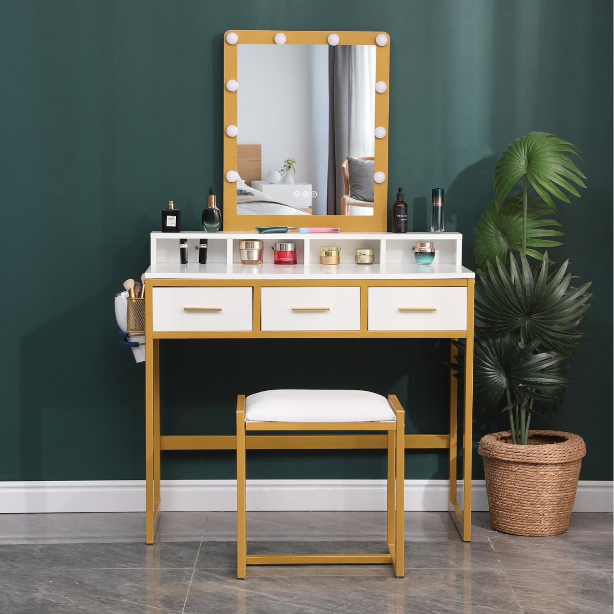 The dressing table comes with a Hollywood-inspired mirror surrounded by LED bulbs, providing excellent lighting for makeup application and adding a glamorous touch to your space. Featuring three large drawers and multiple open compartments, this table offers plenty of space to organize cosmetics, skincare products, and accessories, keeping your area tidy and clutter-free. Available in two stunning colour combinations, white with a golden frame for a chic, contemporary vibe, and brown with a black frame for a rustic, industrial look, this dressing table complements any decor, adding sophistication to your bedroom or dressing area. Comes with a free hairdryer holder and brush basket on the side, ideal for keeping essential tools like hairdryers and styling tools within easy reach, ensuring a well-organized and efficient setup.