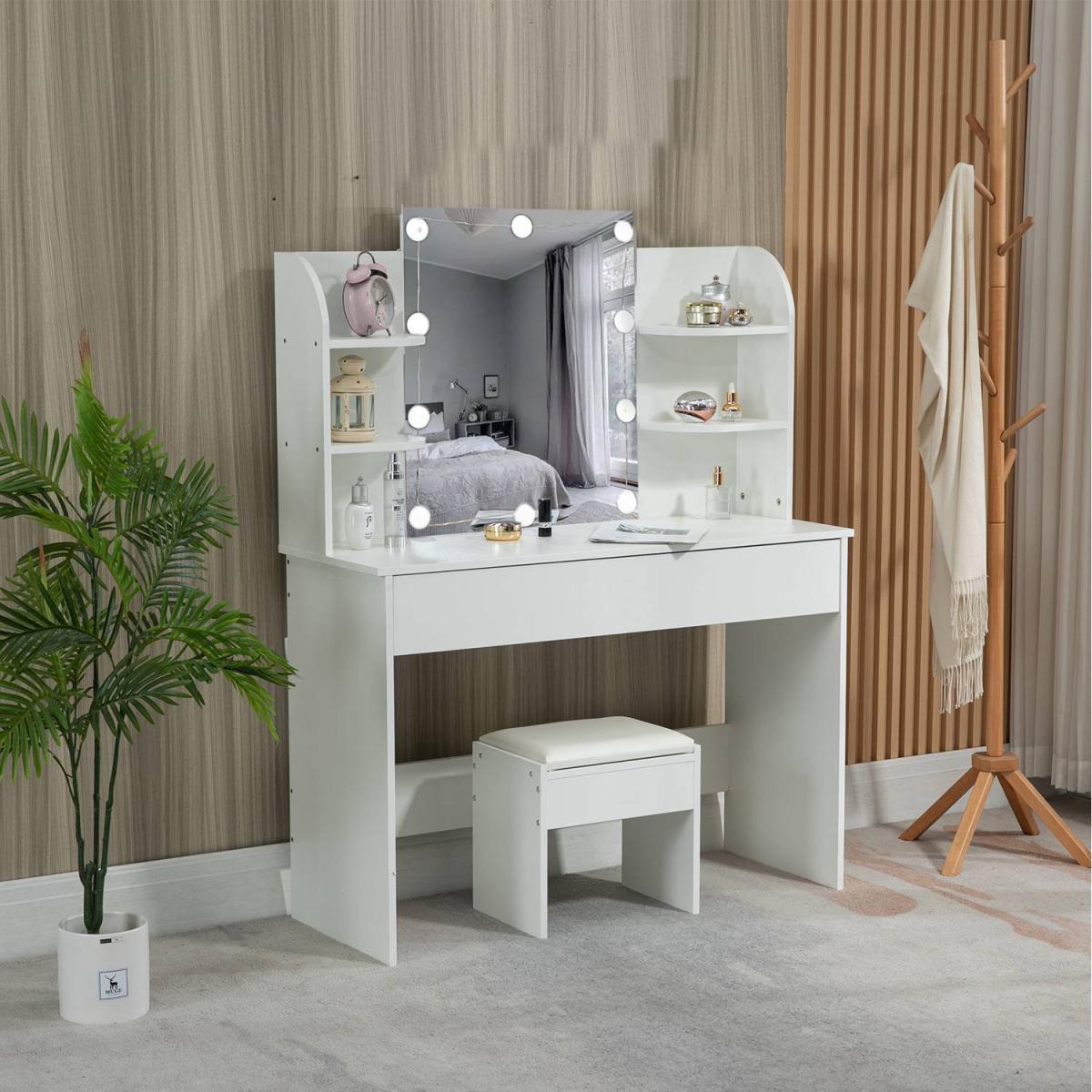 Elevate your morning routine with this modern white dressing table set. It includes open shelves for easy access, drawers for secure storage, and a mirror for organizing makeup, jewellery, and accessories, keeping your room neat and tidy. The set includes a matching stool, ensuring comfort and style as you prepare for your day. This dressing table boasts 10 LED lights with switch control, offering adjustable brightness and three light colour settings: warm yellow, natural white, and white. Perfect for meeting various makeup needs. Includes all necessary parts and assembly instructions for easy setup. Crafted from stable and strong wood, the vanity measures 105cm L x 40cmW x 139.5cm. H.
