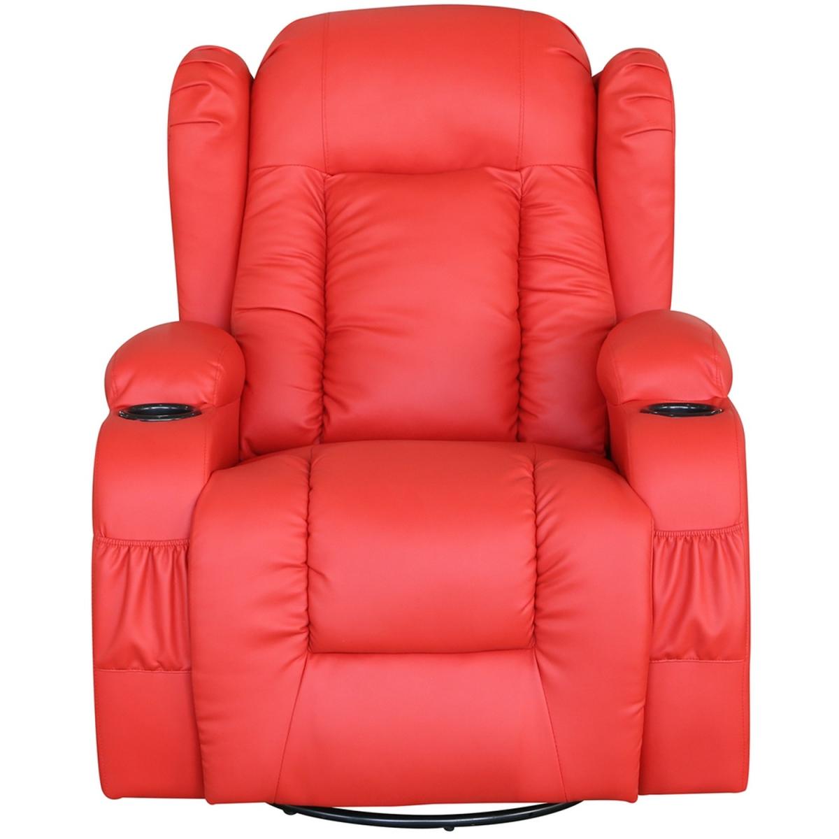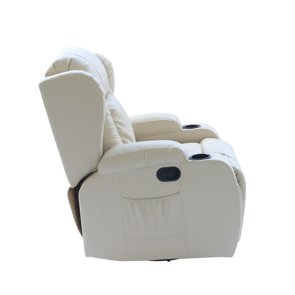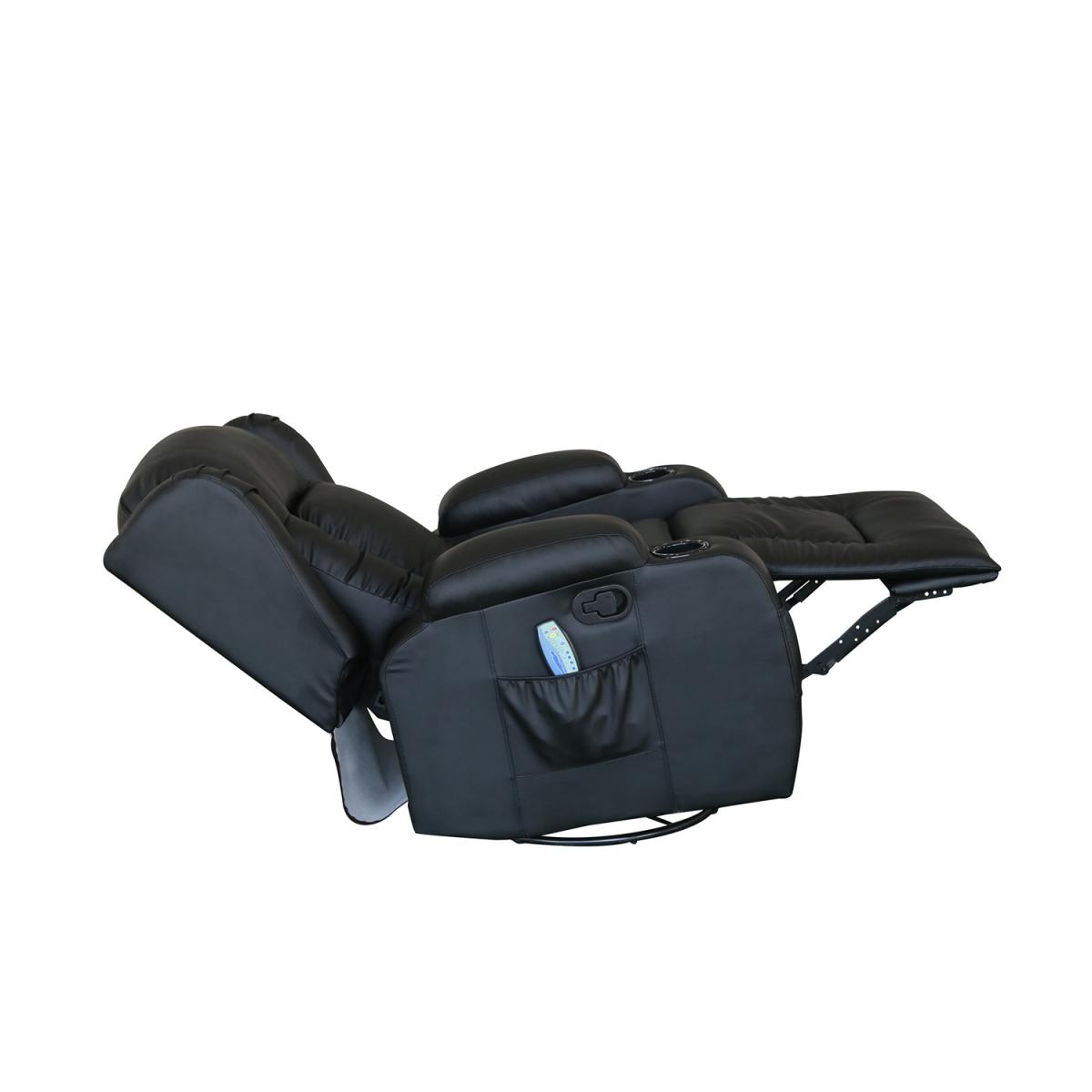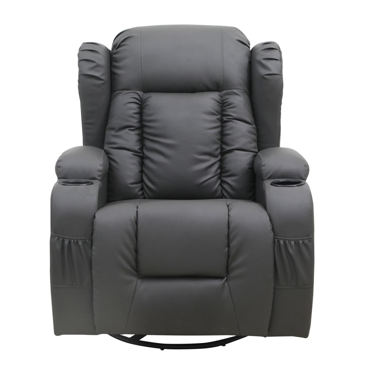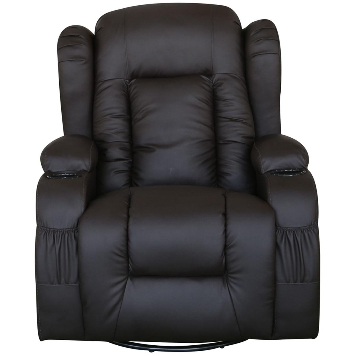 Pull the latch mechanism on the side turn the chair into a recliner and then you can apply the massage and heat just for relaxing or easing aches and pains and helping circulation. Just for fun, the chair is fitted with a cup/bottle holder in each arm. Easy to operate. Fully faced with thick bonded leather on the backrest and the seat. We do not use cheap PU or PVC (plastics) on the face of our chair. 9 in 1 features: recliner, rocker, massage, 360-degree swivel, heated seat, winged backrest for head and neck support, left-hand drink holder, right-hand drink holder, side storage pockets.