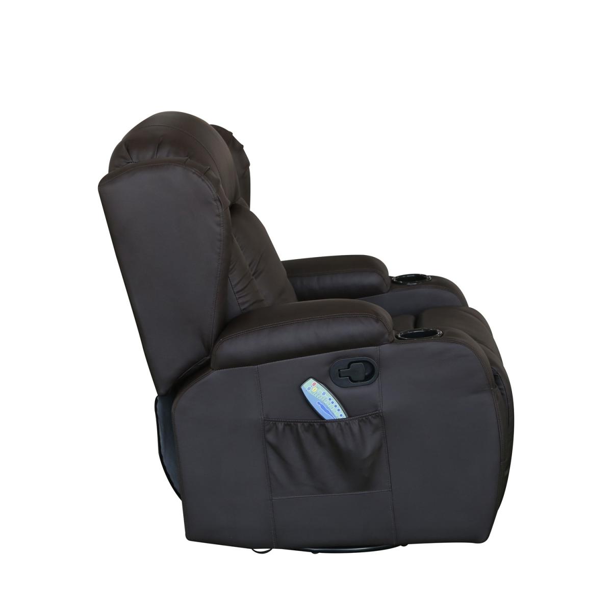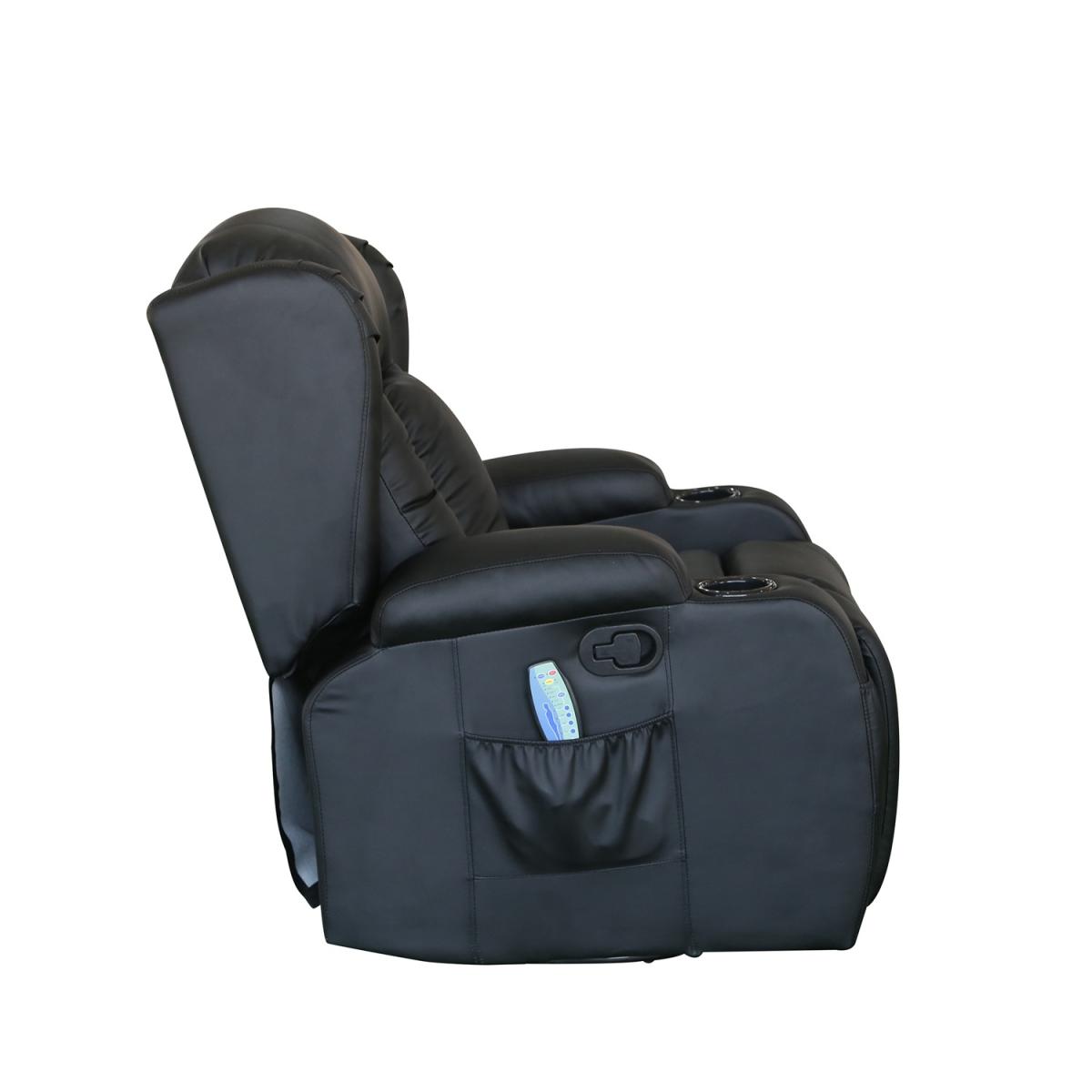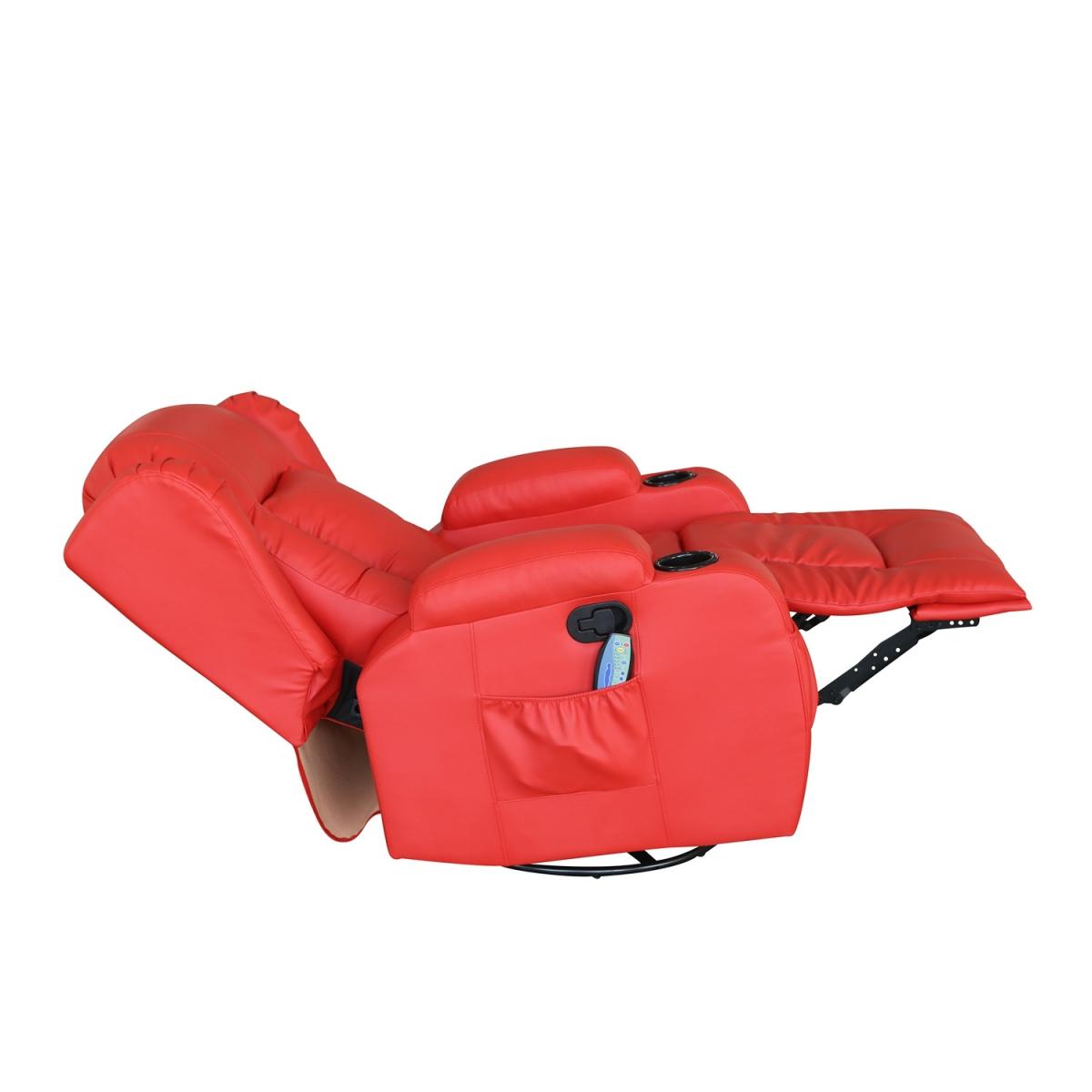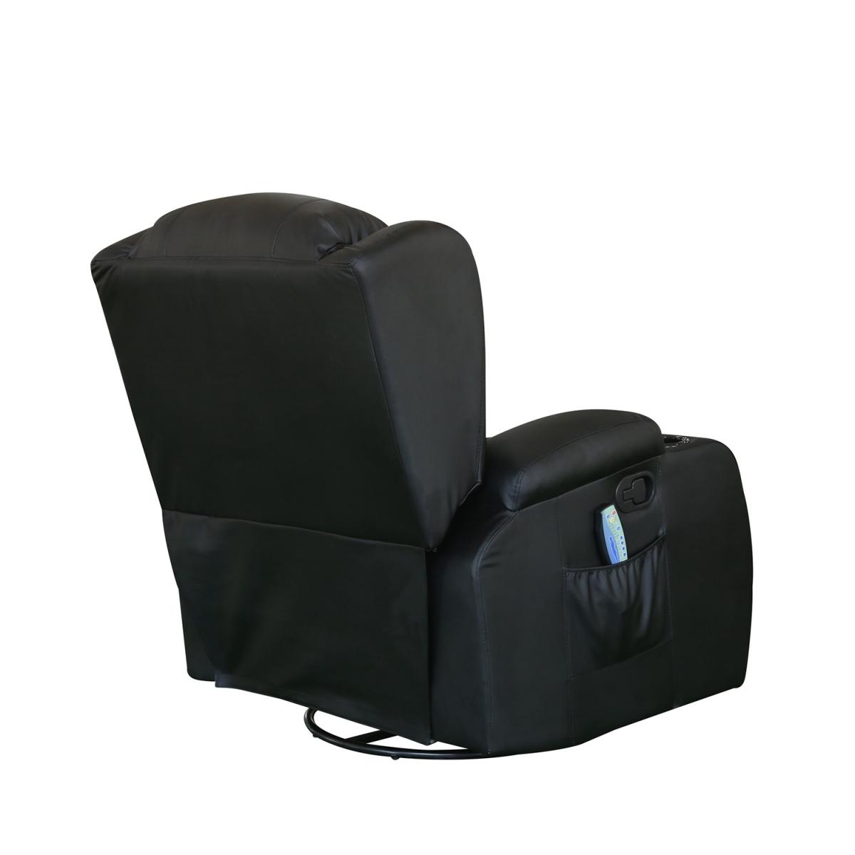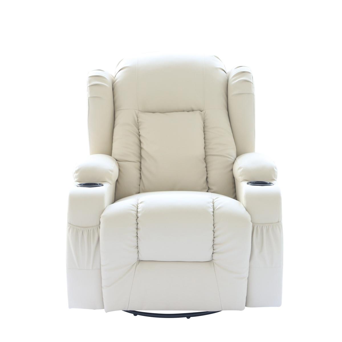 Pull the latch mechanism on the side turn the chair into a recliner and then you can apply the massage and heat just for relaxing or easing aches and pains and helping circulation. Just for fun, the chair is fitted with a cup/bottle holder in each arm. Easy to operate. Fully faced with thick bonded leather on the backrest and the seat. We do not use cheap PU or PVC (plastics) on the face of our chair. 9 in 1 features: recliner, rocker, massage, 360-degree swivel, heated seat, winged backrest for head and neck support, left-hand drink holder, right-hand drink holder, side storage pockets.