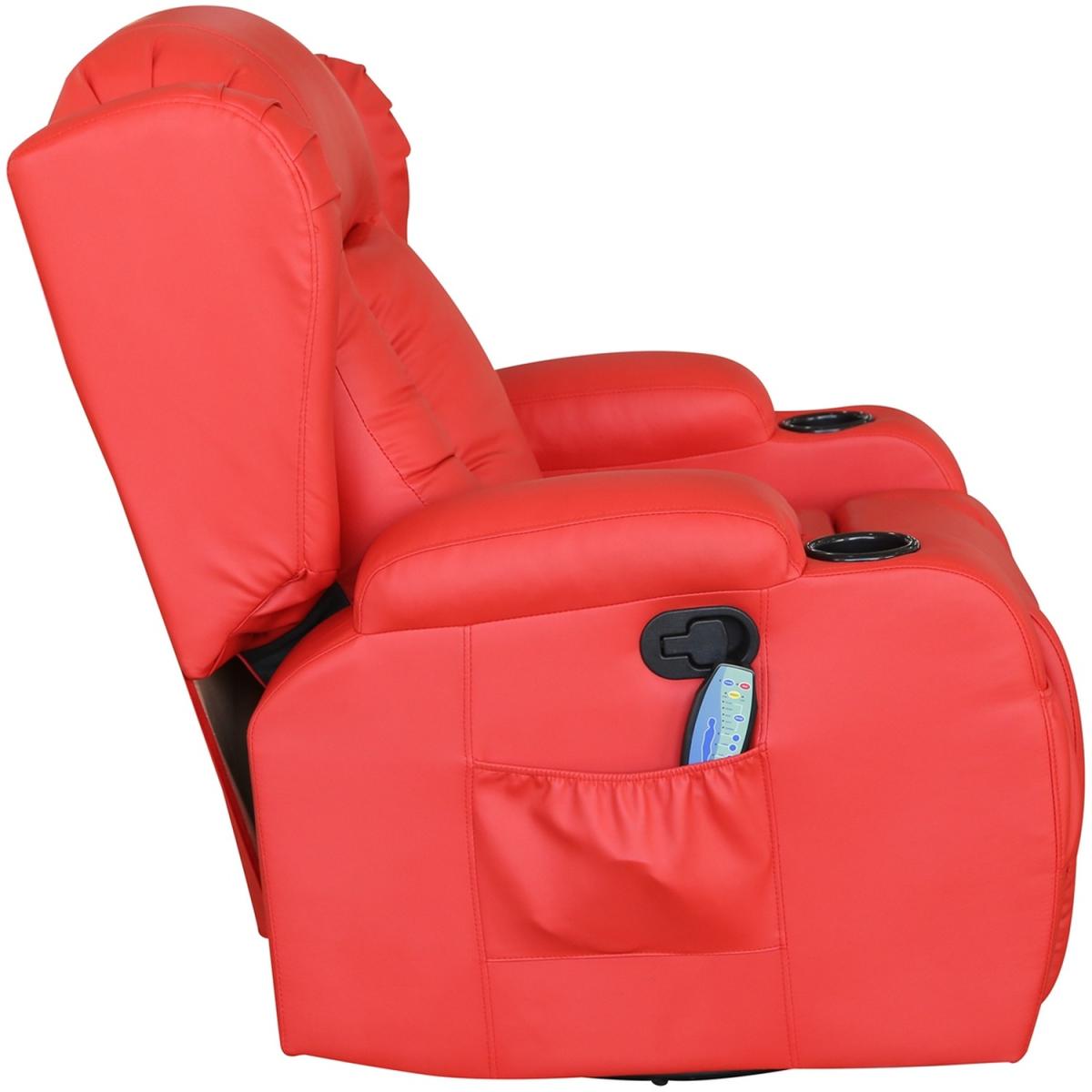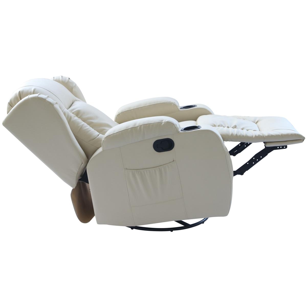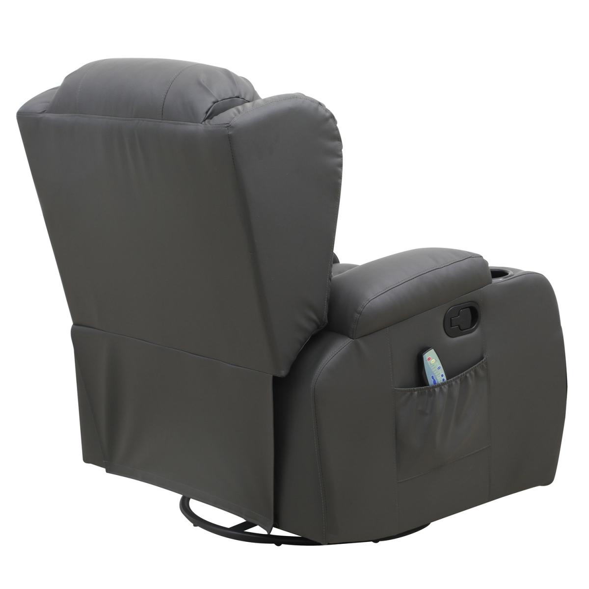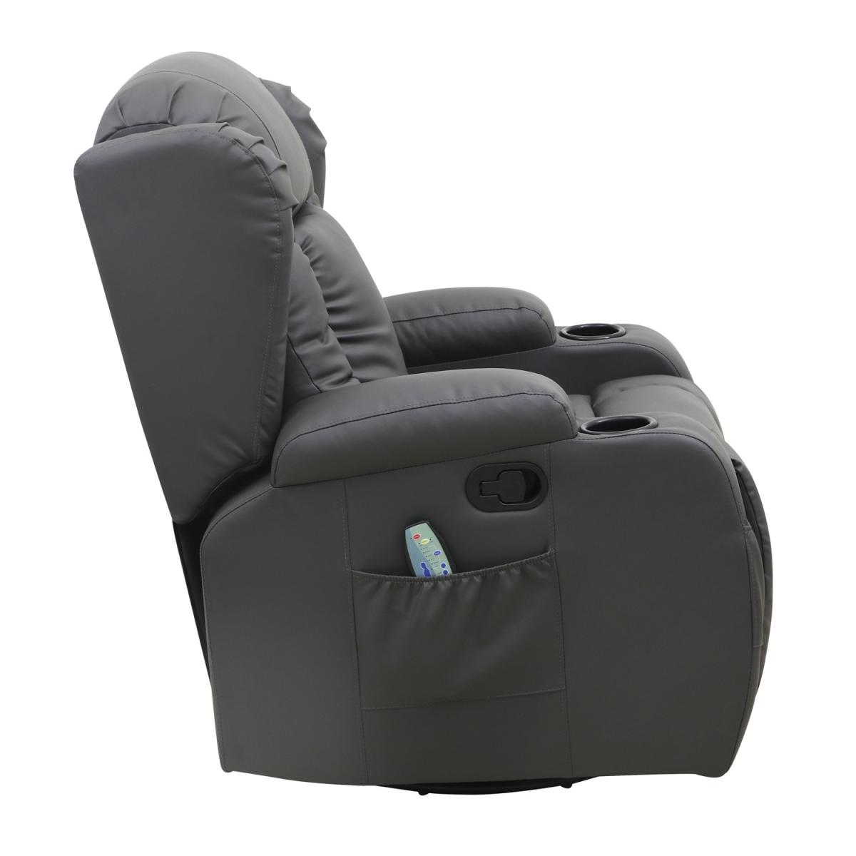 Pull the latch mechanism on the side turn the chair into a recliner and then you can apply the massage and heat just for relaxing or easing aches and pains and helping circulation. Just for fun, the chair is fitted with a cup/bottle holder in each arm. Easy to operate. Fully faced with thick bonded leather on the backrest and the seat. We do not use cheap PU or PVC (plastics) on the face of our chair. 9 in 1 features: recliner, rocker, massage, 360-degree swivel, heated seat, winged backrest for head and neck support, left-hand drink holder, right-hand drink holder, side storage pockets.