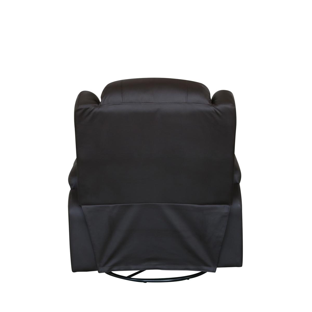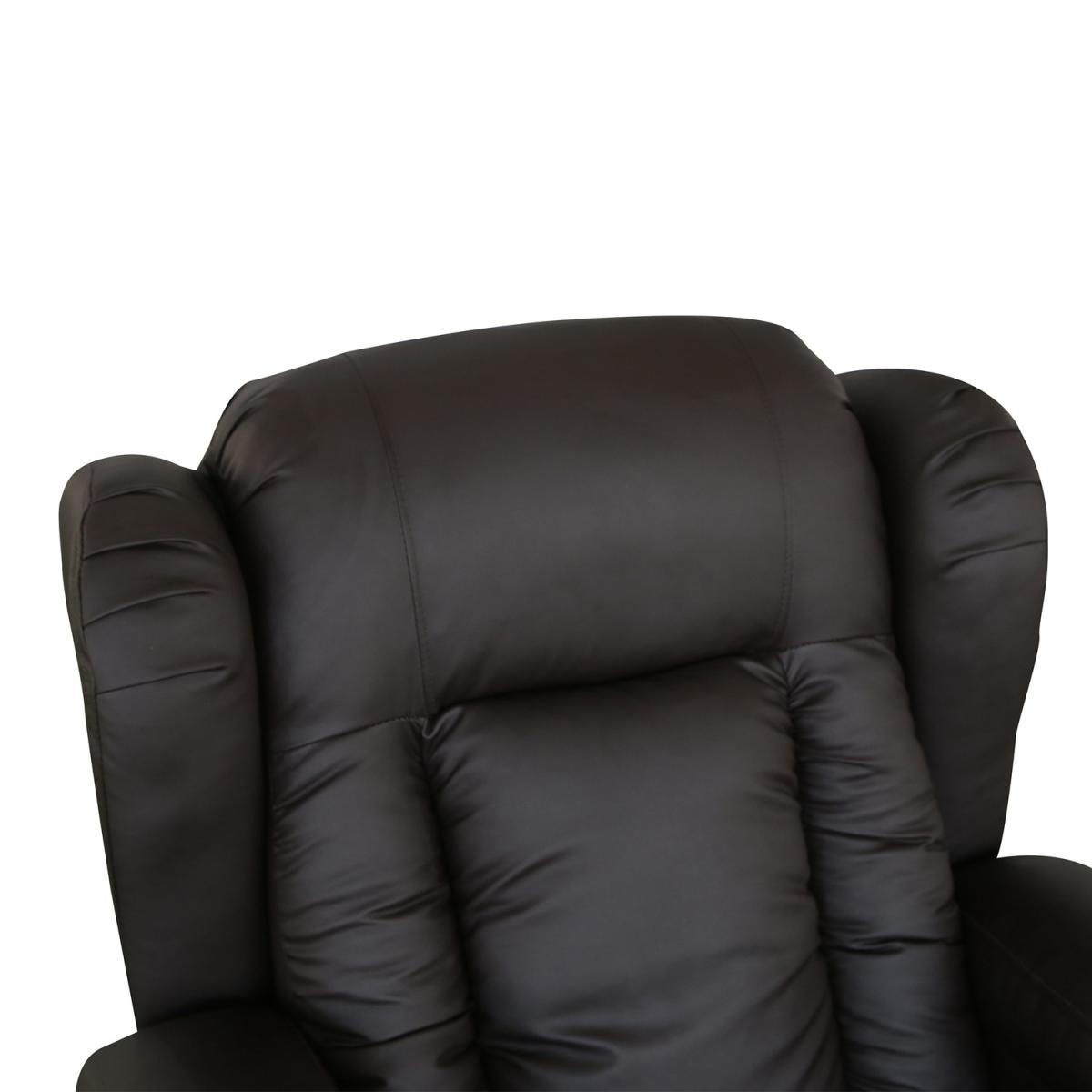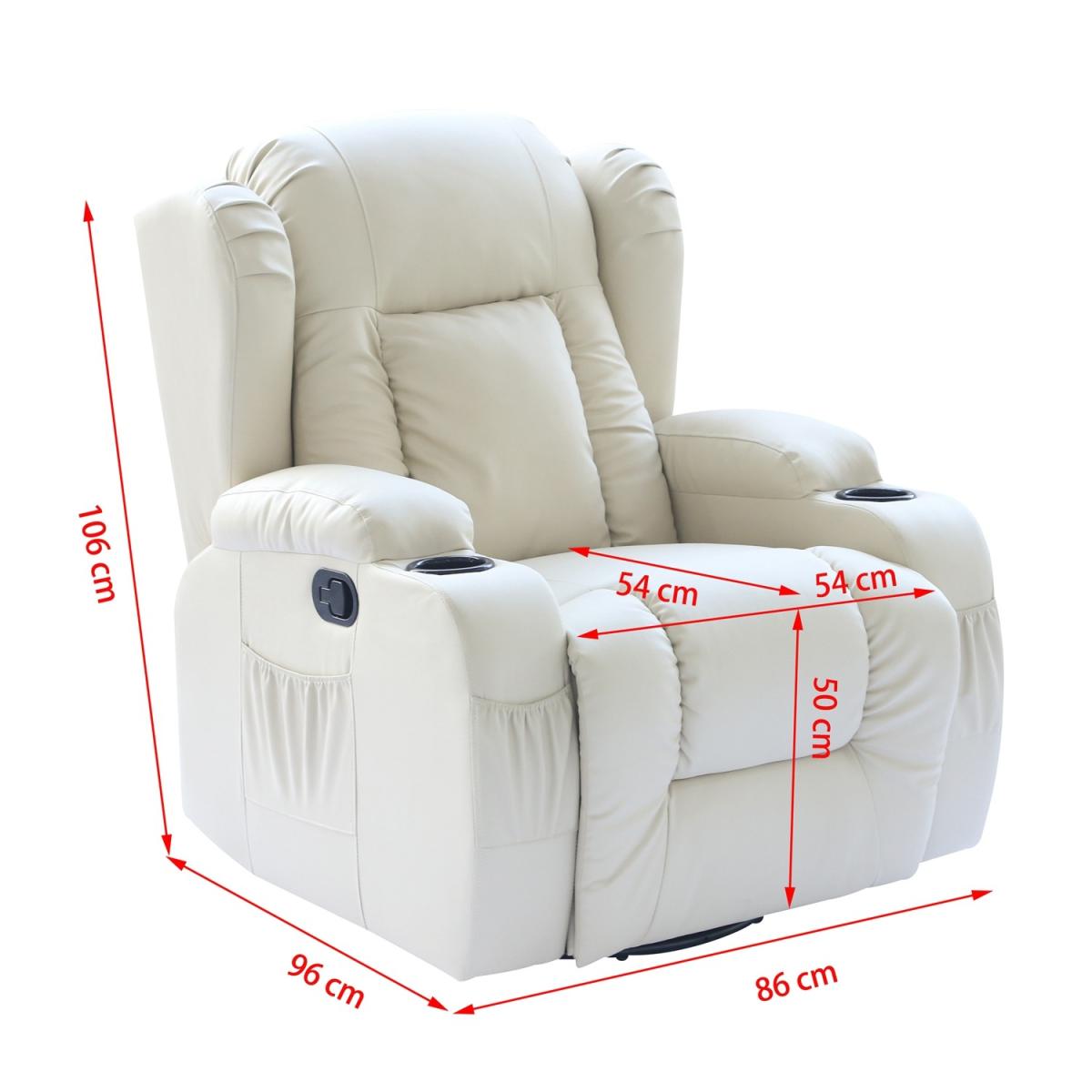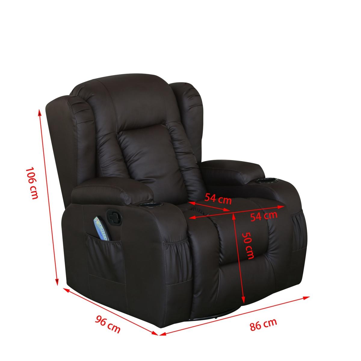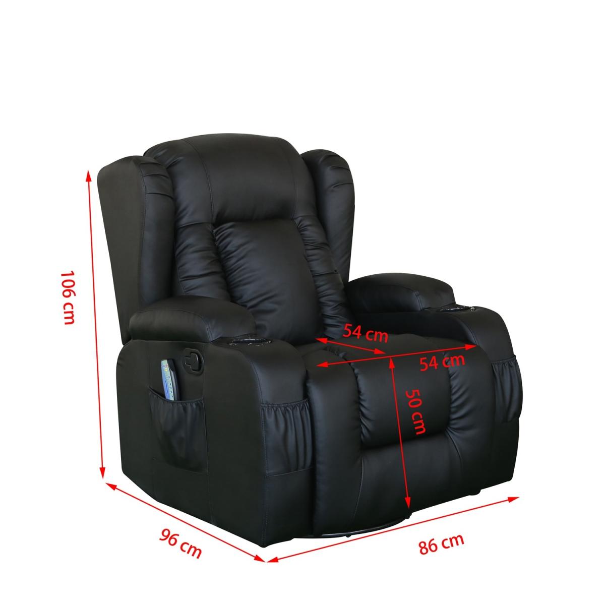 Pull the latch mechanism on the side turn the chair into a recliner and then you can apply the massage and heat just for relaxing or easing aches and pains and helping circulation. Just for fun, the chair is fitted with a cup/bottle holder in each arm. Easy to operate. Fully faced with thick bonded leather on the backrest and the seat. We do not use cheap PU or PVC (plastics) on the face of our chair. 9 in 1 features: recliner, rocker, massage, 360-degree swivel, heated seat, winged backrest for head and neck support, left-hand drink holder, right-hand drink holder, side storage pockets.