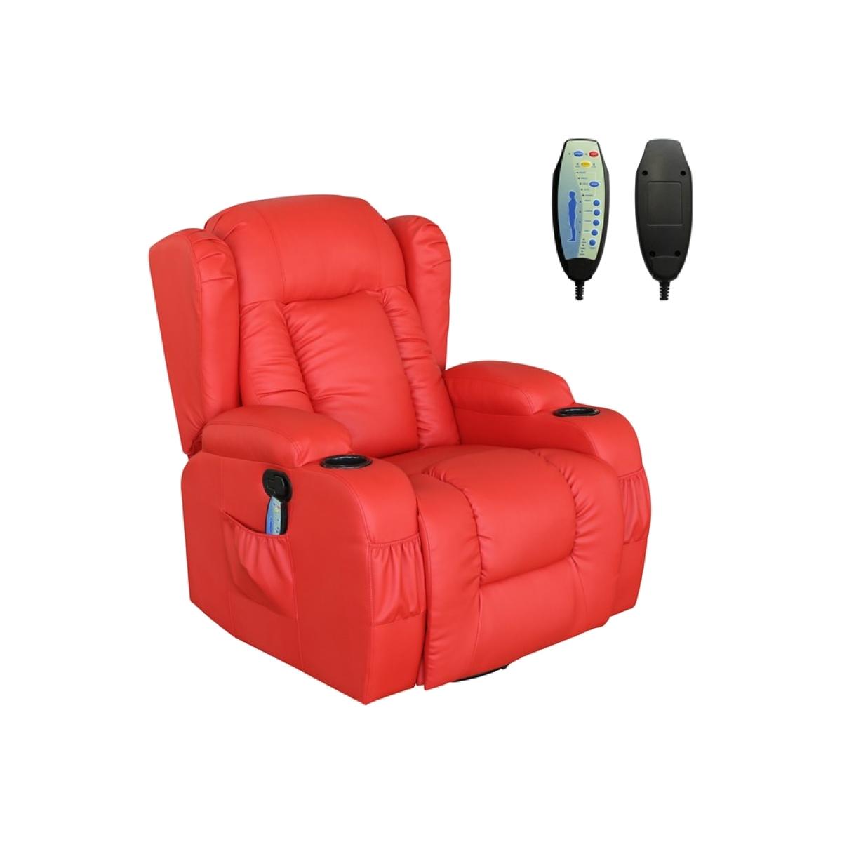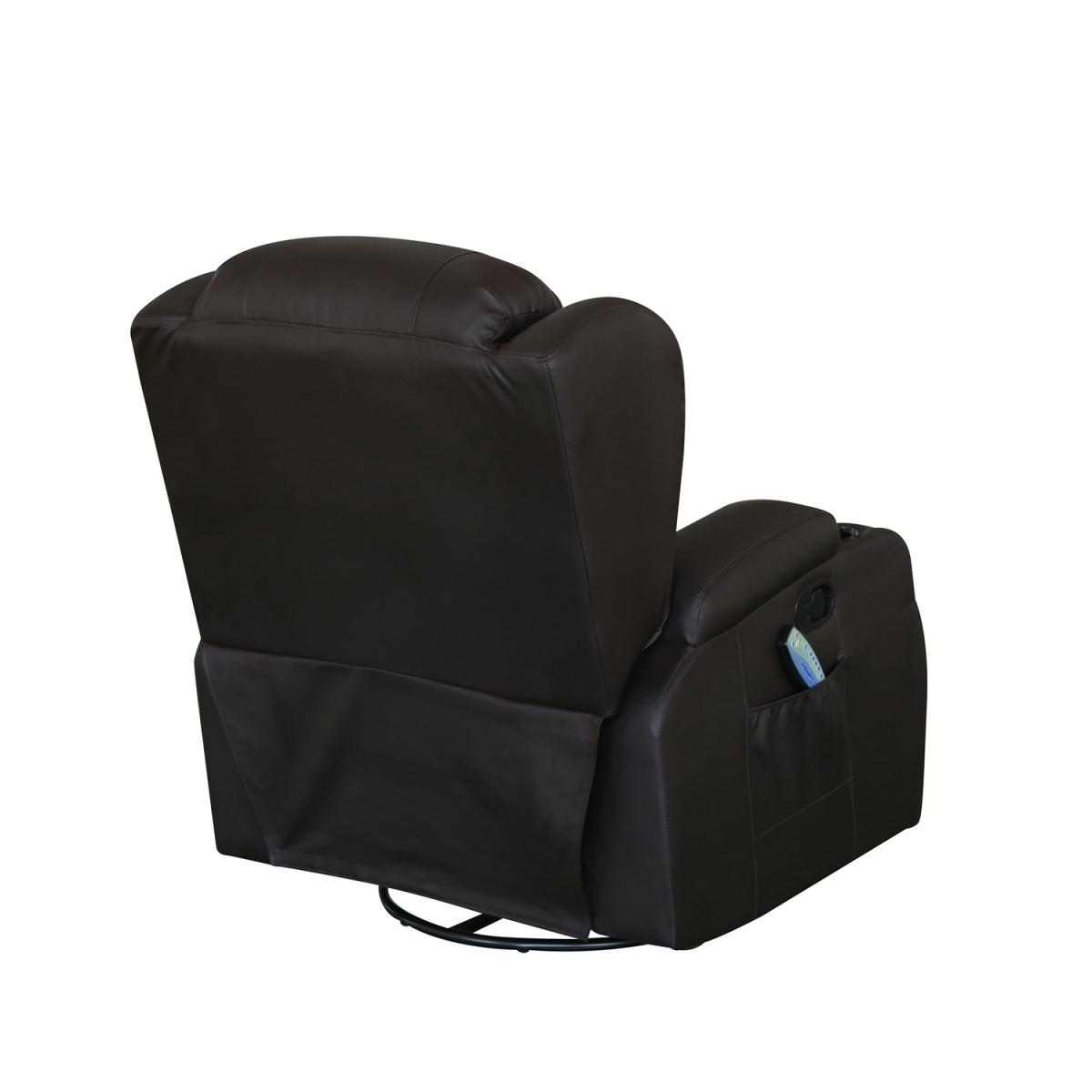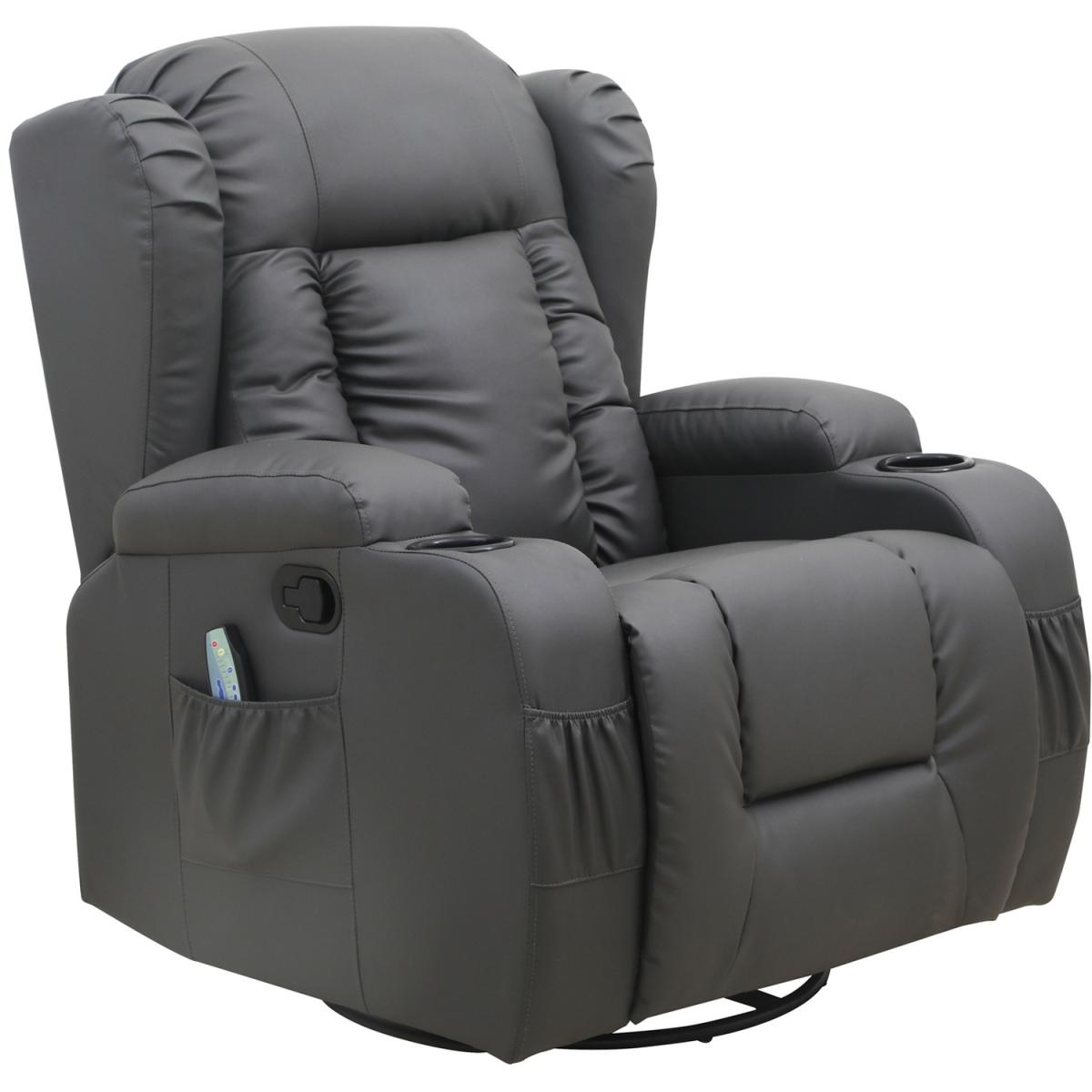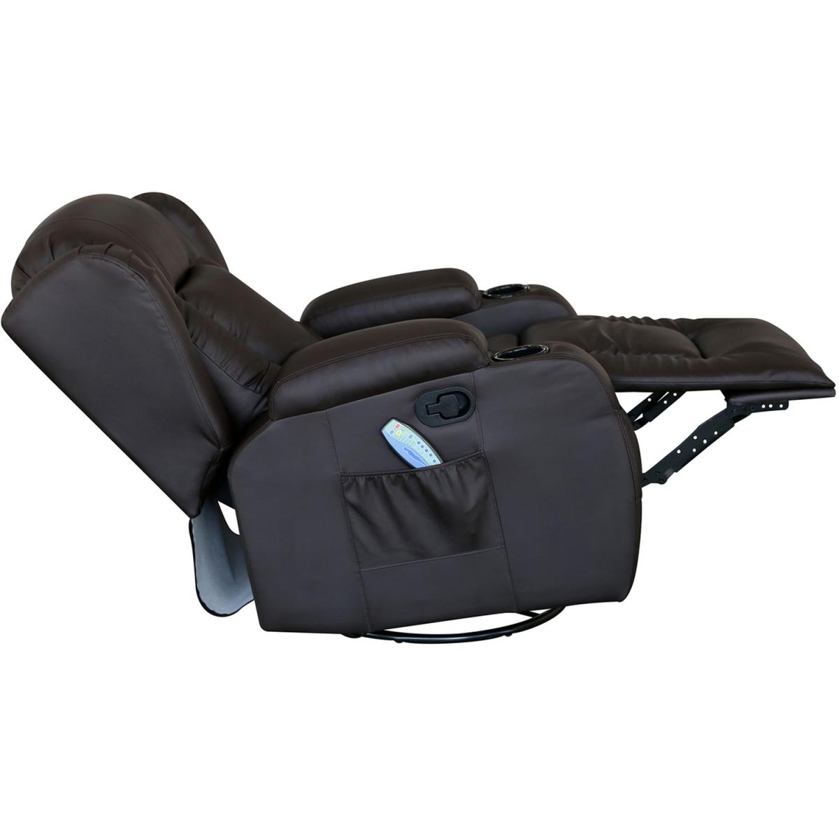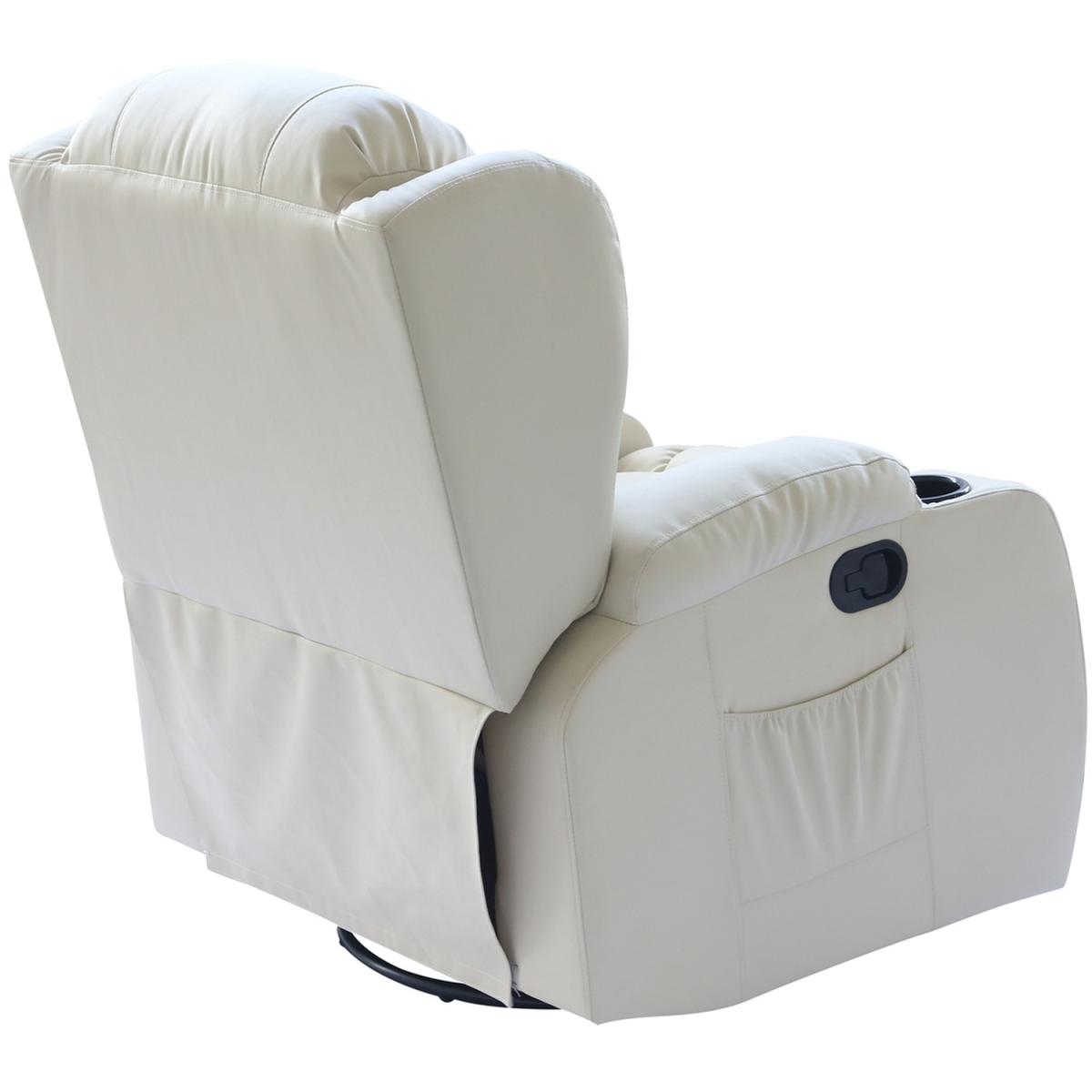 Pull the latch mechanism on the side turn the chair into a recliner and then you can apply the massage and heat just for relaxing or easing aches and pains and helping circulation. Just for fun, the chair is fitted with a cup/bottle holder in each arm. Easy to operate. Fully faced with thick bonded leather on the backrest and the seat. We do not use cheap PU or PVC (plastics) on the face of our chair. 9 in 1 features: recliner, rocker, massage, 360-degree swivel, heated seat, winged backrest for head and neck support, left-hand drink holder, right-hand drink holder, side storage pockets.