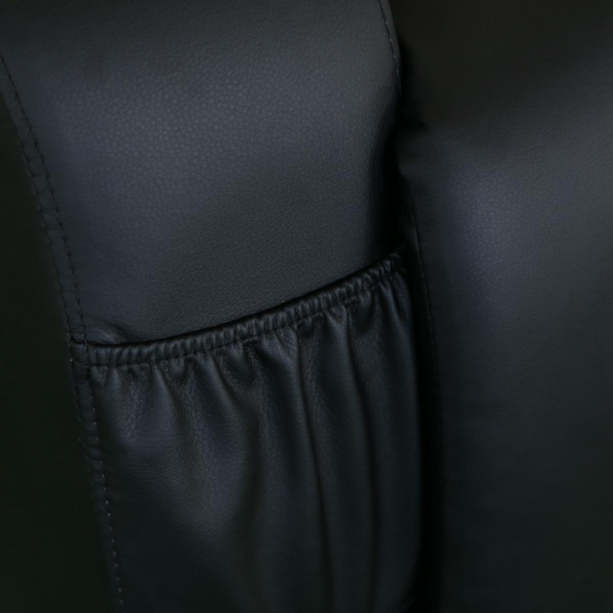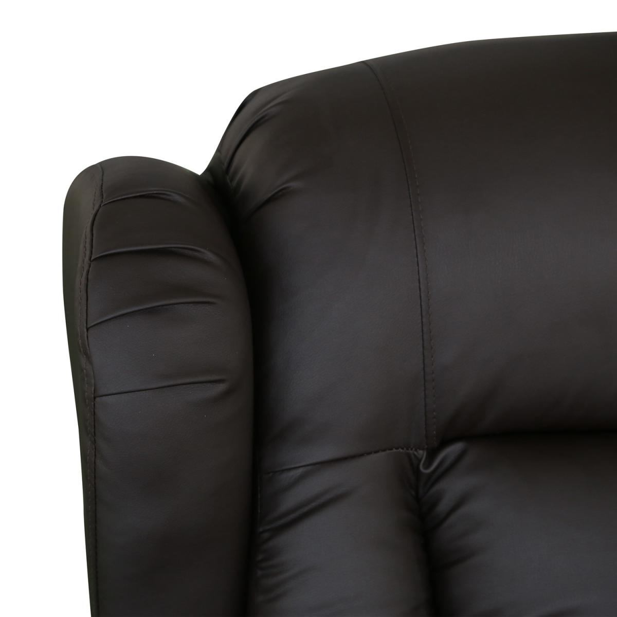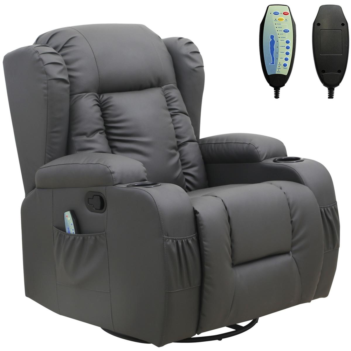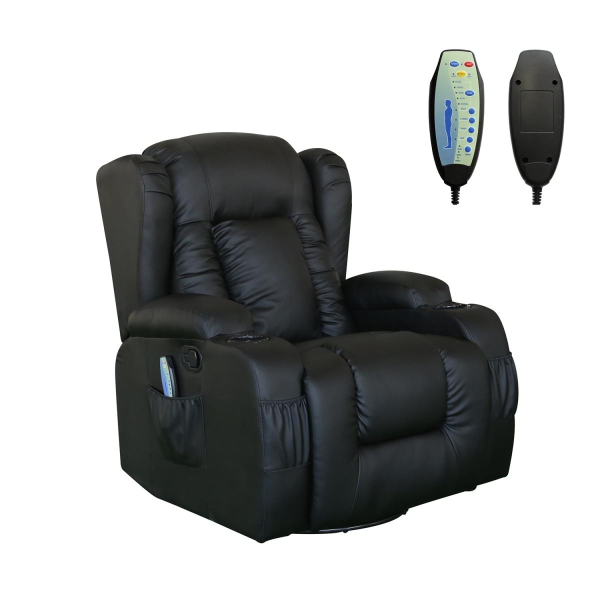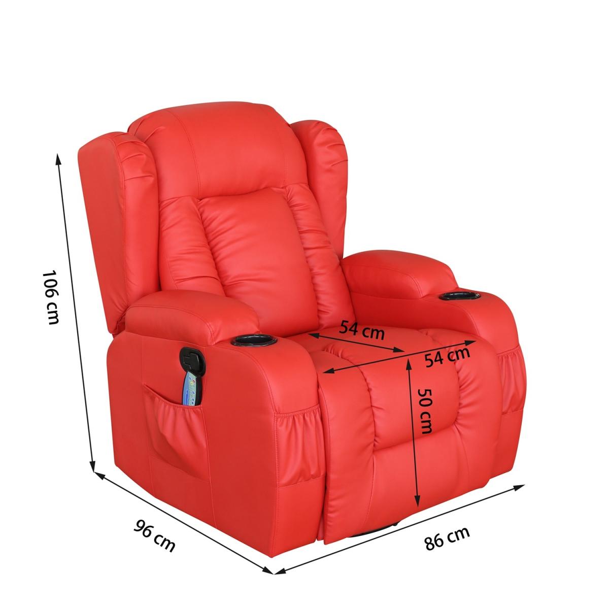 Pull the latch mechanism on the side turn the chair into a recliner and then you can apply the massage and heat just for relaxing or easing aches and pains and helping circulation. Just for fun, the chair is fitted with a cup/bottle holder in each arm. Easy to operate. Fully faced with thick bonded leather on the backrest and the seat. We do not use cheap PU or PVC (plastics) on the face of our chair. 9 in 1 features: recliner, rocker, massage, 360-degree swivel, heated seat, winged backrest for head and neck support, left-hand drink holder, right-hand drink holder, side storage pockets.