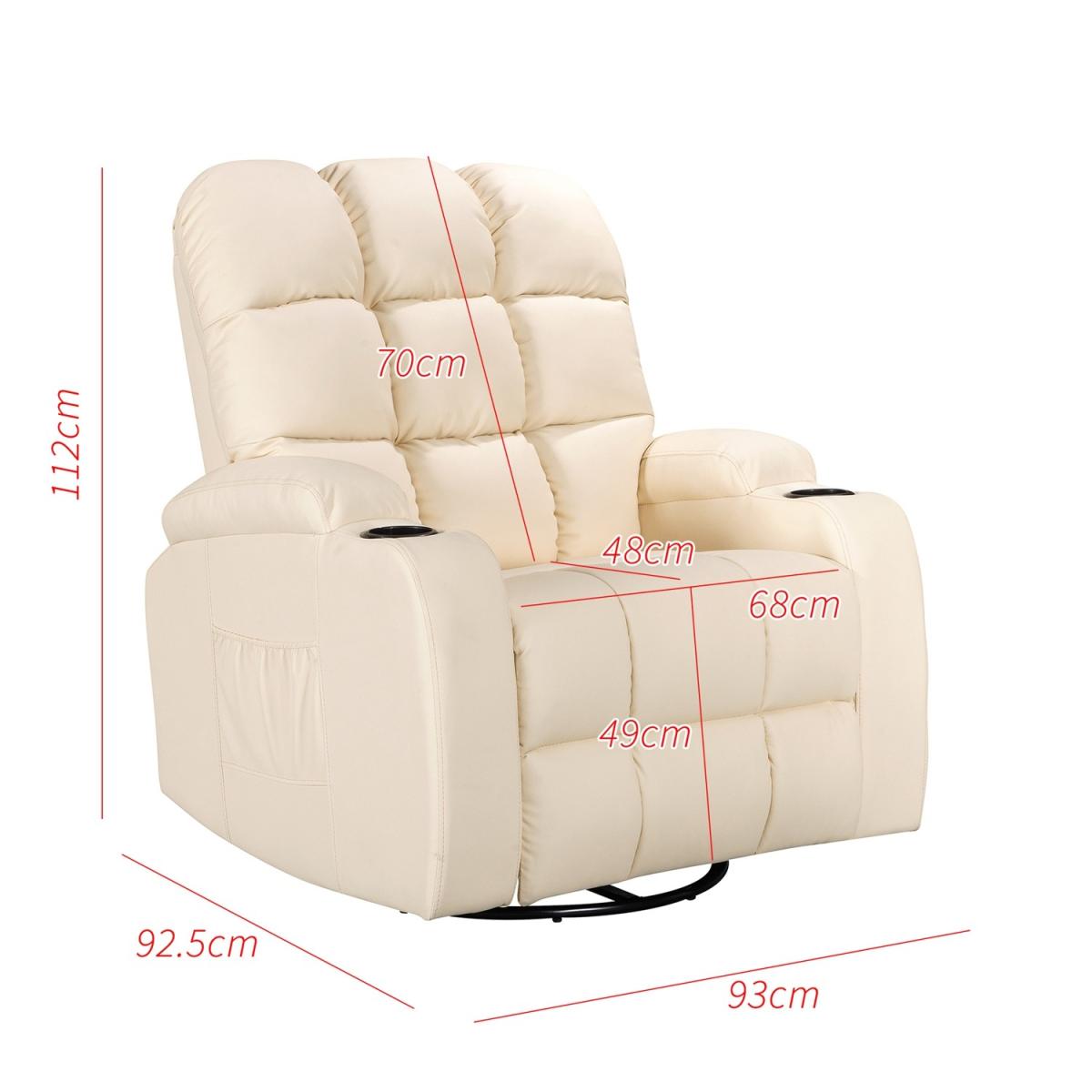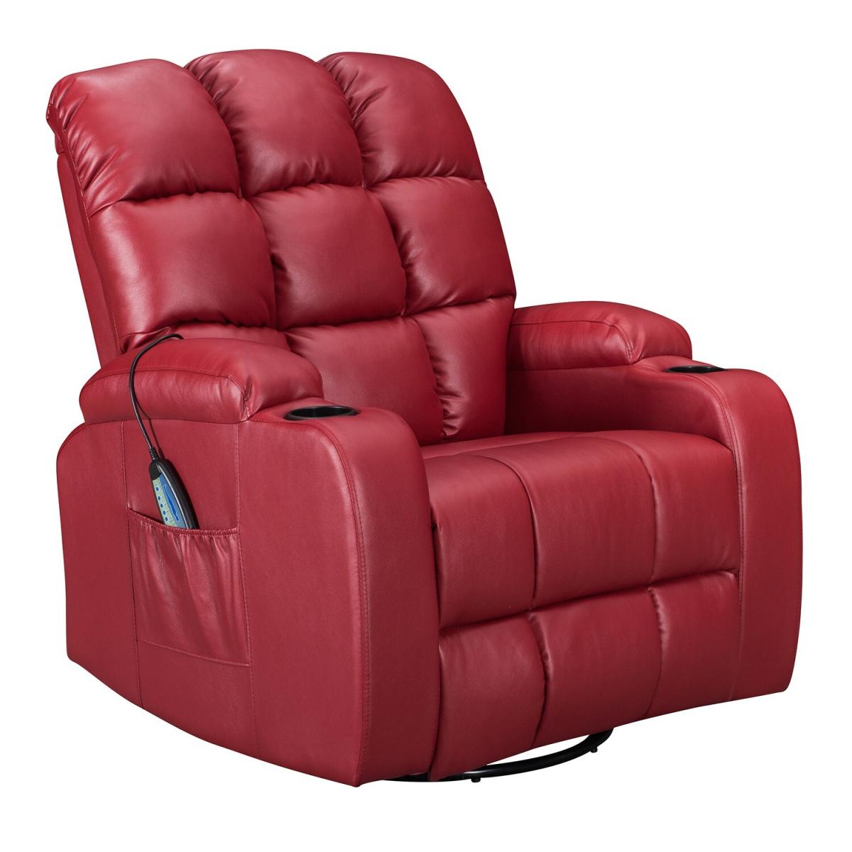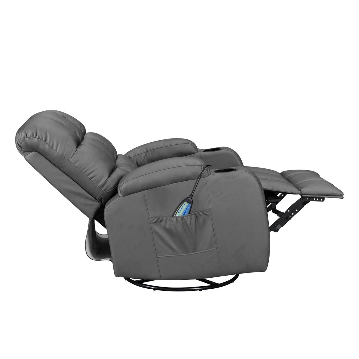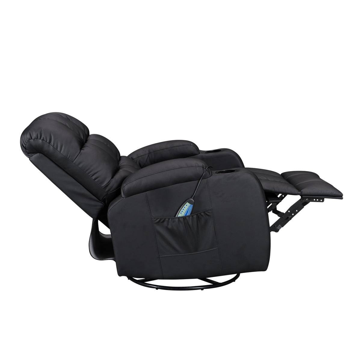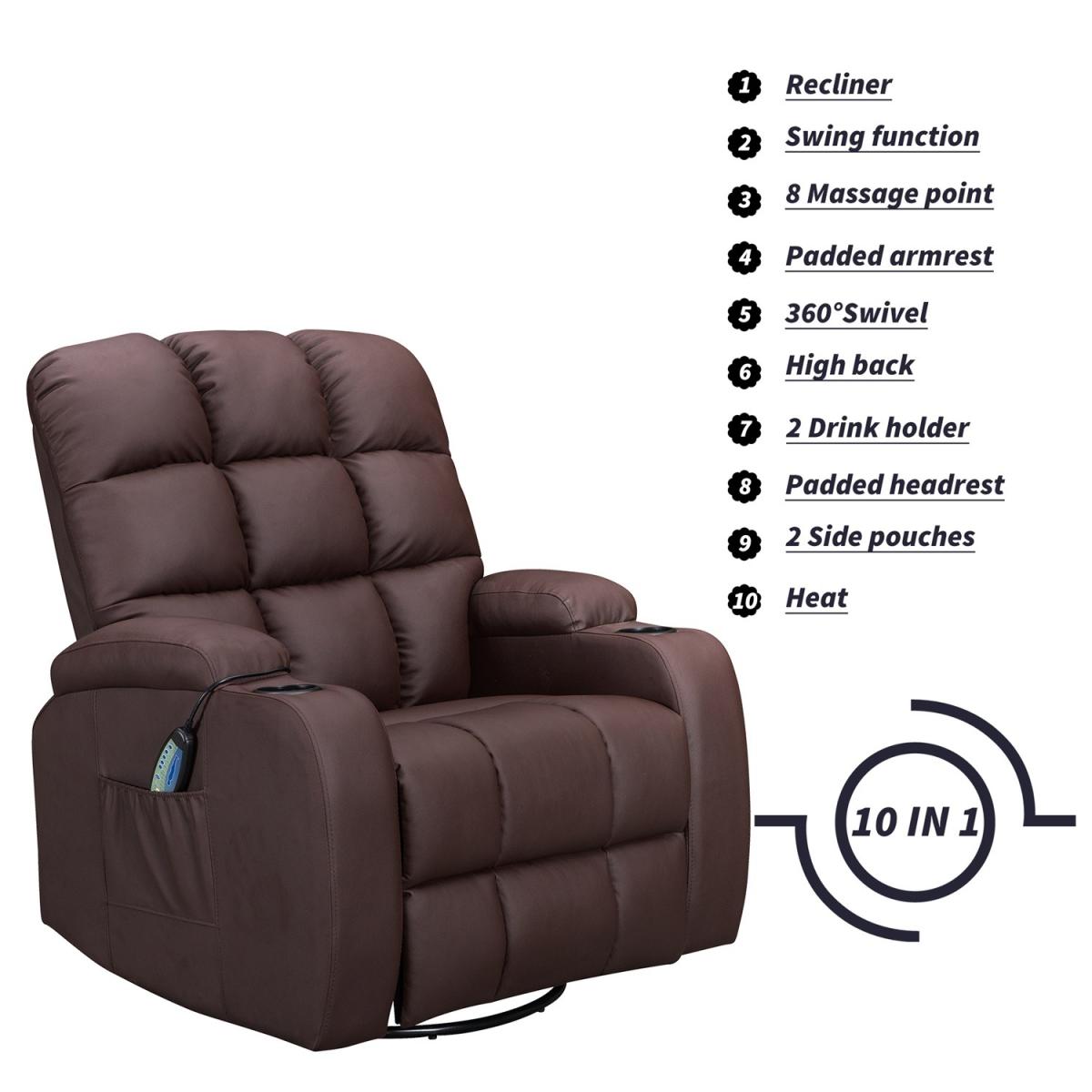 Pull the latch mechanism on the side turn the chair into a recliner and then you can apply the massage and heat just for relaxing or easing aches and pains and helping circulation. Additional functions are a 360-degree swivel and a backwards and forwards rocking action. Just for fun, the chair is fitted with a cup/bottle holder in each arm. Two side pockets have been added for storage (Remote control or magazines). 10 in 1 features: recliner, swing function, 8 point massage, padded armrest, 360-degree swivel, high back, 2 drink holder, padded headrest, 2 side storage pockets, heat function.