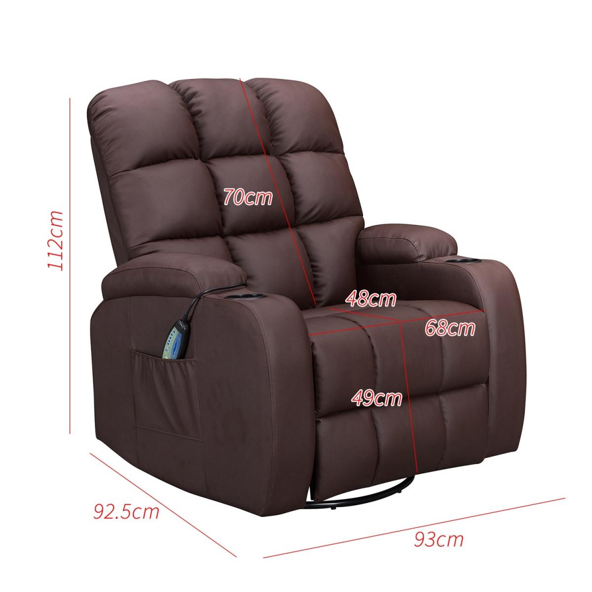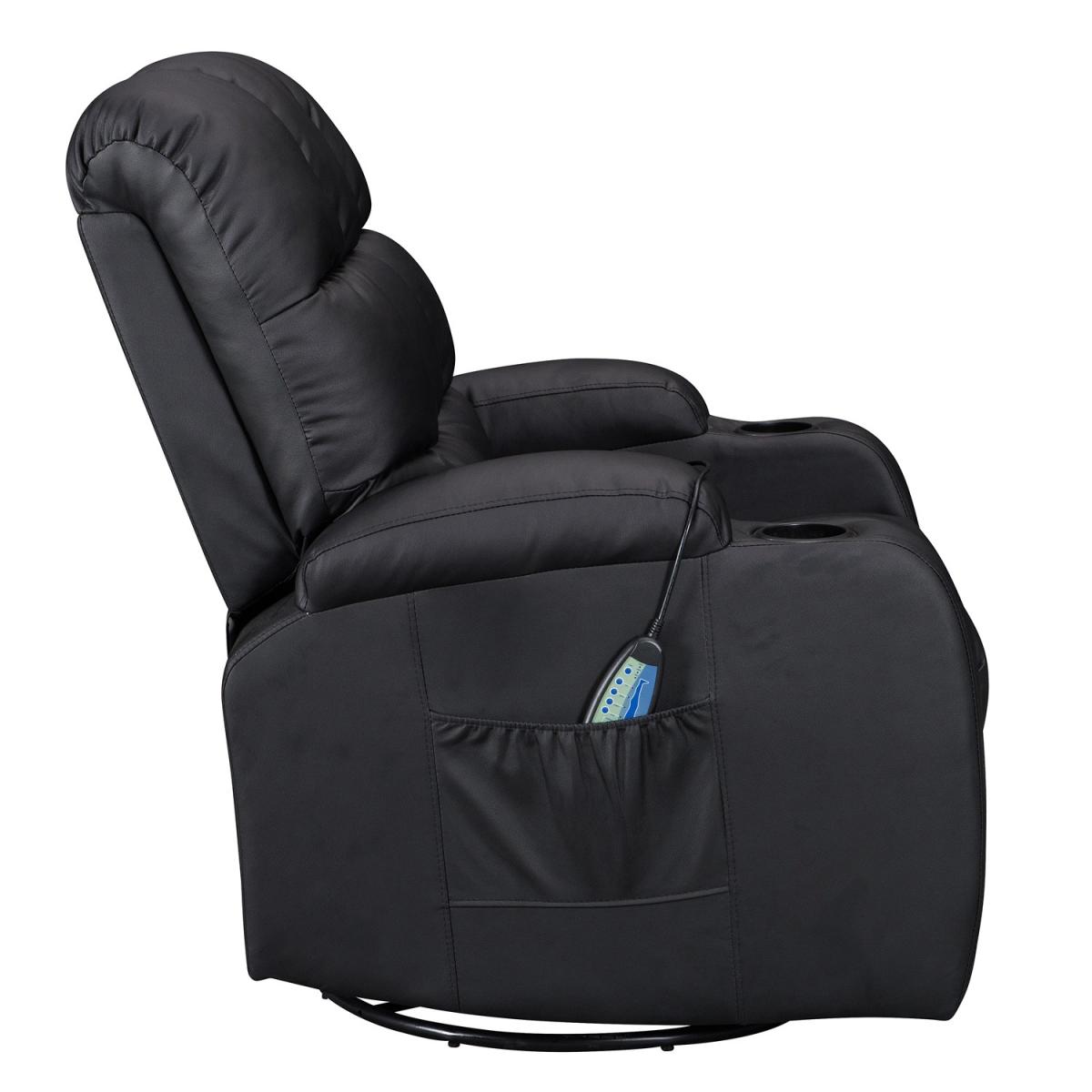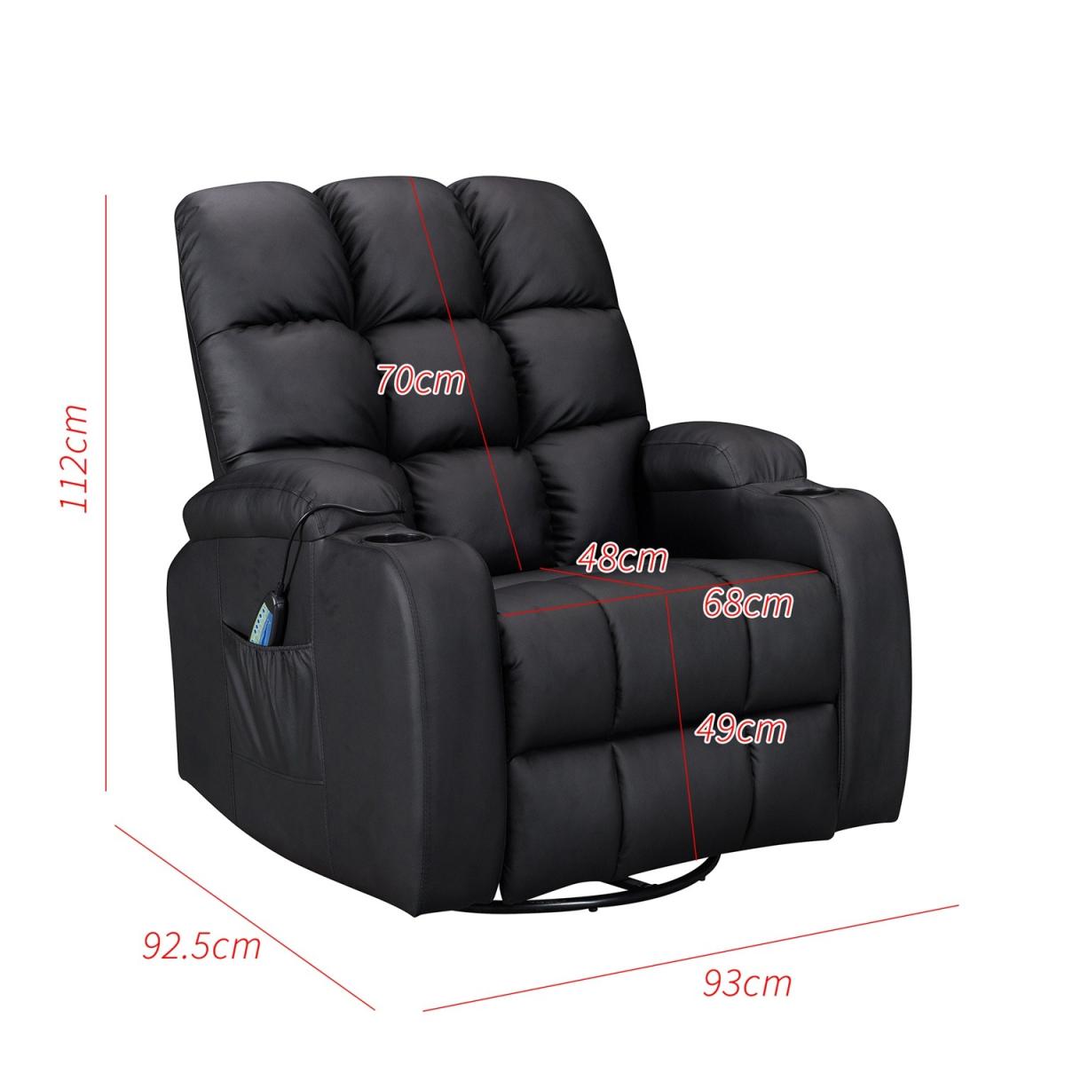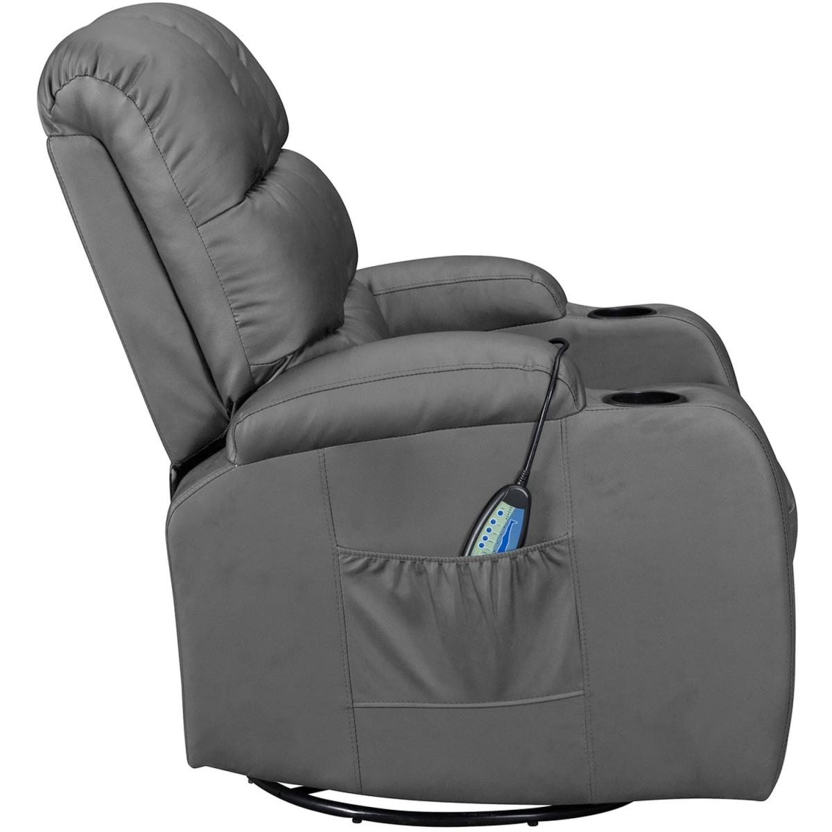Pull the latch mechanism on the side turn the chair into a recliner and then you can apply the massage and heat just for relaxing or easing aches and pains and helping circulation. Additional functions are a 360-degree swivel and a backwards and forwards rocking action. Just for fun, the chair is fitted with a cup/bottle holder in each arm. Two side pockets have been added for storage (Remote control or magazines). 10 in 1 features: recliner, swing function, 8 point massage, padded armrest, 360-degree swivel, high back, 2 drink holder, padded headrest, 2 side storage pockets, heat function.