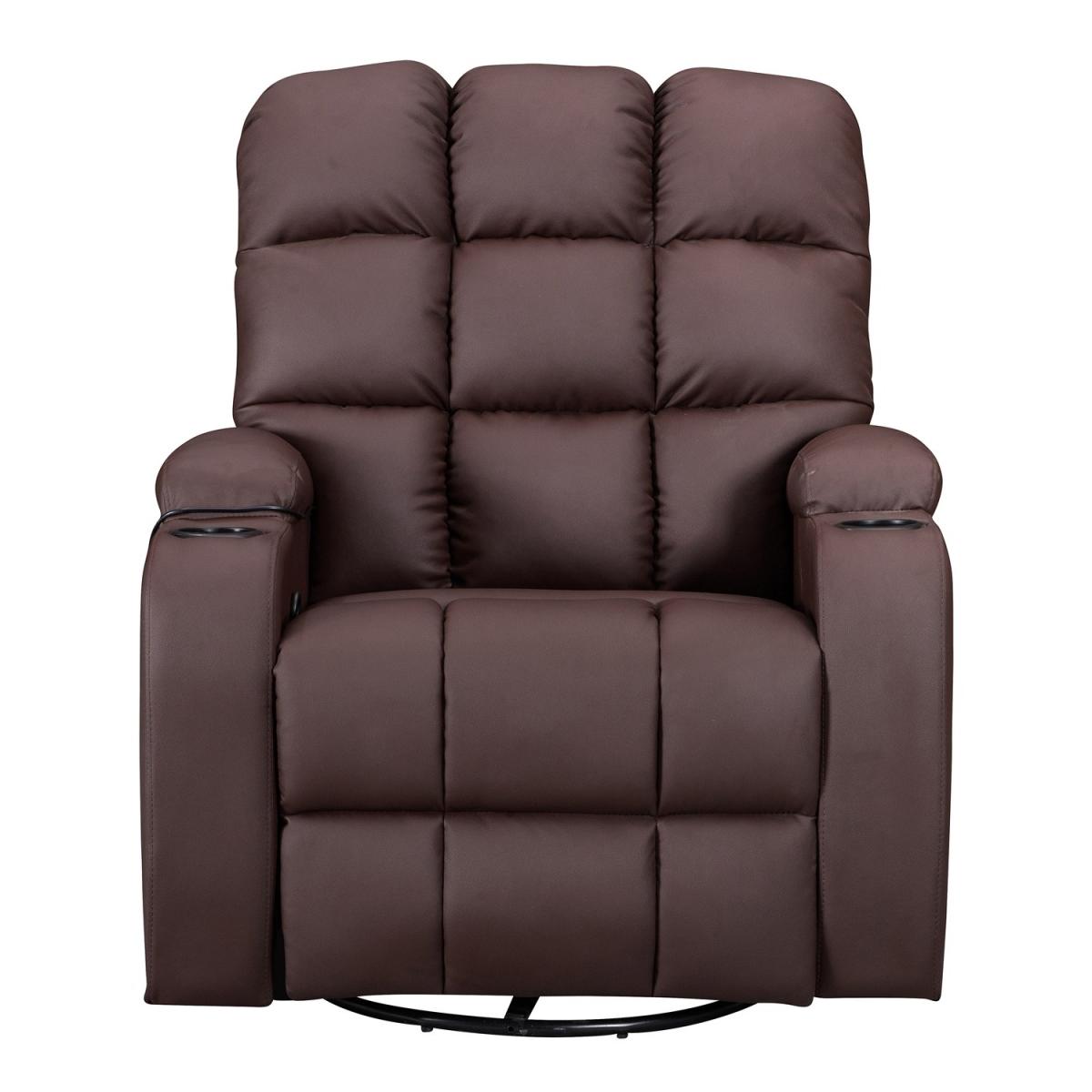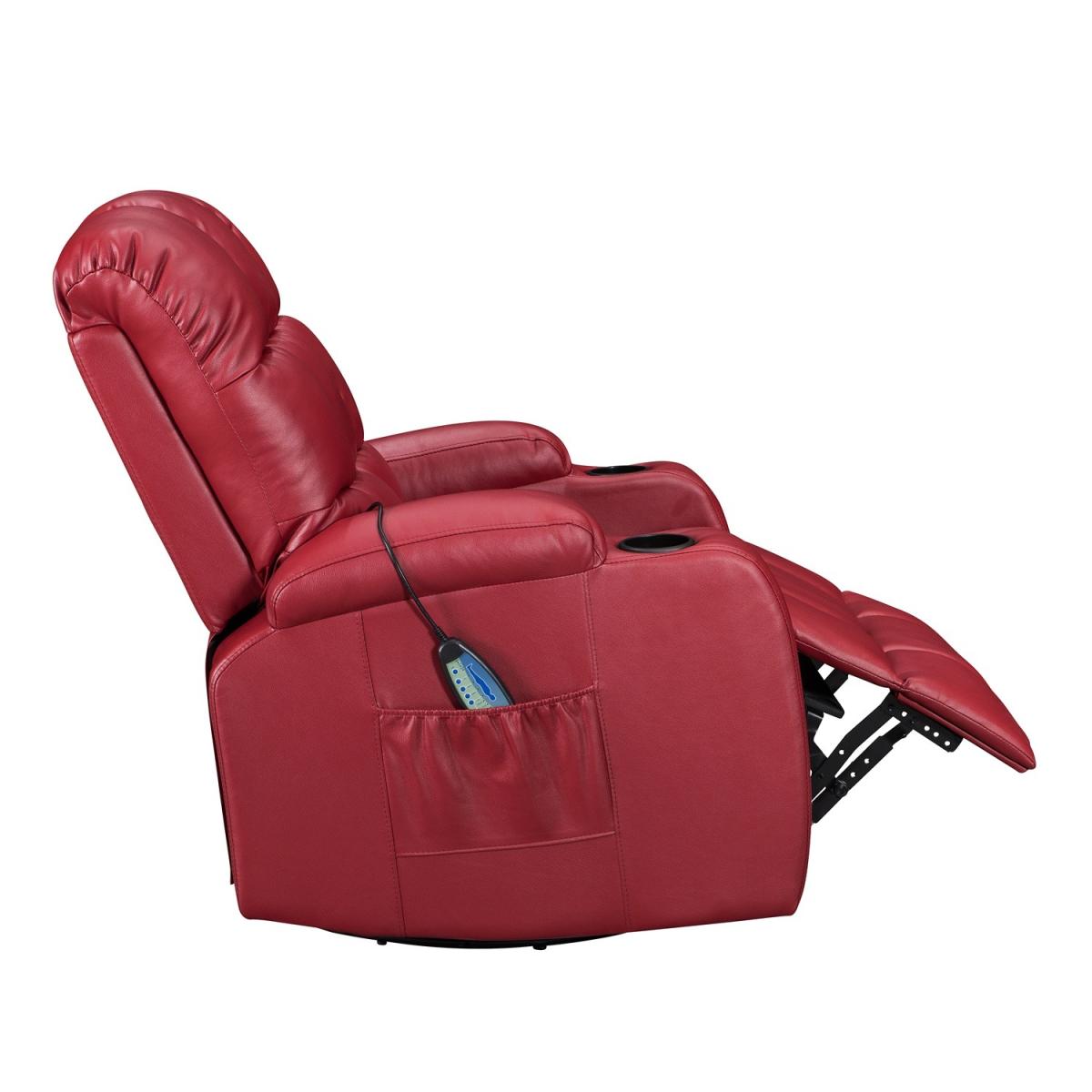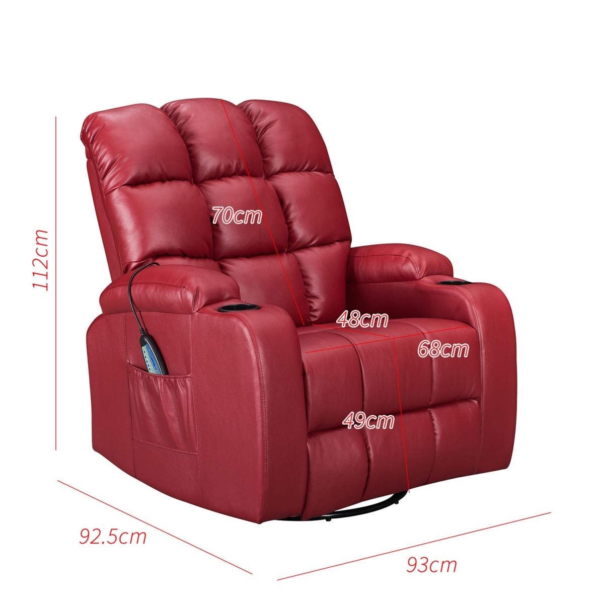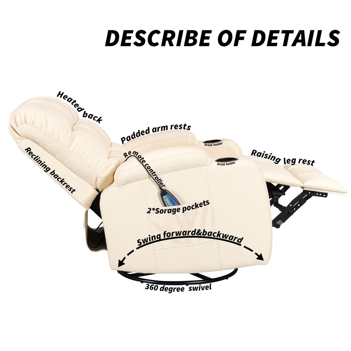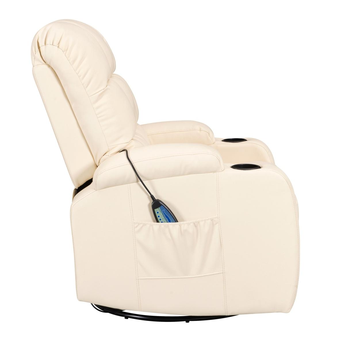 Pull the latch mechanism on the side turn the chair into a recliner and then you can apply the massage and heat just for relaxing or easing aches and pains and helping circulation. Additional functions are a 360-degree swivel and a backwards and forwards rocking action. Just for fun, the chair is fitted with a cup/bottle holder in each arm. Two side pockets have been added for storage (Remote control or magazines). 10 in 1 features: recliner, swing function, 8 point massage, padded armrest, 360-degree swivel, high back, 2 drink holder, padded headrest, 2 side storage pockets, heat function.