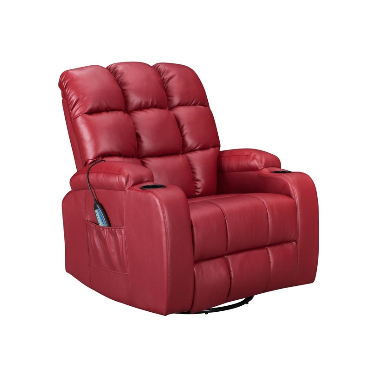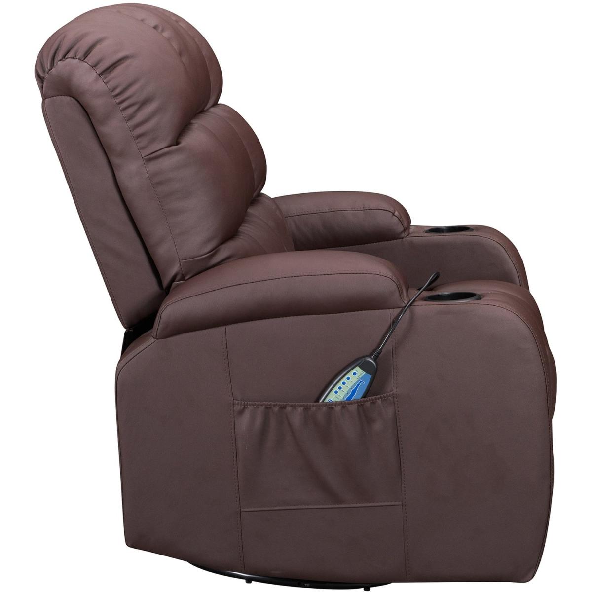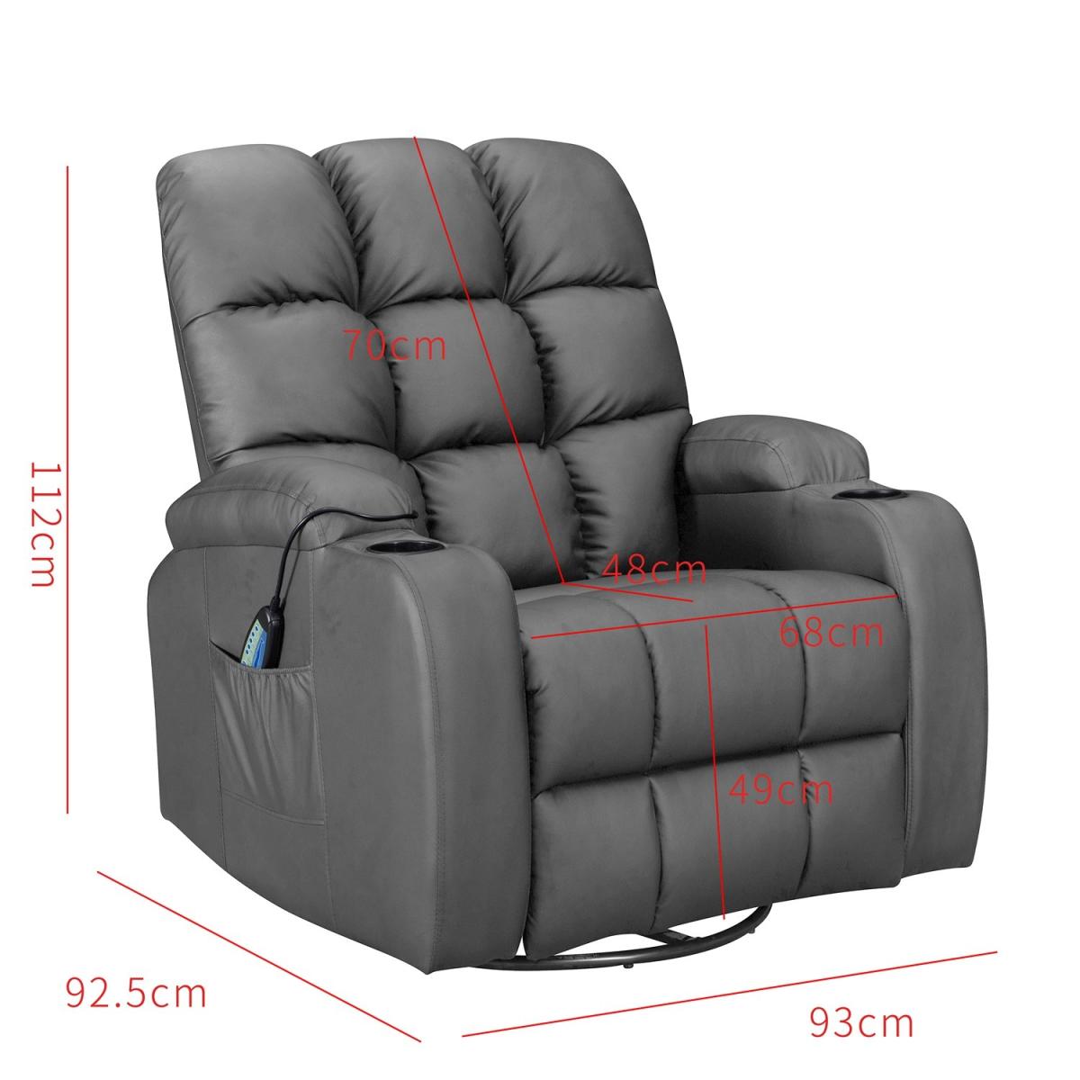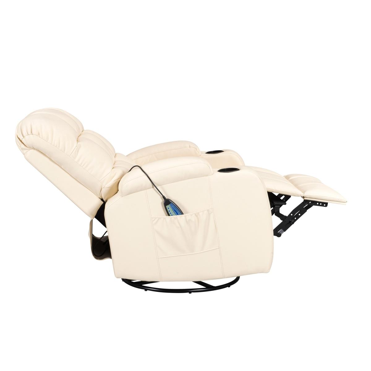 Pull the latch mechanism on the side turn the chair into a recliner and then you can apply the massage and heat just for relaxing or easing aches and pains and helping circulation. Additional functions are a 360-degree swivel and a backwards and forwards rocking action. Just for fun, the chair is fitted with a cup/bottle holder in each arm. Two side pockets have been added for storage (Remote control or magazines). 10 in 1 features: recliner, swing function, 8 point massage, padded armrest, 360-degree swivel, high back, 2 drink holder, padded headrest, 2 side storage pockets, heat function.