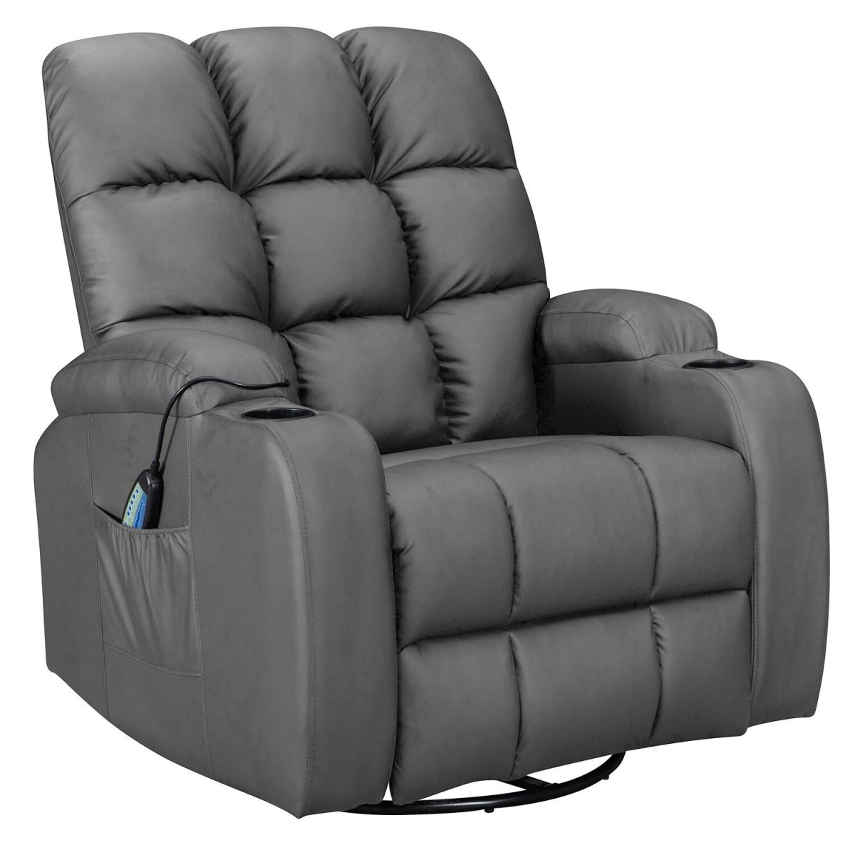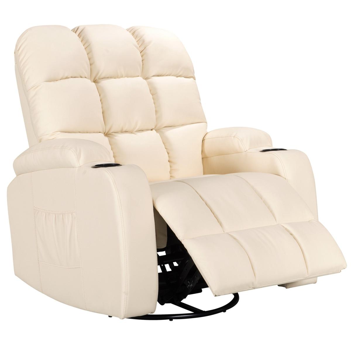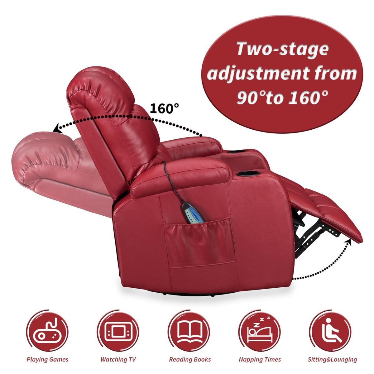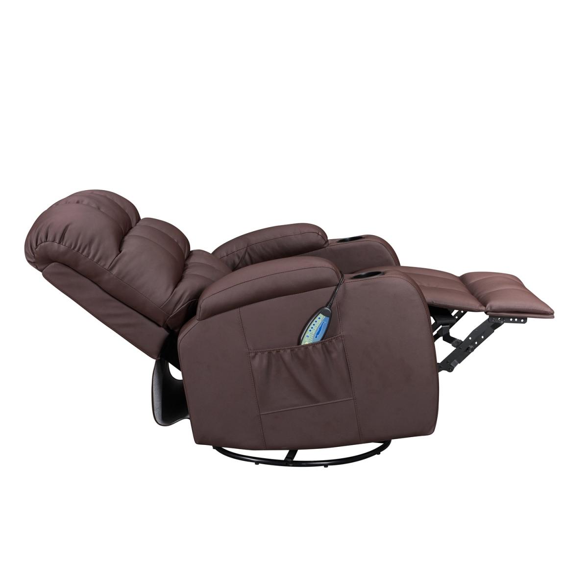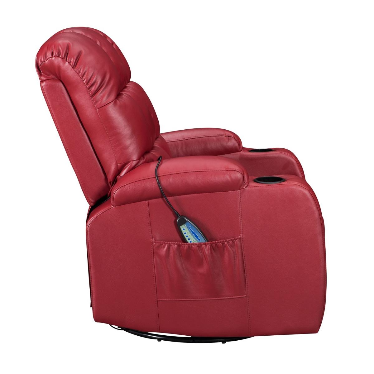 Pull the latch mechanism on the side turn the chair into a recliner and then you can apply the massage and heat just for relaxing or easing aches and pains and helping circulation. Additional functions are a 360-degree swivel and a backwards and forwards rocking action. Just for fun, the chair is fitted with a cup/bottle holder in each arm. Two side pockets have been added for storage (Remote control or magazines). 10 in 1 features: recliner, swing function, 8 point massage, padded armrest, 360-degree swivel, high back, 2 drink holder, padded headrest, 2 side storage pockets, heat function.