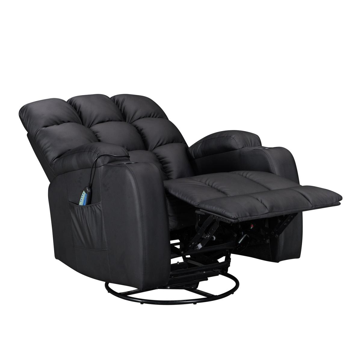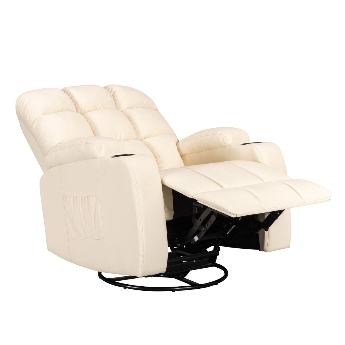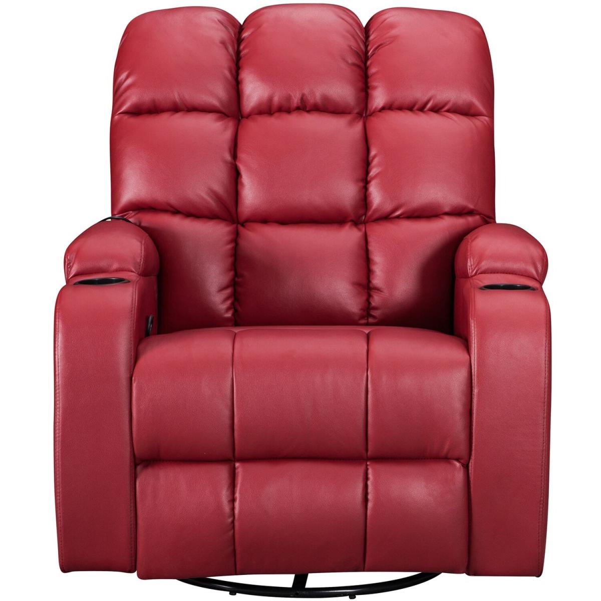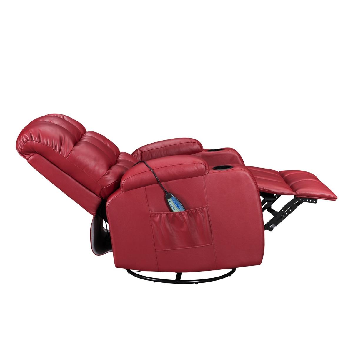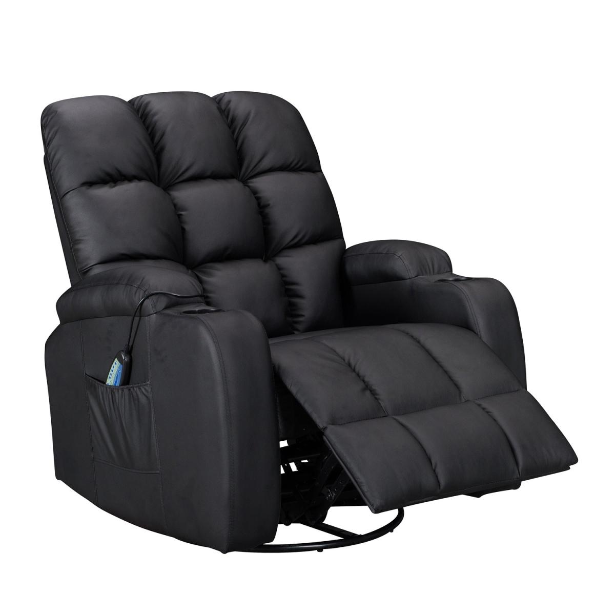 Pull the latch mechanism on the side turn the chair into a recliner and then you can apply the massage and heat just for relaxing or easing aches and pains and helping circulation. Additional functions are a 360-degree swivel and a backwards and forwards rocking action. Just for fun, the chair is fitted with a cup/bottle holder in each arm. Two side pockets have been added for storage (Remote control or magazines). 10 in 1 features: recliner, swing function, 8 point massage, padded armrest, 360-degree swivel, high back, 2 drink holder, padded headrest, 2 side storage pockets, heat function.