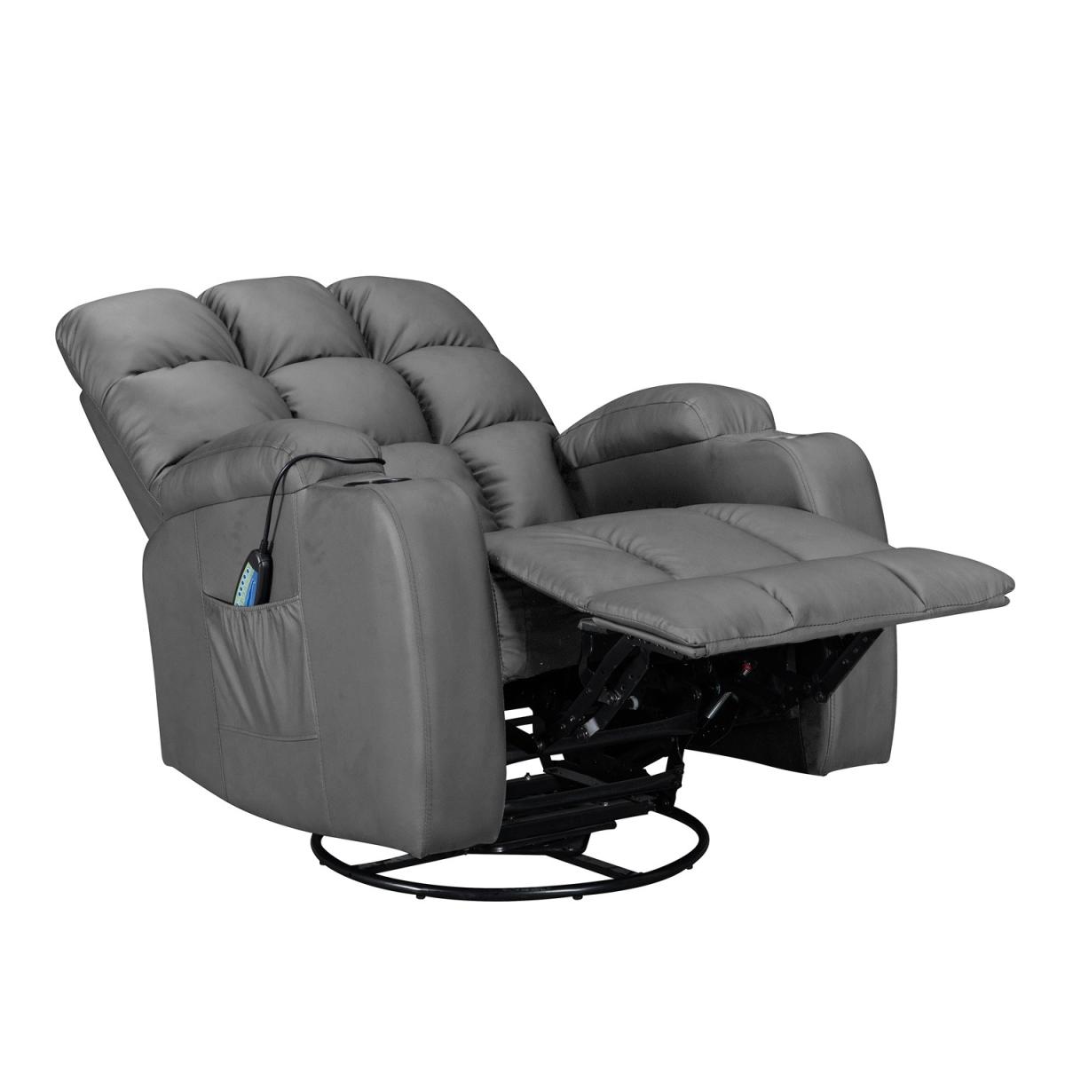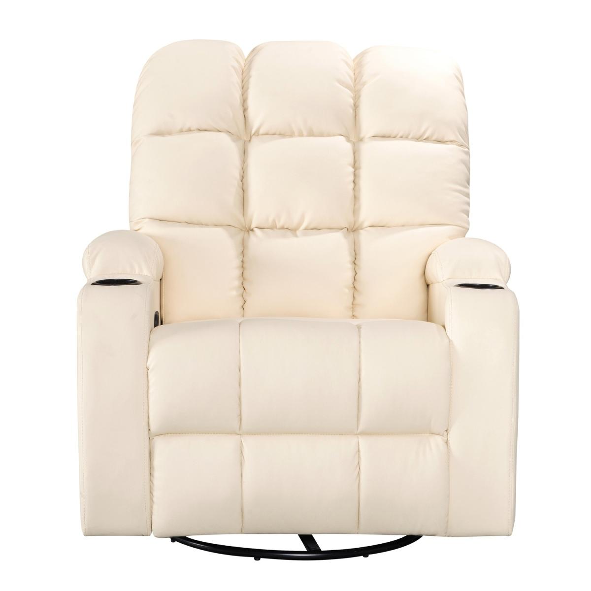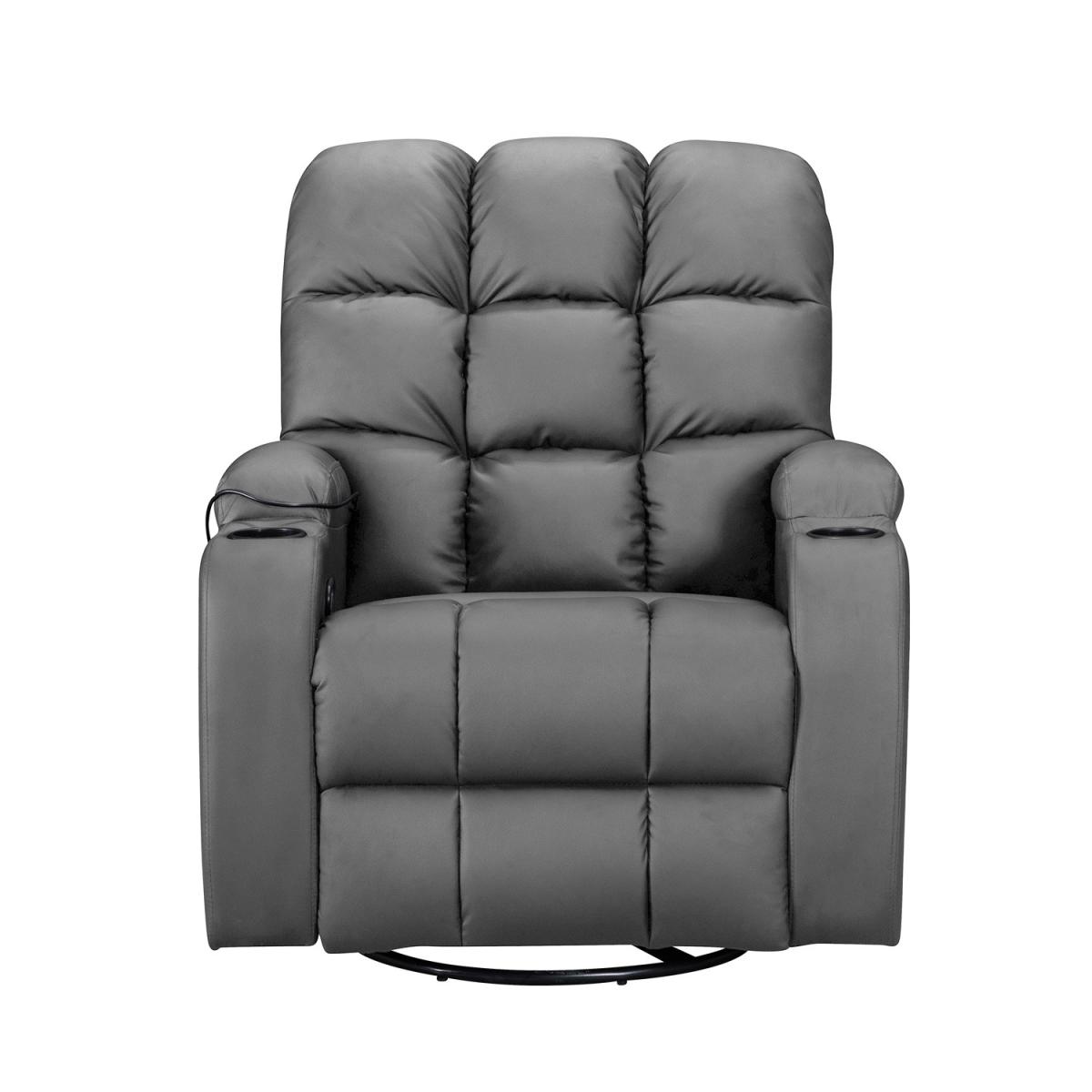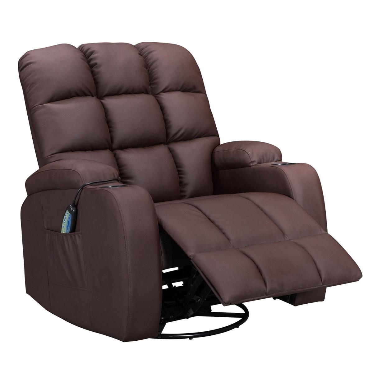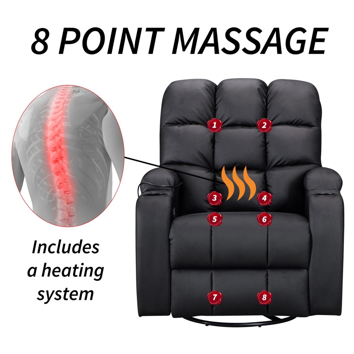 Pull the latch mechanism on the side turn the chair into a recliner and then you can apply the massage and heat just for relaxing or easing aches and pains and helping circulation. Additional functions are a 360-degree swivel and a backwards and forwards rocking action. Just for fun, the chair is fitted with a cup/bottle holder in each arm. Two side pockets have been added for storage (Remote control or magazines). 10 in 1 features: recliner, swing function, 8 point massage, padded armrest, 360-degree swivel, high back, 2 drink holder, padded headrest, 2 side storage pockets, heat function.