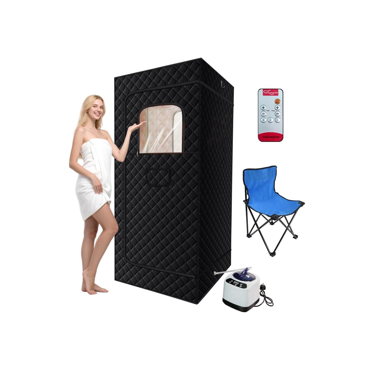 This portable sauna set includes everything you need, a sauna tent, steam generator, folding chair, and remote control. Enjoy a full sauna room experience right at home, no need for extra parts or tools. Just plug in and relax. Enjoy fast heating with a sauna steamer generator delivering 1200W of steam power. Built-in safety auto shut-off activates when water boils dry, making it a smart, safe sauna steamer machine for daily use. Equipped with a user-friendly remote control, this sauna steamer machine features a 99 minute timer, make it easy for you to personalize the sauna experience. Features a transparent window for light and visibility, a side pocket to hold your phone or remote, a hook for hanging towels or clothes, and includes a steam box, silicone tube, floor mat, and foldable chair, everything designed for comfort and convenience inside your steam sauna.