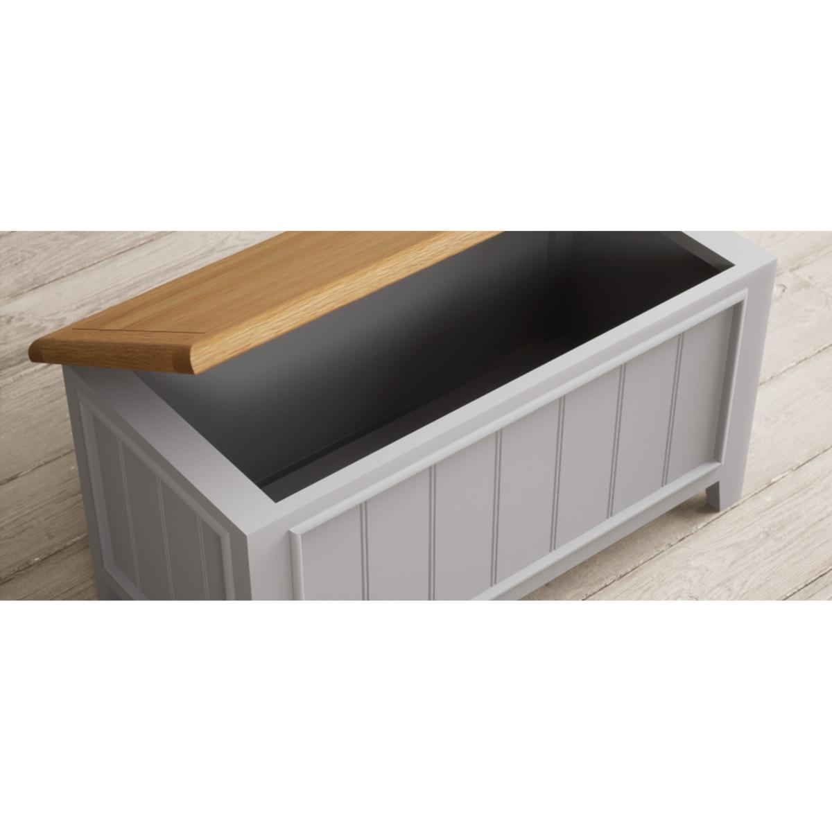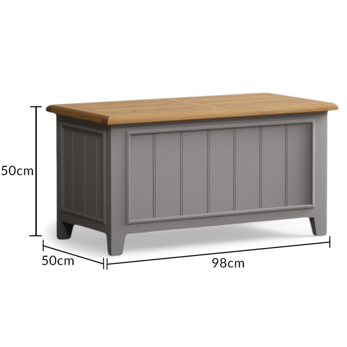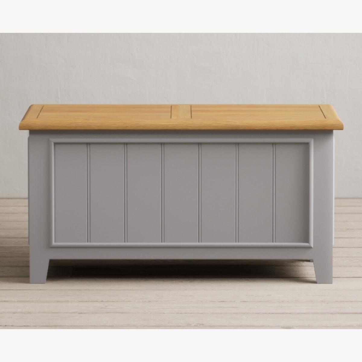 The Weymouth Light Grey Blanket Box features a light grey painted solid hardwood frame with a grey painted finish and panelled design, topped with solid oak for a two-toned look.
