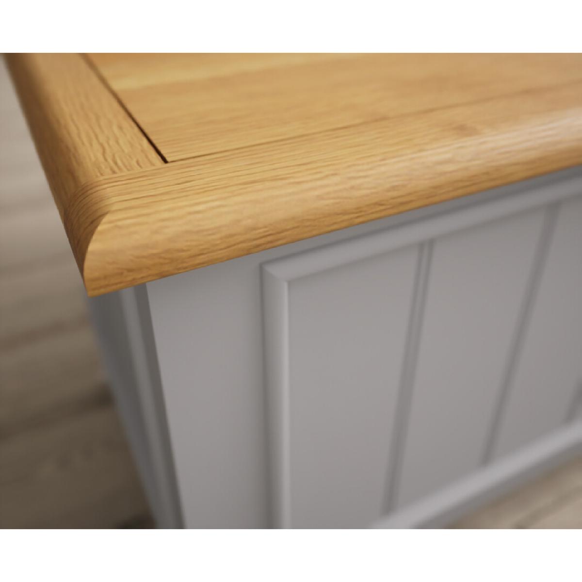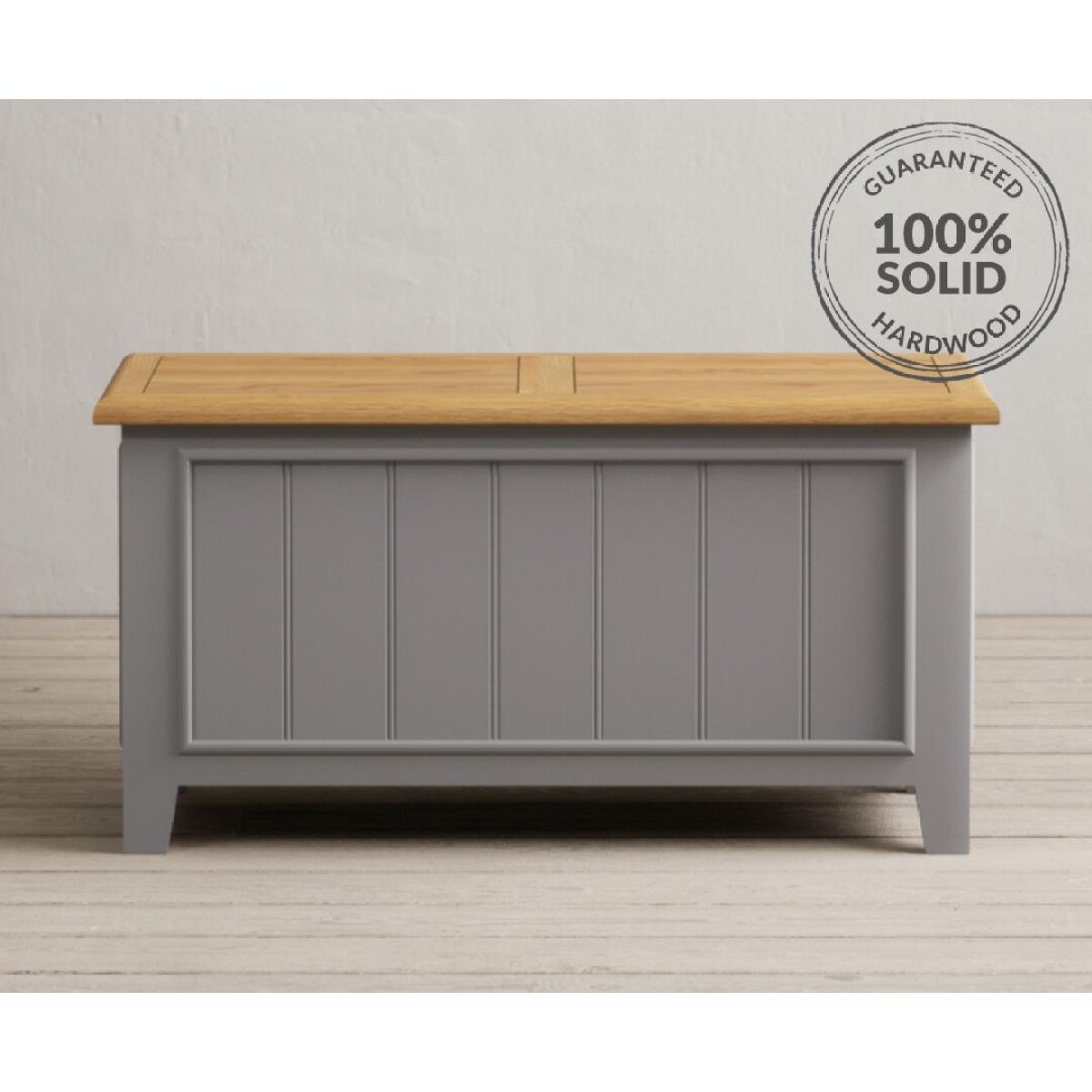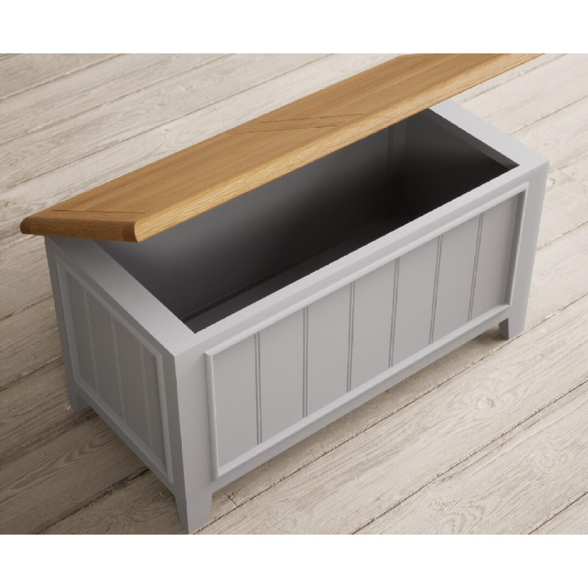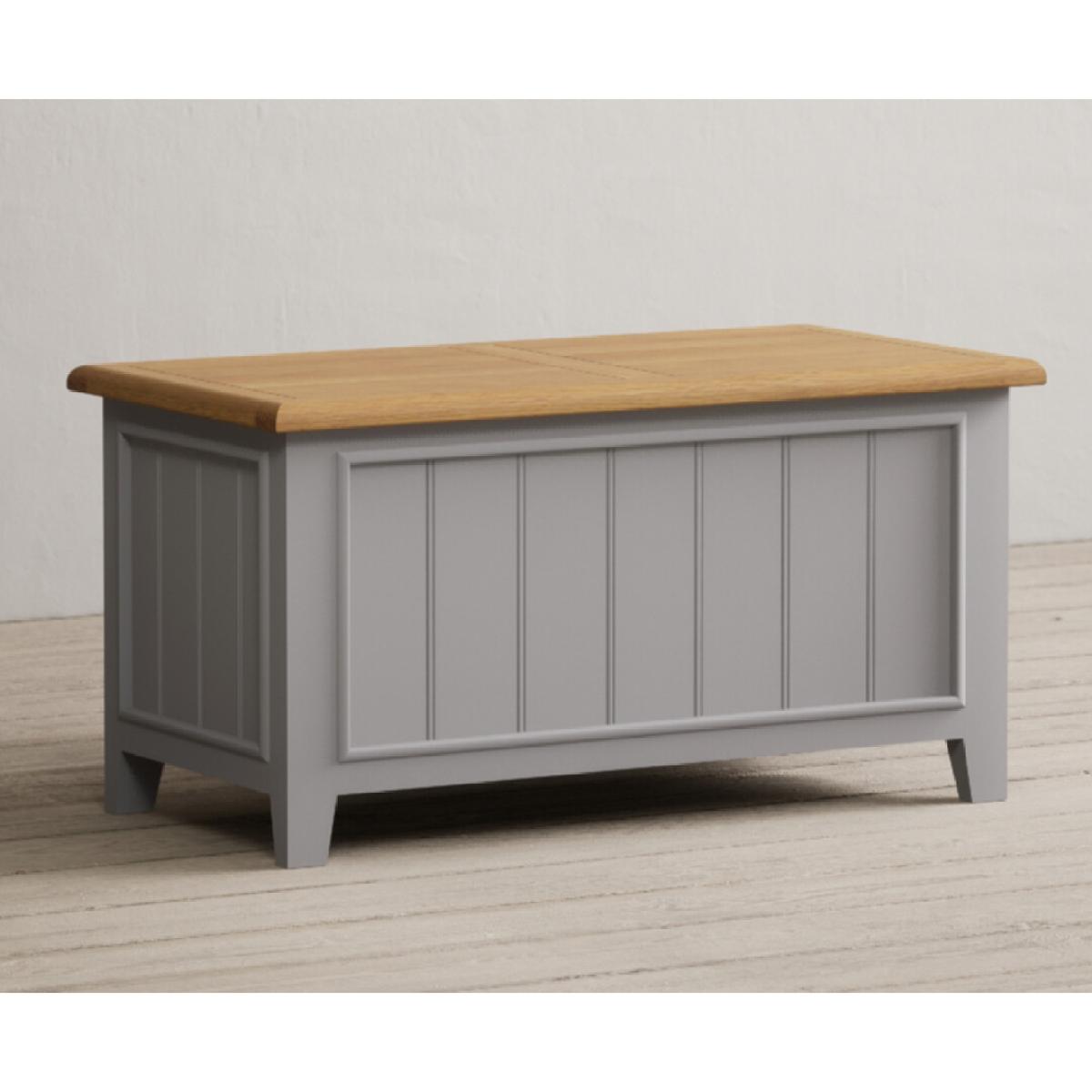 The Weymouth Light Grey Blanket Box features a light grey painted solid hardwood frame with a grey painted finish and panelled design, topped with solid oak for a two-toned look.