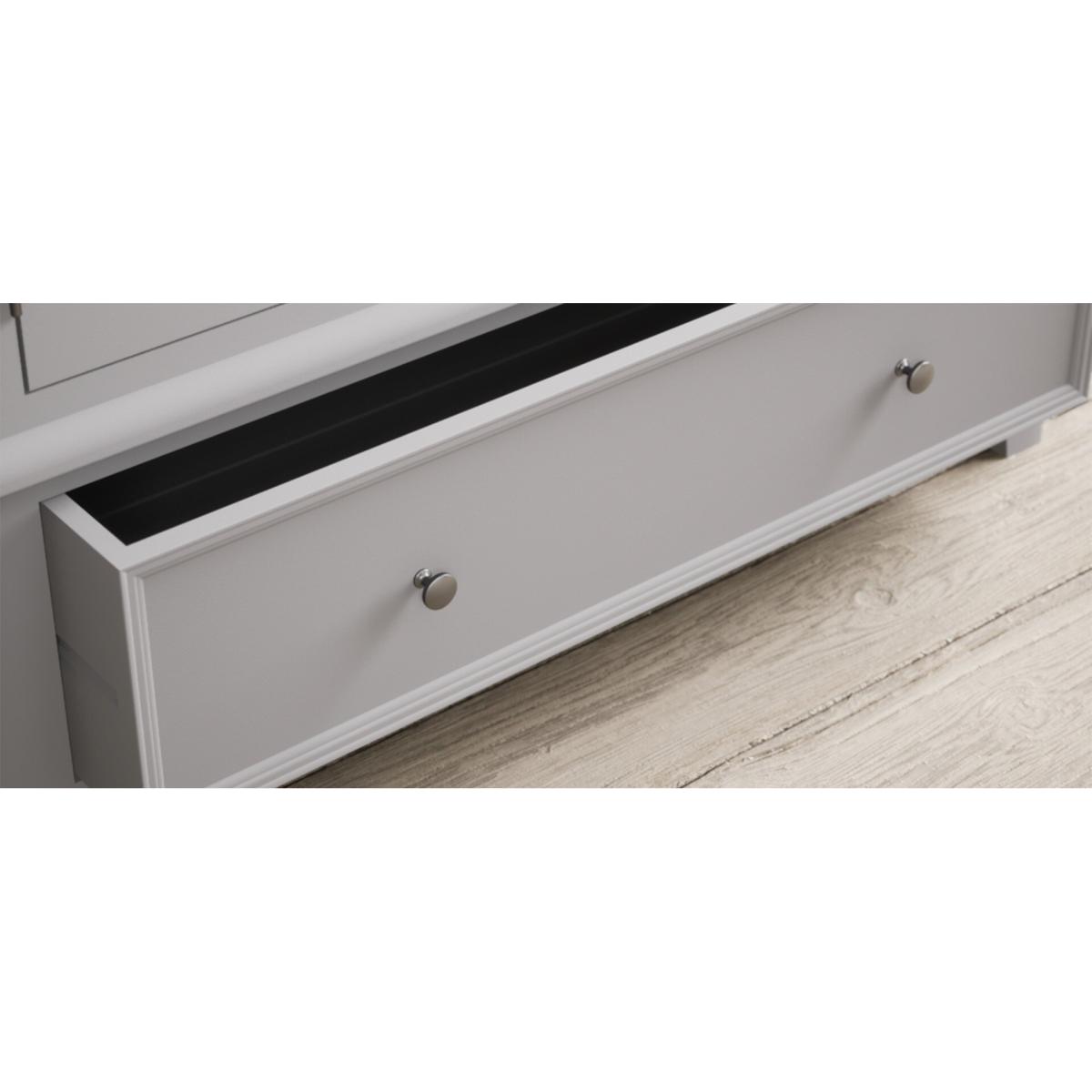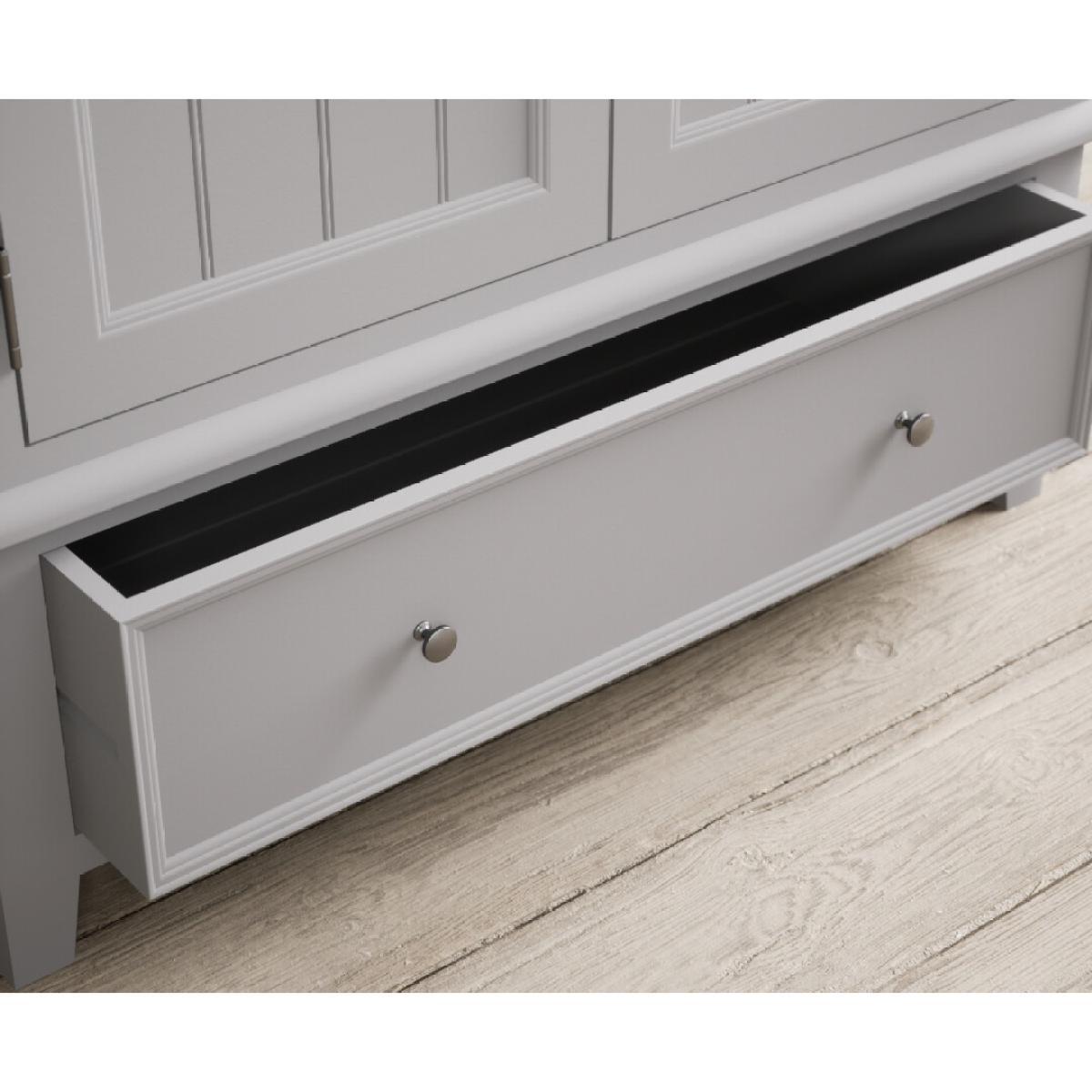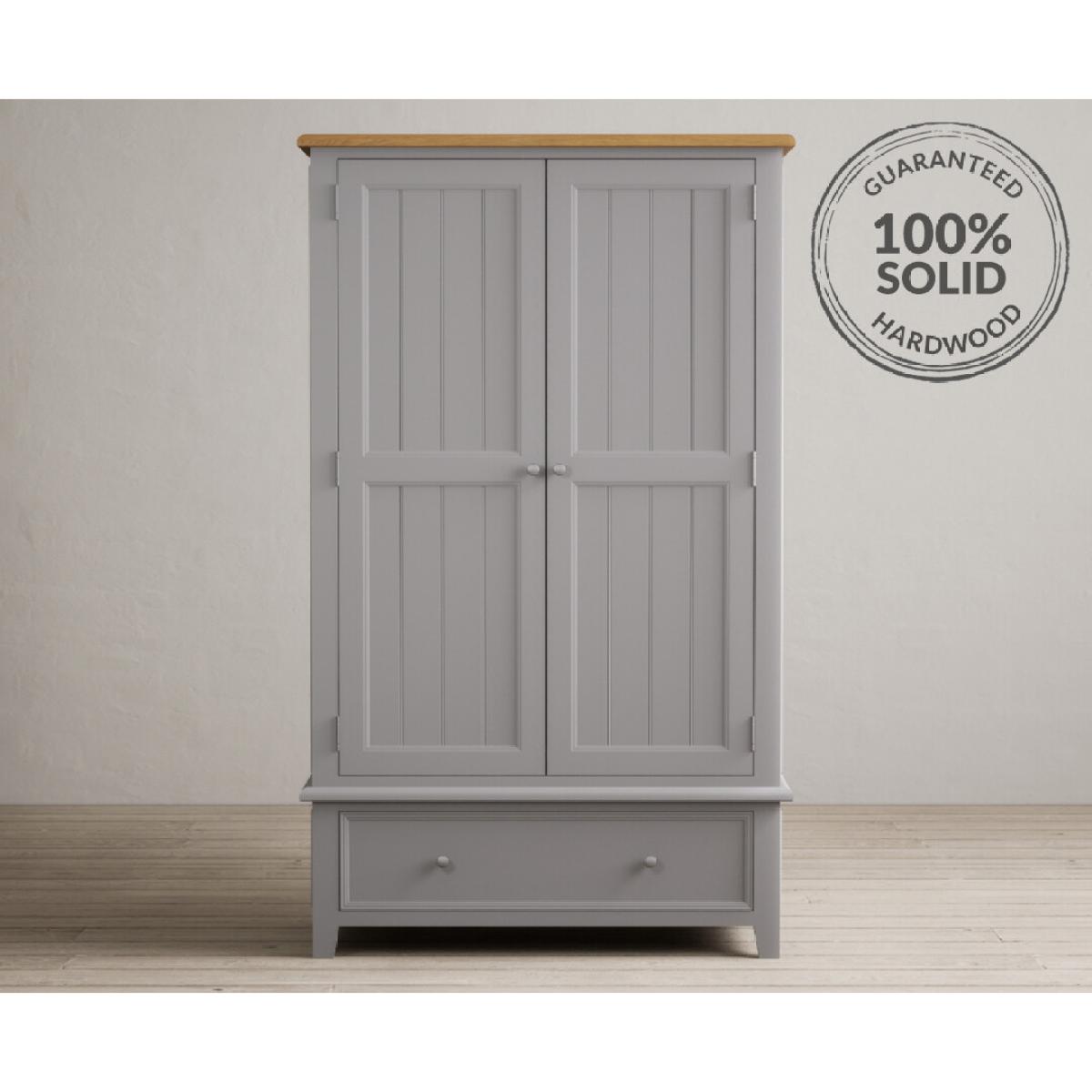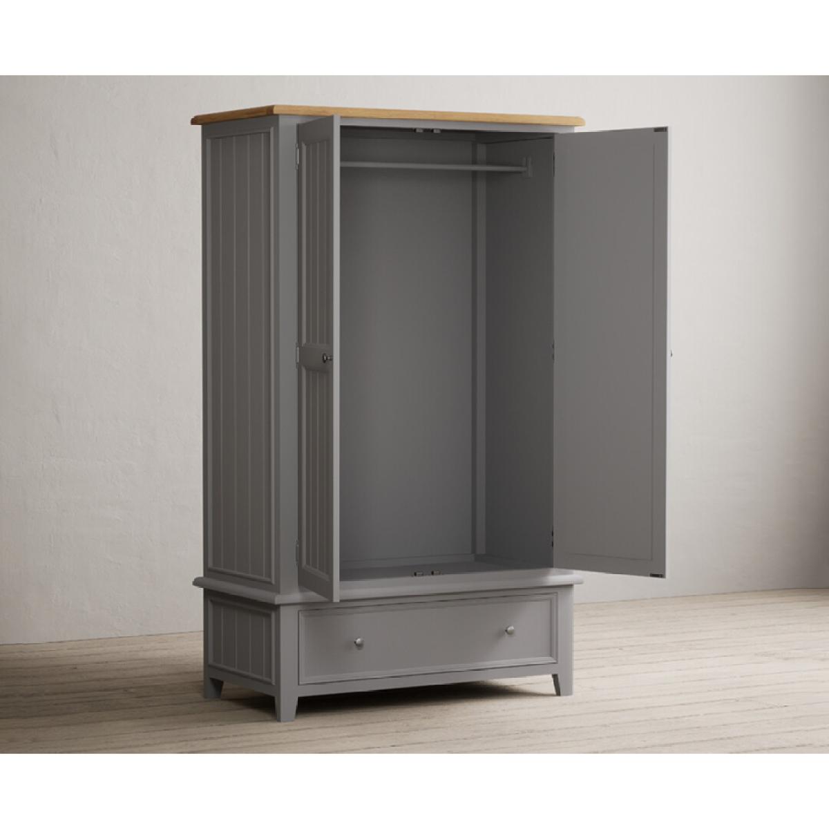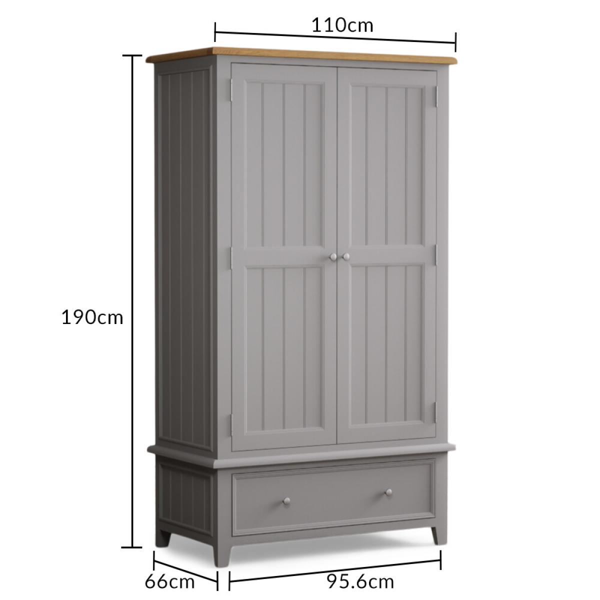 The Weymouth Light Grey Double Wardrobe is crafted from solid hardwood with a light grey painted finish and panelled design, topped with solid oak and complete with a Dovetail drawer.