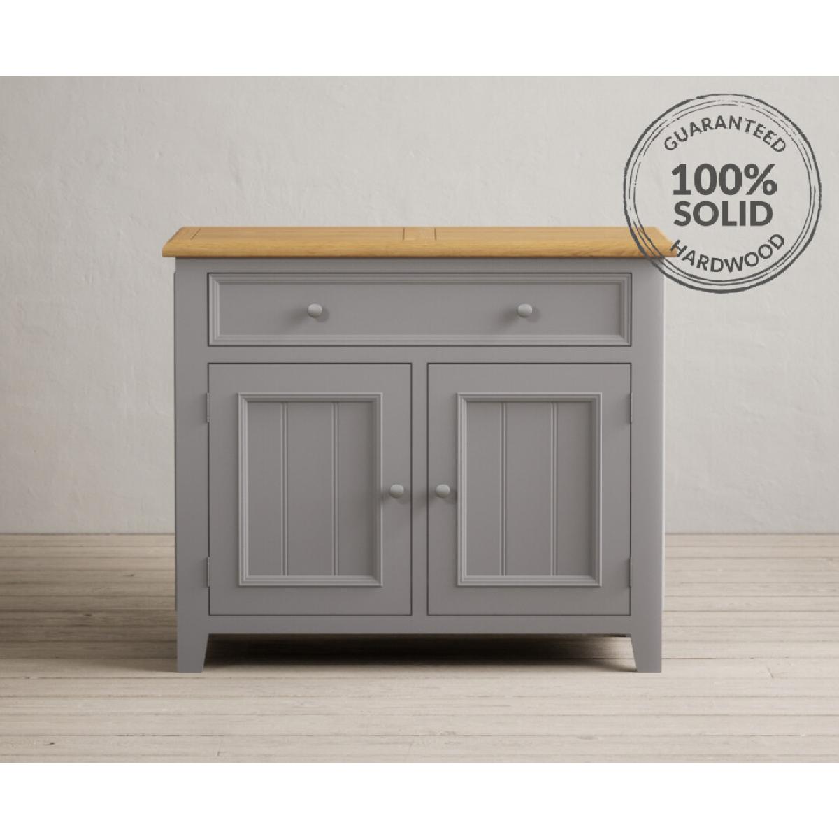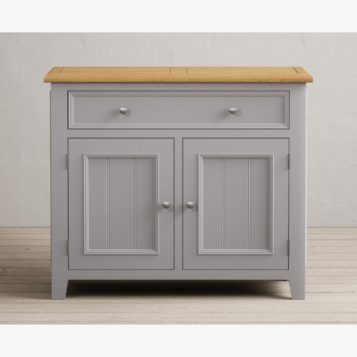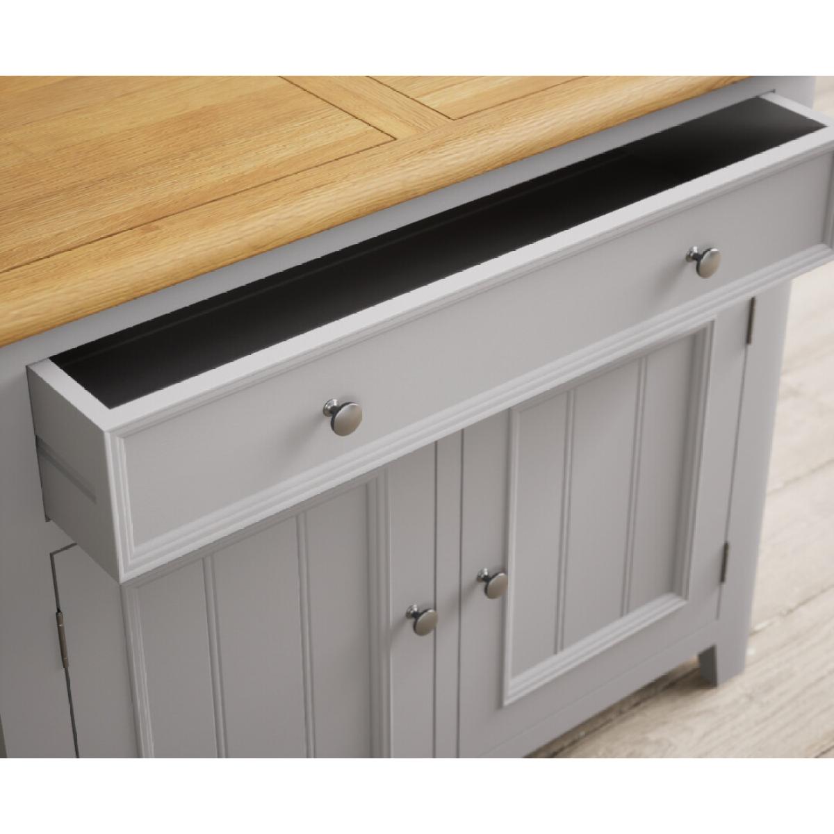 The Weymouth Oak and Light Grey Painted Small Sideboard is crafted from grey painted solid hardwood and topped with 100% solid oak, complete with a two-door cupboard and a Dovetail drawer.