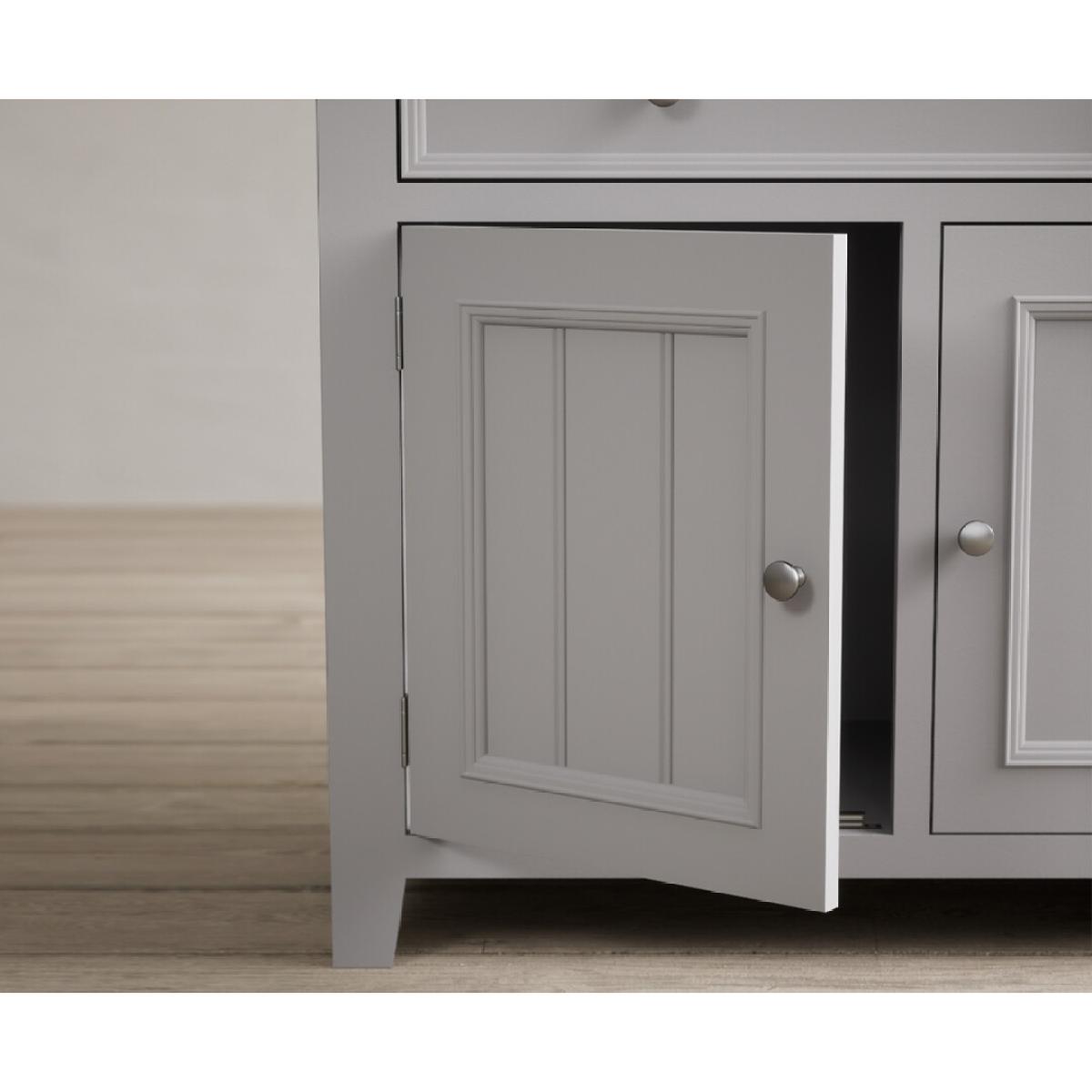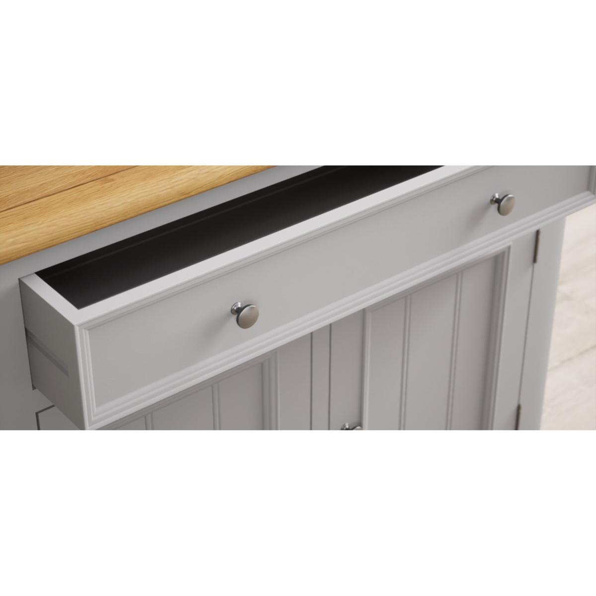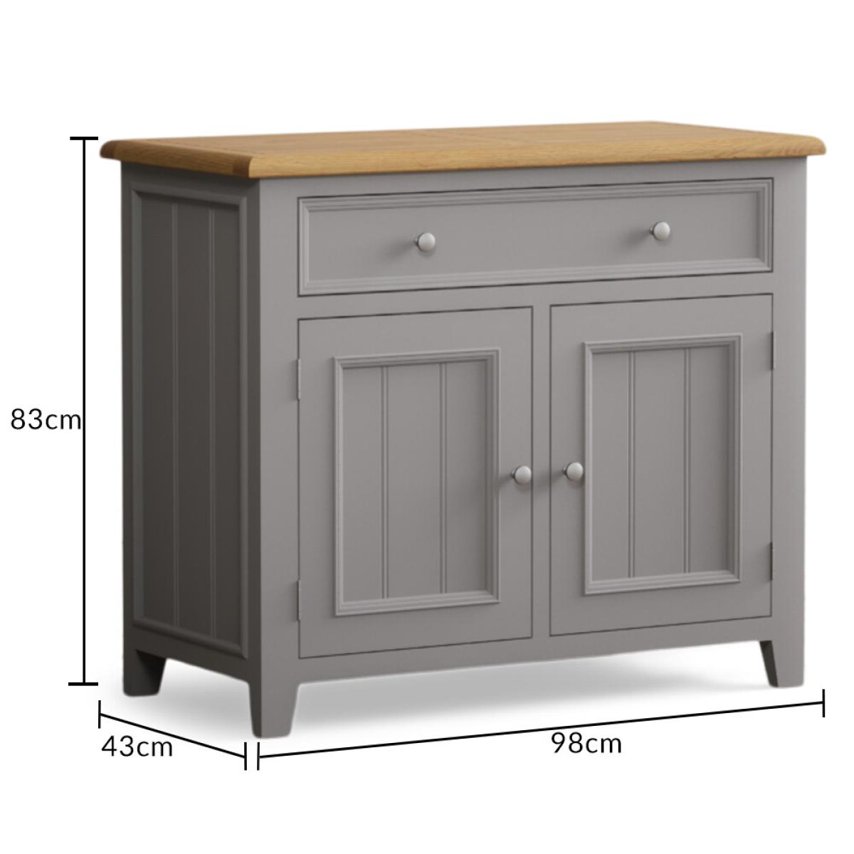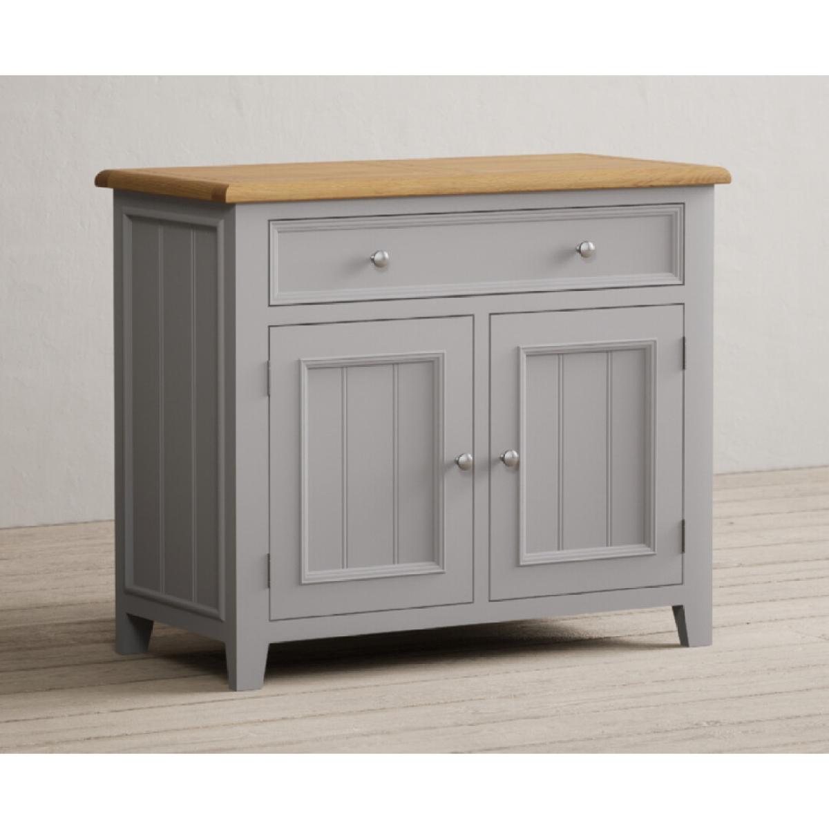 The Weymouth Oak and Light Grey Painted Small Sideboard is crafted from grey painted solid hardwood and topped with 100% solid oak, complete with a two-door cupboard and a Dovetail drawer.