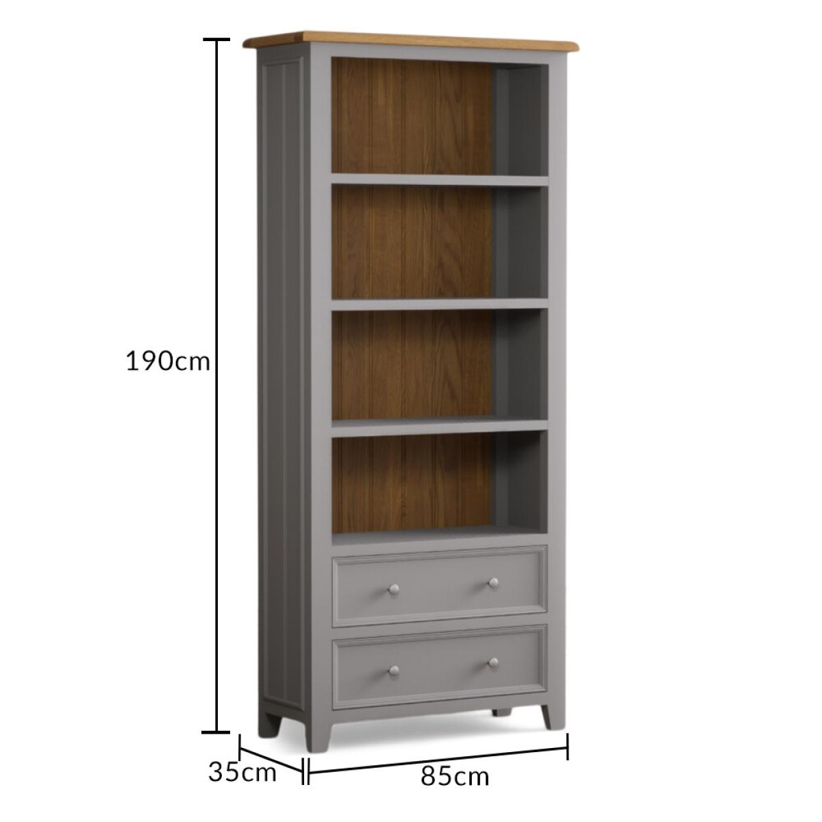 The Weymouth Light Grey Tall Bookcase features a solid hardwood frame with a grey painted finish, with two Dovetail drawers on wooden runners.