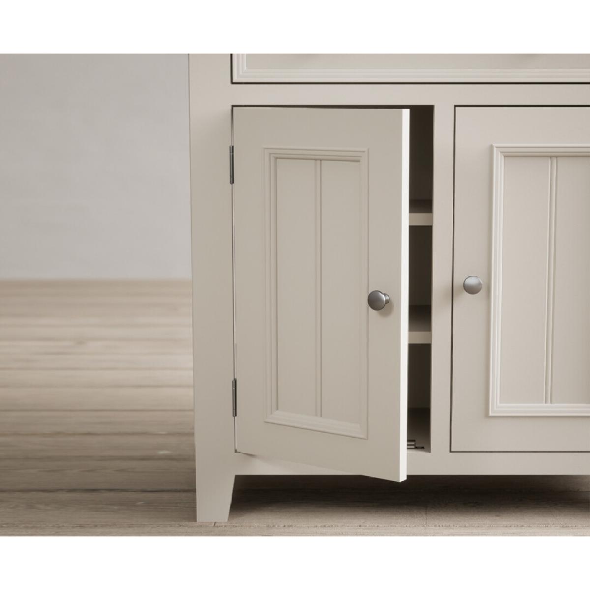 The Weymouth Soft White Hallway Sideboard features a solid hardwood frame with a white painted finish, topped with solid oak and complete with a two door cupboard and Dovetail drawer.