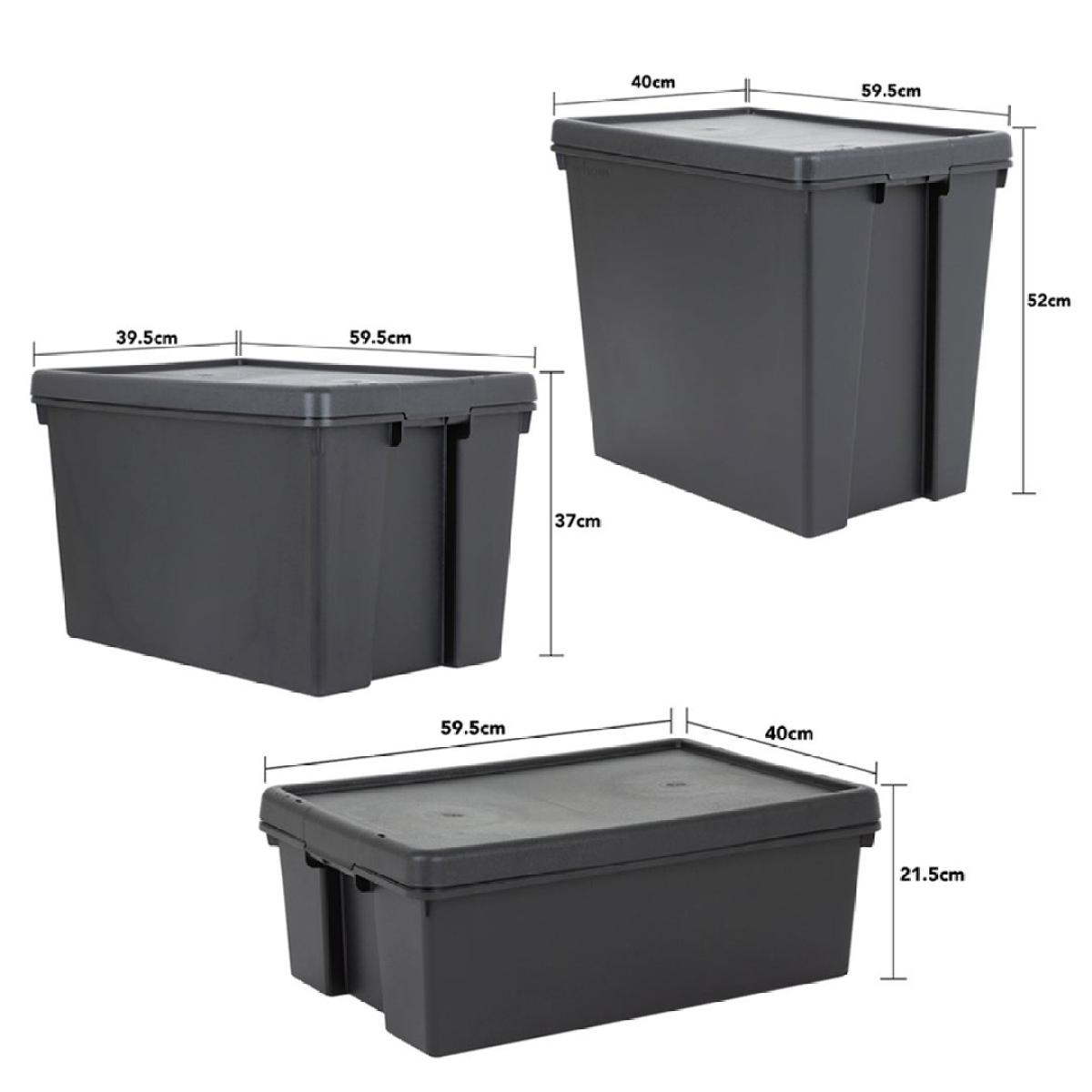 * Includes 6 Boxes & 6 Lids* Made from 100% recycled materials* Designed to last* Heavy duty Looking for storage that doesn’t buckle under pressure? The Wham Bam 3 Piece Heavy Duty Box set is up for the challenge! These impact-resistant, cold-resistant, heavy-duty boxes are perfect for your garage, shed, or attic. Made from 100% recycled materials and tough enough to handle up to 380kg, they’re perfect for stashing away your tools, equipment, and more.
