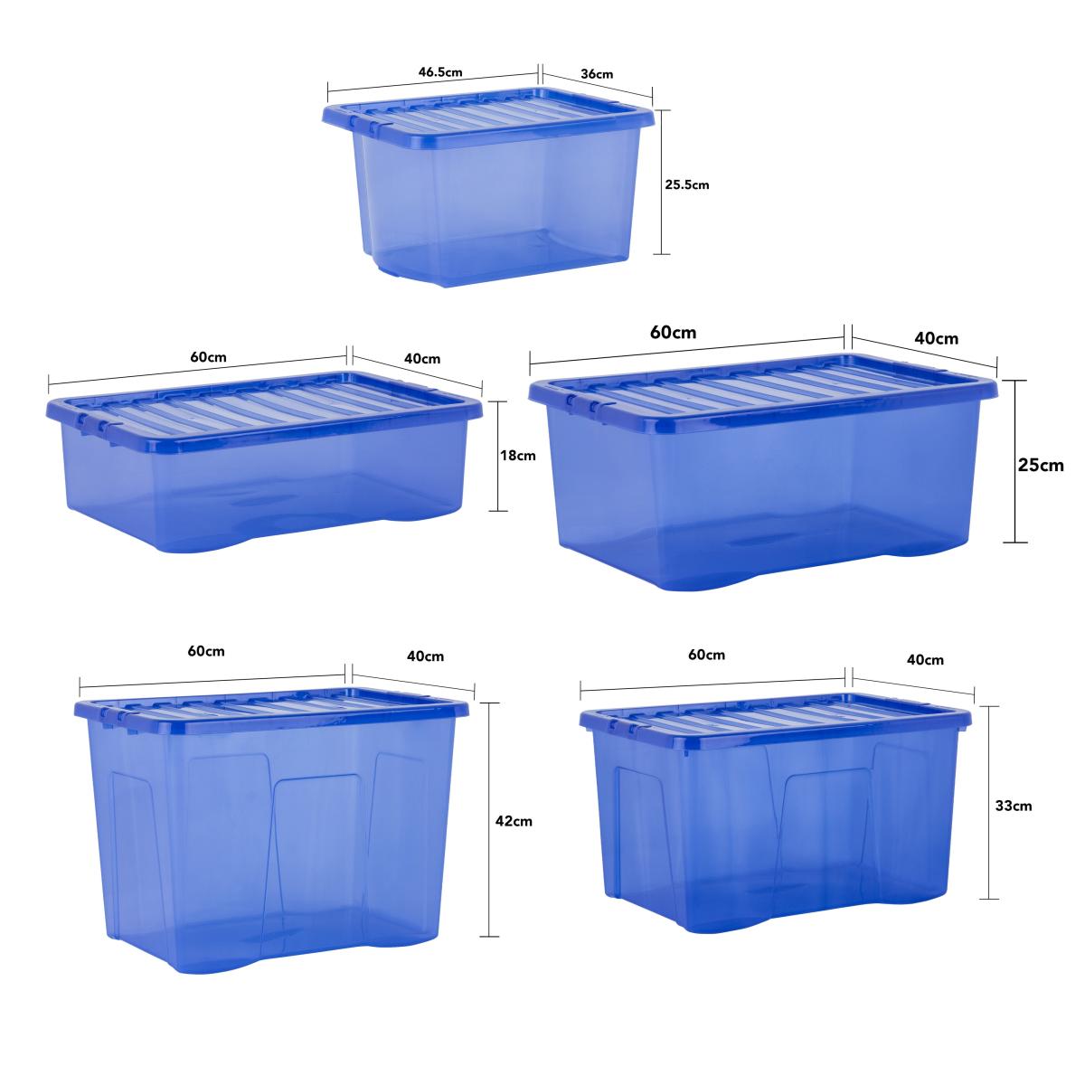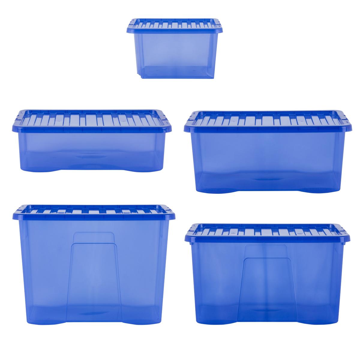 * Set of 5 storage boxes* Assorted sizes* Includes: 1 x 28. L, 1 x 32. L, 1 x 45, 1 x 60, 1 x 80. L* Clip on lids with integrated handles* Stackable & space saving* Clear view of contents* Versatile for use at home or workplaces Wham’s Set of 5 Assorted Storage Boxes are perfect for catering to all your storage needs, whether you’re looking to store your seasonal clothes, books, tools or any other items. Designed with convenience in mind, each box comes with a clip-on lid with integrated handles, making them easy to carry and move around. Plus, the transparent design of the lid allows you to quickly and easily view the contents inside. Versatile and practical, they are perfect for using at home or in the workplace, providing an ideal solution for organising clutter and keeping your space tidy. This set of boxes come in a range of sizes and are stackable so the space-saving design allows you to make the most of your space. When not in use, the boxes can be nested inside each other, providing a compact and easy-to-store solution.
