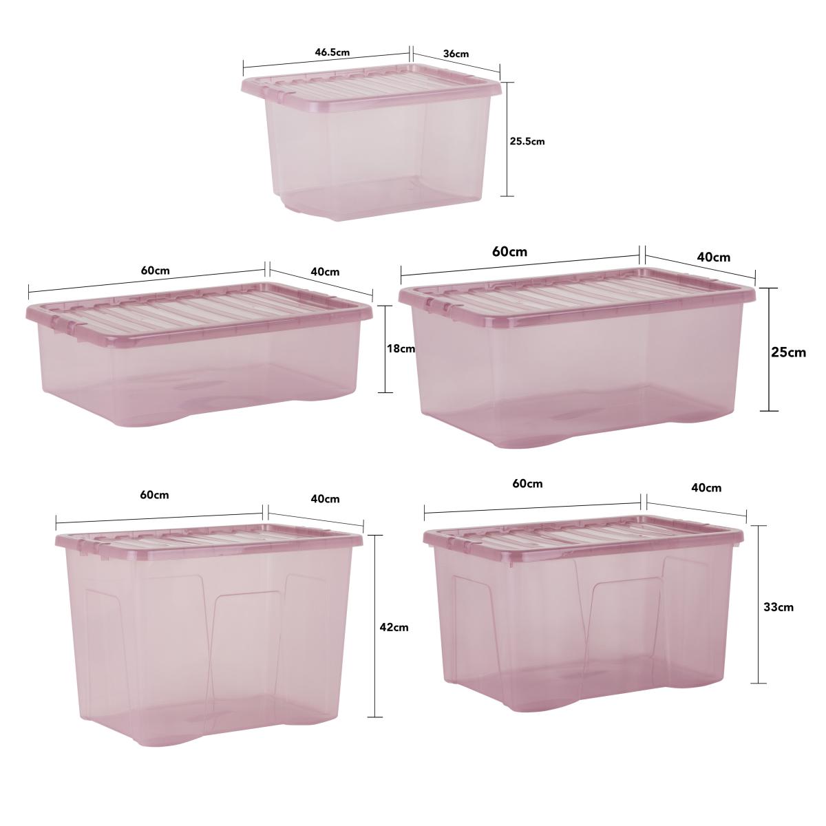 Wham’s Set of 5 Assorted Storage Boxes are perfect for catering to all your storage needs, whether you’re looking to store your seasonal clothes, books, tools or any other items. Designed with convenience in mind, each box comes with a clip-on lid with integrated handles, making them easy to carry and move around. Plus, the transparent design of the lid allows you to quickly and easily view the contents inside. Versatile and practical, they are perfect for using at home or in the workplace, providing an ideal solution for organising clutter and keeping your space tidy. This set of boxes come in a range of sizes and are stackable so the space-saving design allows you to make the most of your space. When not in use, the boxes can be nested inside each other, providing a compact and easy-to-store solution.