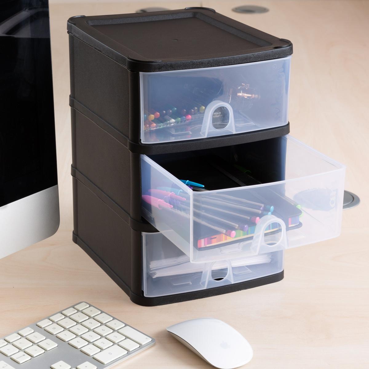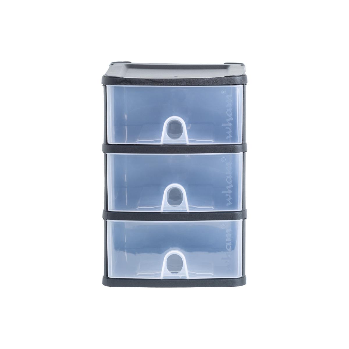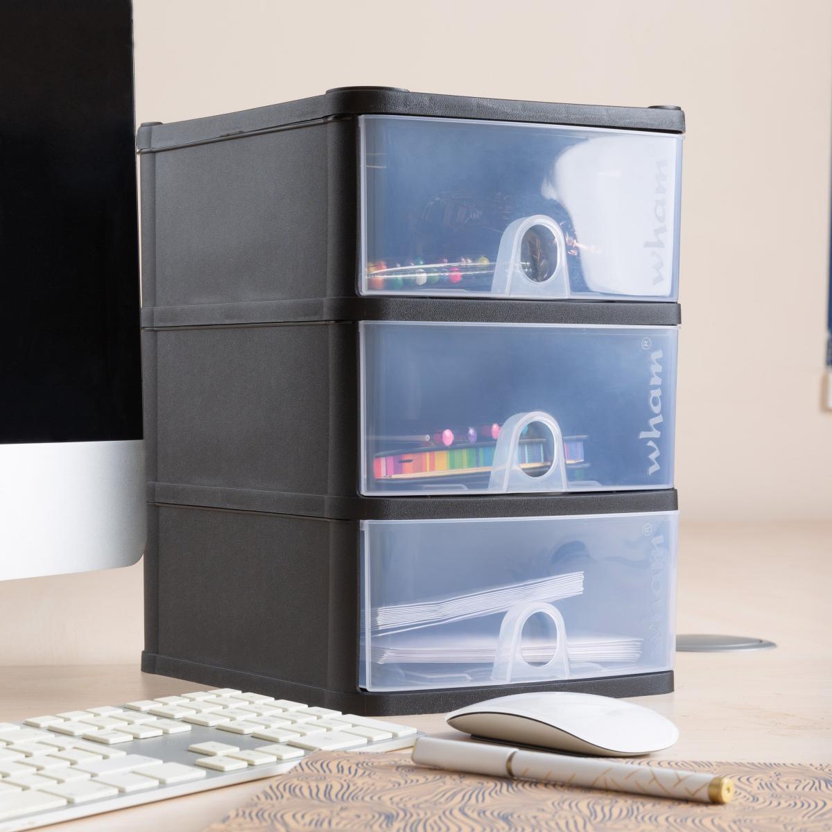 * 3 Drawers* 3. L Capacity* Designed for A5 Paper Keep your workspace tidy with the Wham Handy 3 Drawer Storage Tower Unit. This deluxe assembled desktop unit is designed for A5 paper and is perfect for keeping stationery or small items neat and organised. The easy-to-pull-out drawers, each with an approximate capacity of 3 litres, make this unit a convenient and stylish addition to your desk or office space.