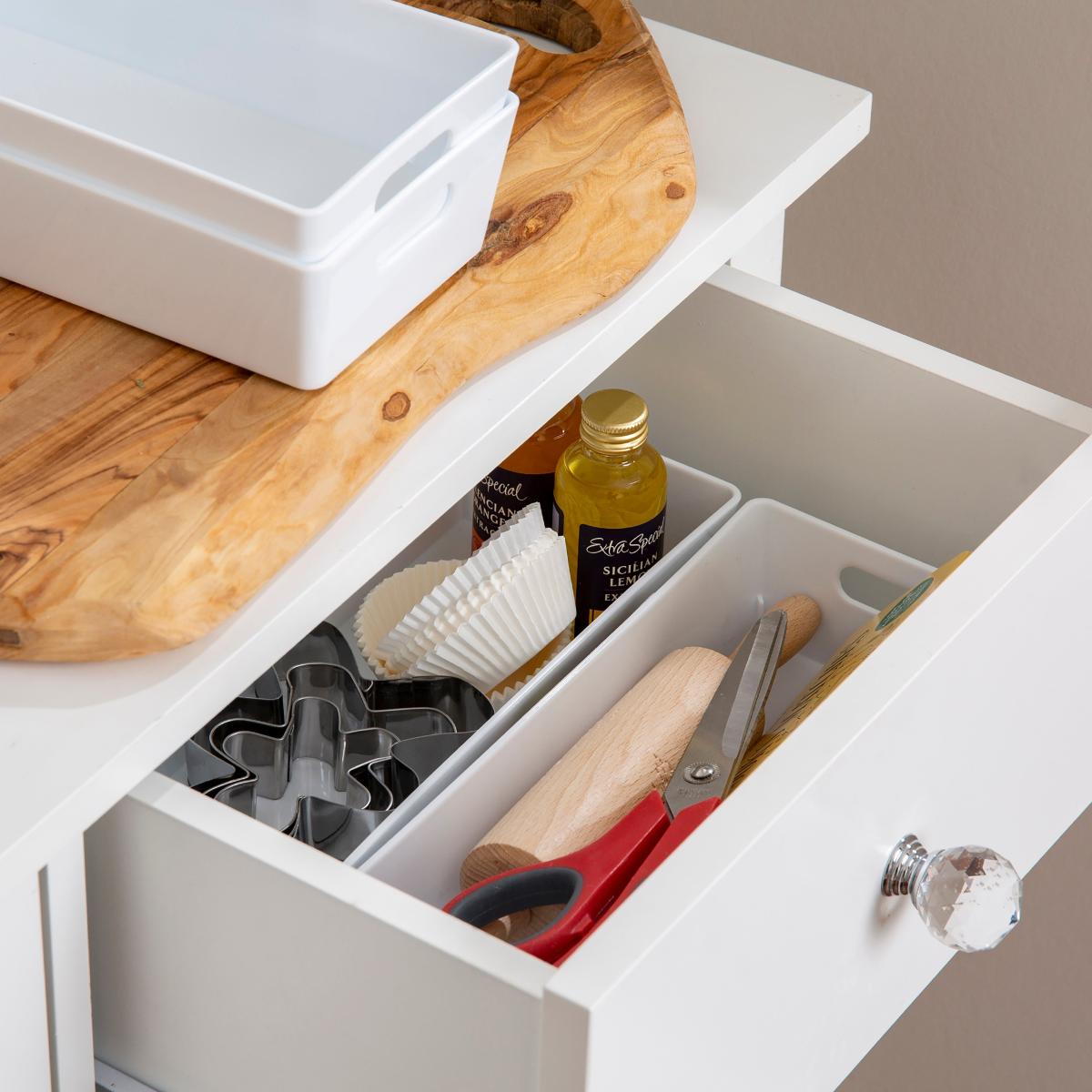 These white baskets are a versatile and practical addition, especially for kitchen or utility spaces. I love their clean, minimalist look, which works well in both modern and farmhouse interiors. They’re great for organising everything from utensils and snacks to cleaning supplies, helping to keep clutter hidden but within easy reach. For styling, consider stacking them on shelves or inside cabinets for a tidy but accessible system, or placing a few on a countertop for a streamlined look. Their neutral colour enables them to blend seamlessly with various colour schemes, making them a functional yet unobtrusive storage solution.