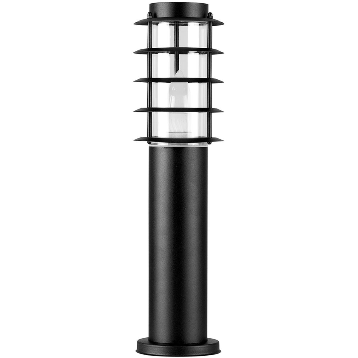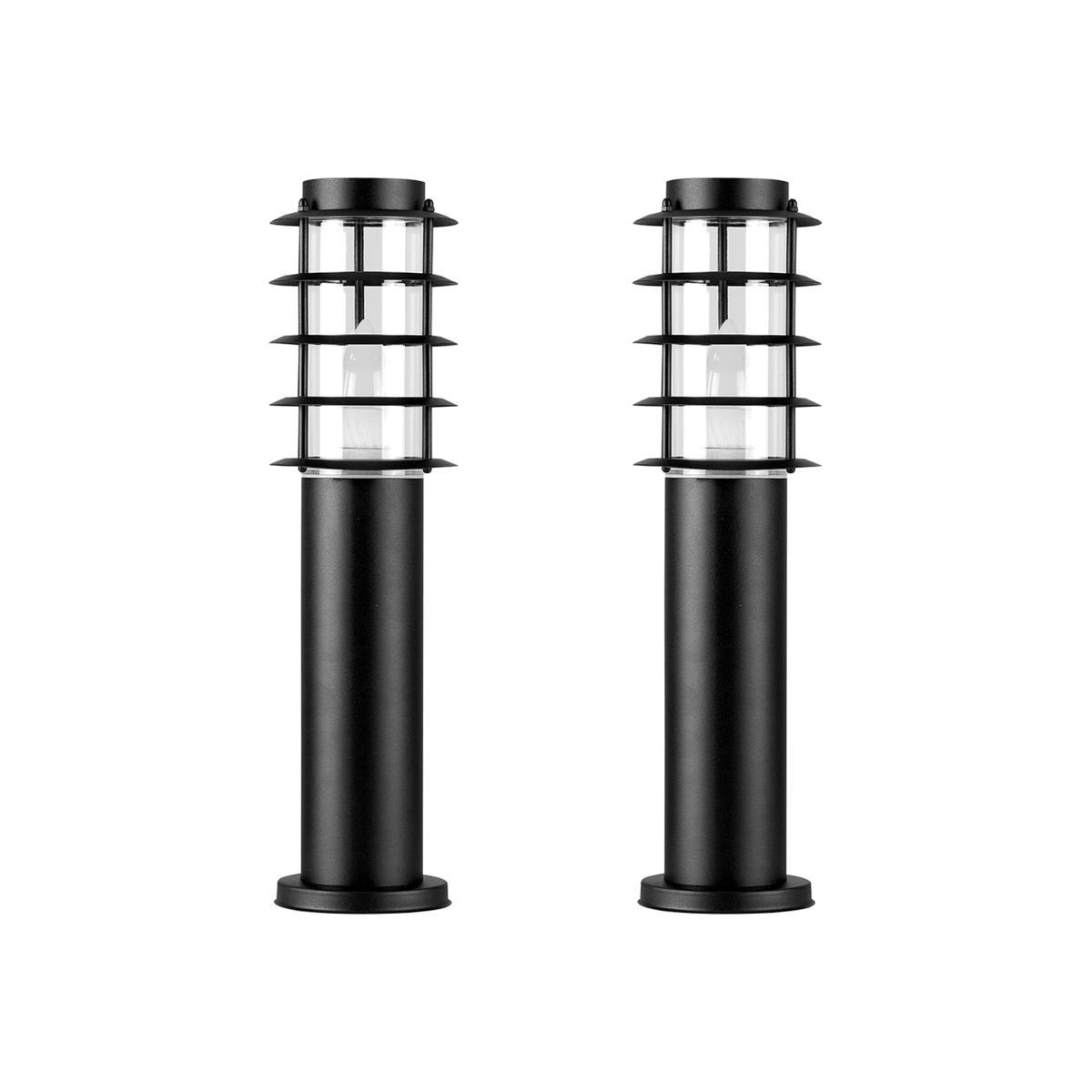A pair of modern outdoor light posts in a black stainless steel finish with clear glass shades. Features a contemporary design and high-quality weatherproof construction. These light posts would make a great addition to any garden. An elegant way to add security to your home as well as outdoor decorative lighting. IP44 rated - fully certified for outdoor installation. 2 x 40w ES E27 Energy Saving Bulb Are Required - Not Supplied