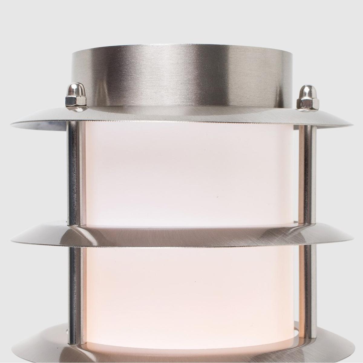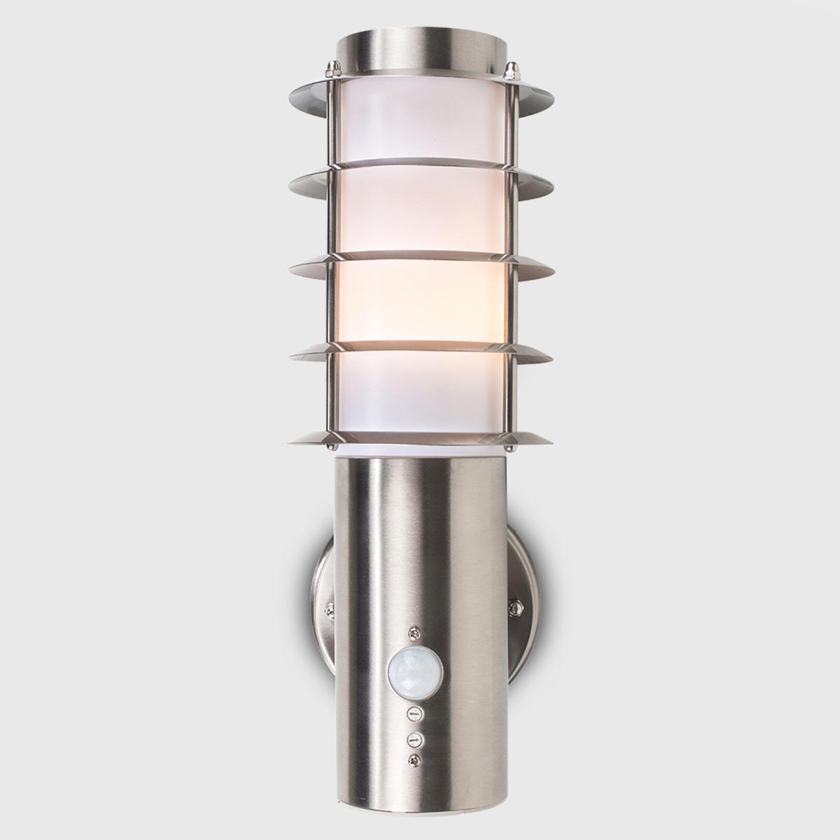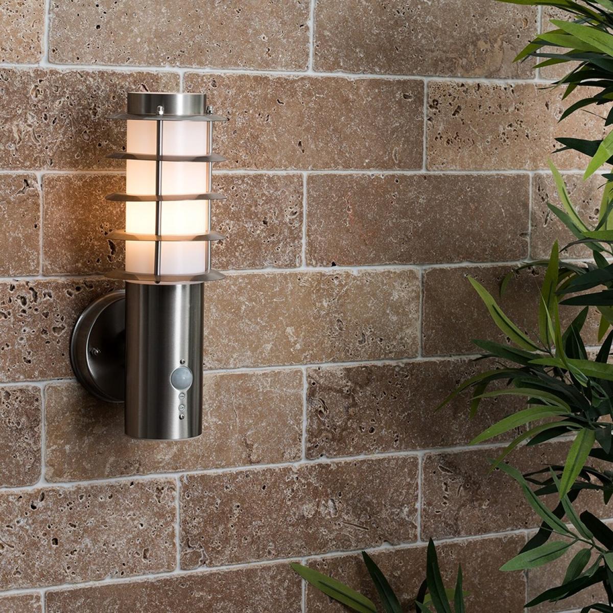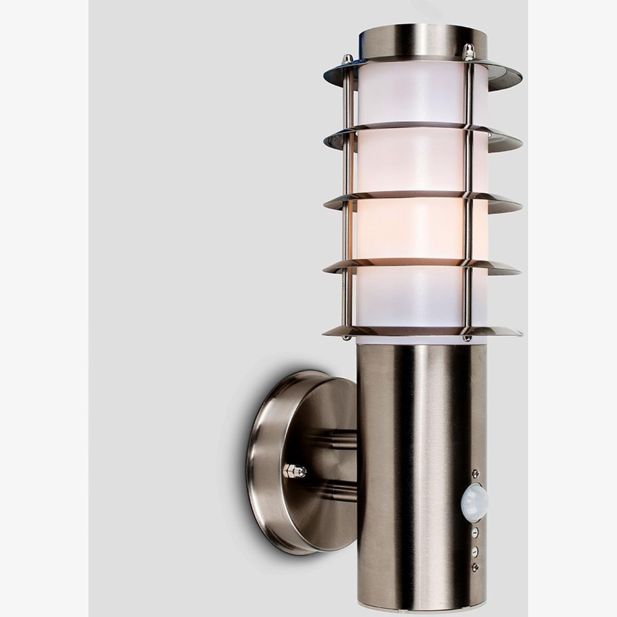 Modern outdoor wall lantern in a stainless steel finish. Features a contemporary design with a frosted white inner shade. Features contemporary design and high-quality weatherproof construction, with a built in PIR motion sensor. An ideal product to help create a warm and inviting glow to doorways, porches and external walls. An elegant way to add security to your home as well as outdoor decorative lighting. IP44 rated - fully certified for outdoor installation.