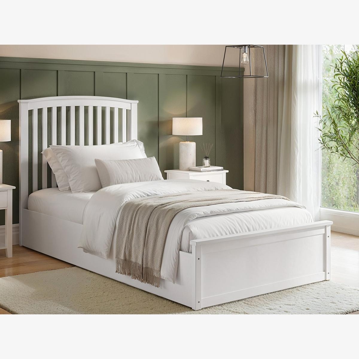I love this white wooden ottoman bed for its clean, classic look that works well in both contemporary and traditional bedrooms. Its neutral colour and simple design make it versatile, and the storage feature is practical for decluttering without sacrificing style. It’s ideal for minimalist, Scandi, or coastal interiors, where light and airy tones are key. For styling tips, consider pairing it with soft, layered bedding in neutral shades or subtle pastels, and adding textured cushions or throws to create comfort and visual interest. To keep the space feeling fresh and bright, complement it with light wood or white bedside tables and incorporate greenery or muted accessories for a calming aesthetic.