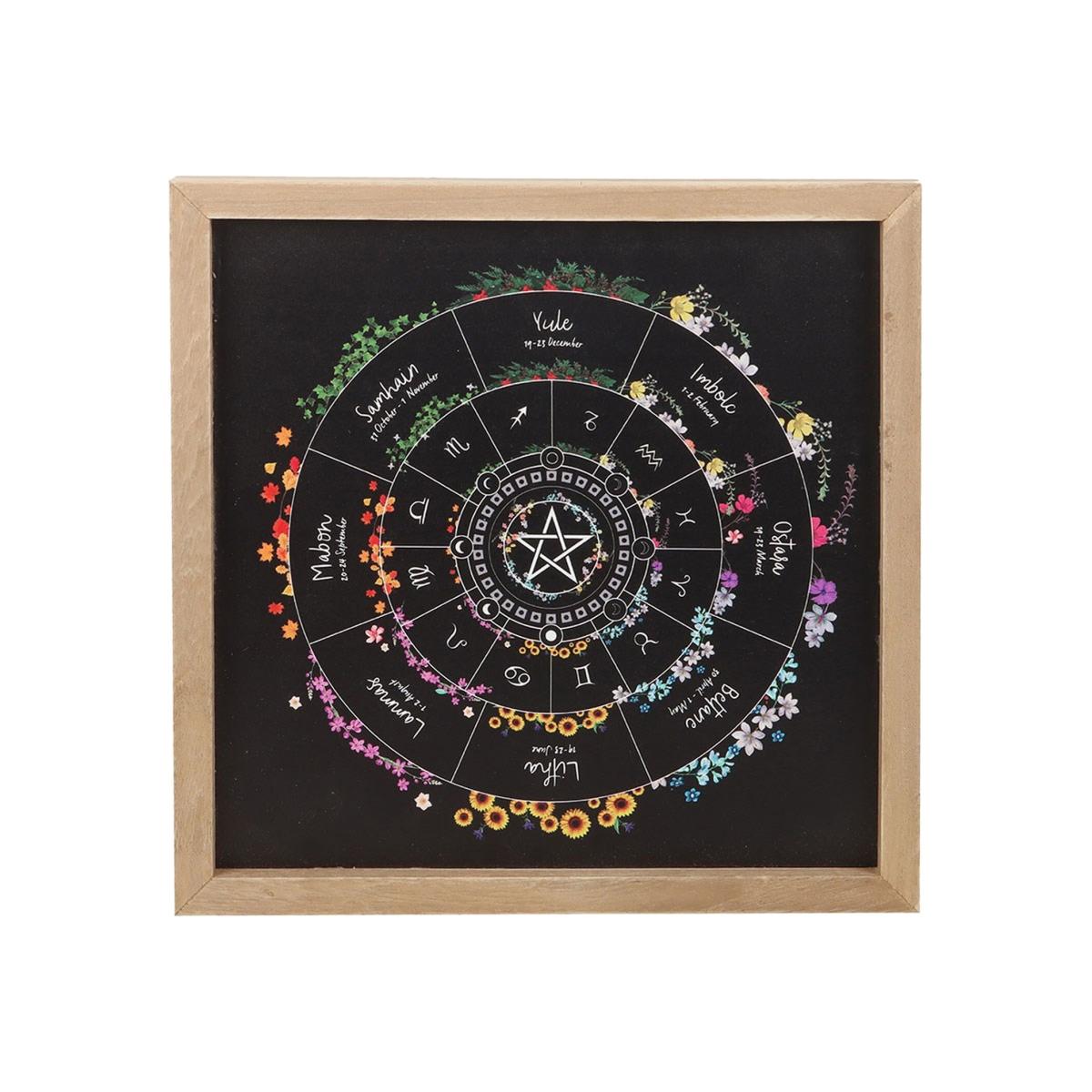 Celebrate the timeless beauty of nature's cycles with this Illustrated Wheel of the Year Wall Art Print, elegantly framed in natural wood and adorned with vibrant, colourful floral details. This captivating piece is a beautiful homage to the ancient traditions and the eight sacred festivals that mark the turning of the seasons. Wheel of the Year design features representations of all eight Sabbats-Yule, Imbolc, Ostara, Beltane, Litha, Lughnasadh, Mabon, and Samhain-along with their corresponding dates and astrological symbol. The artwork is beautifully complemented by a simple yet elegant natural wood frame, ready to hang and bring a touch of rustic charm and spiritual significance to your home.