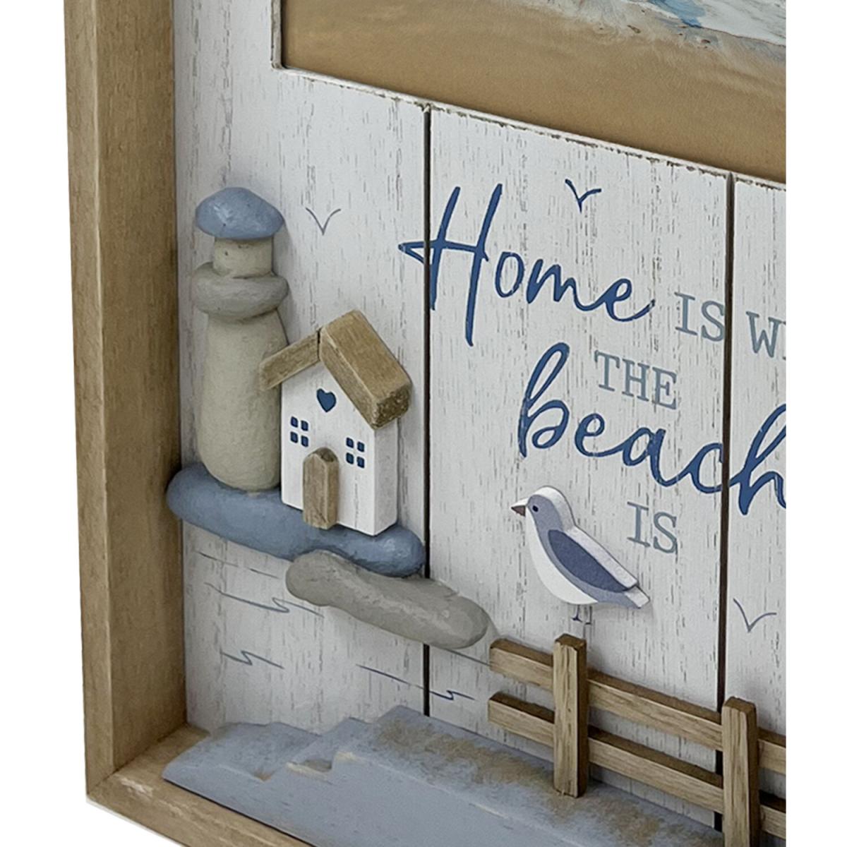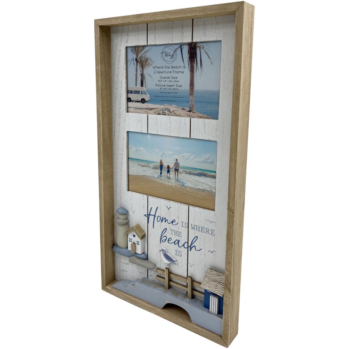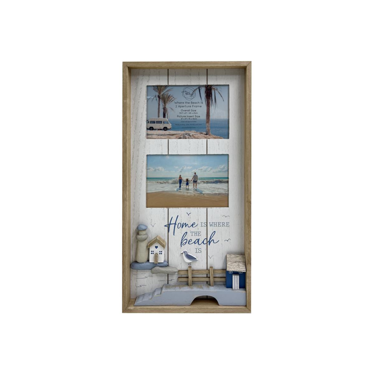 Display your favourite summer photographs in style with the help of our Where the Beach Is 2-Aperture Frame. This unique and quirky multi-aperture photo frame features a rustic beach-hut vibe with natural wood effects and a gorgeous coastal scene along the bottom. The frame is finished with elegant typography which reads "Home is where the beach is" and has space for two photos. It will look lovely hanging in your living room, hallway, or bedroom, reminding you of great times at the beach over the summer.