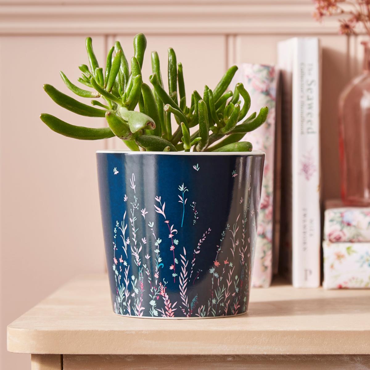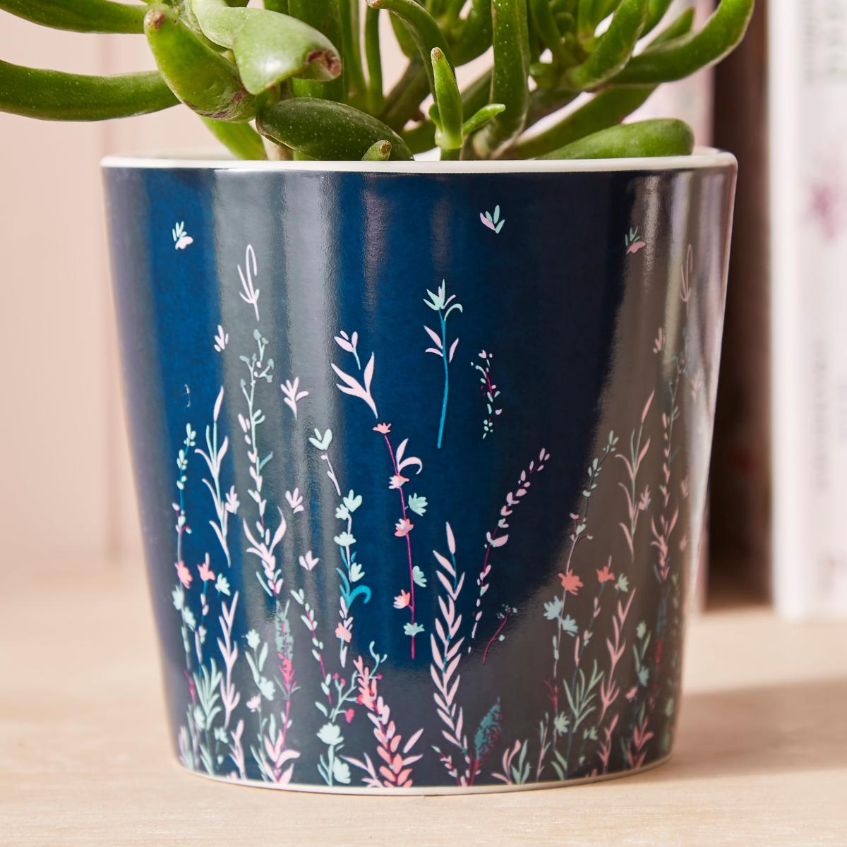 I love the whimsical floral design paired with the navy tone-it adds a playful yet sophisticated touch to your space. This pot works especially well in interiors with modern, boho, or eclectic styles, where its vibrant pattern can serve as a focal point or complement softer colour palettes. For styling, consider placing it on a windowsill or a side table alongside other natural elements like woven textures or neutral-toned accessories. It’s practical for small to medium indoor plants and can be easily integrated into a variety of room settings, from kitchens to living rooms, adding colour and personality without overwhelming the space.