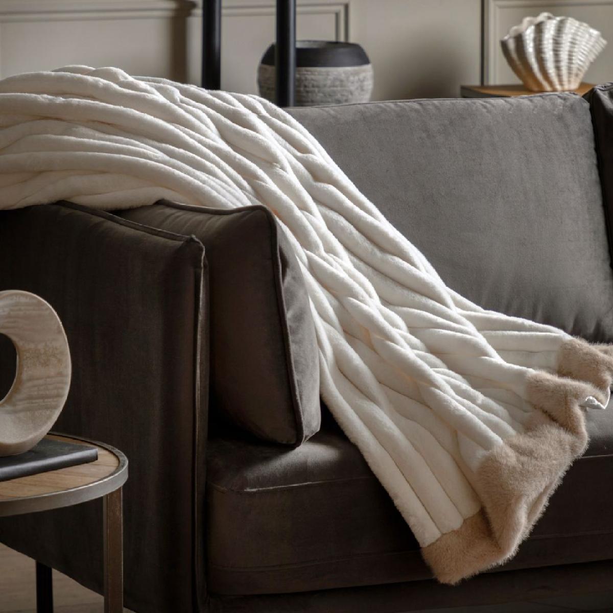 Whinfell faux-fur trimmed cream throw, featuring a chunky ribbed design. Indulge in cosy luxury with the Whinfell faux-fur trimmed cream throw. This elegant throw features a chunky ribbed design that adds texture and warmth to any room. The soft faux-fur trim enhances its sophisticated appeal while providing an extra layer of comfort. Perfect for draping over your sofa or bed, the Whinfell throw combines style and practicality, making it ideal for chilly evenings or as a decorative accent. Its creamy neutral tone effortlessly complements a variety of interiors, adding a touch of timeless elegance to your living space.