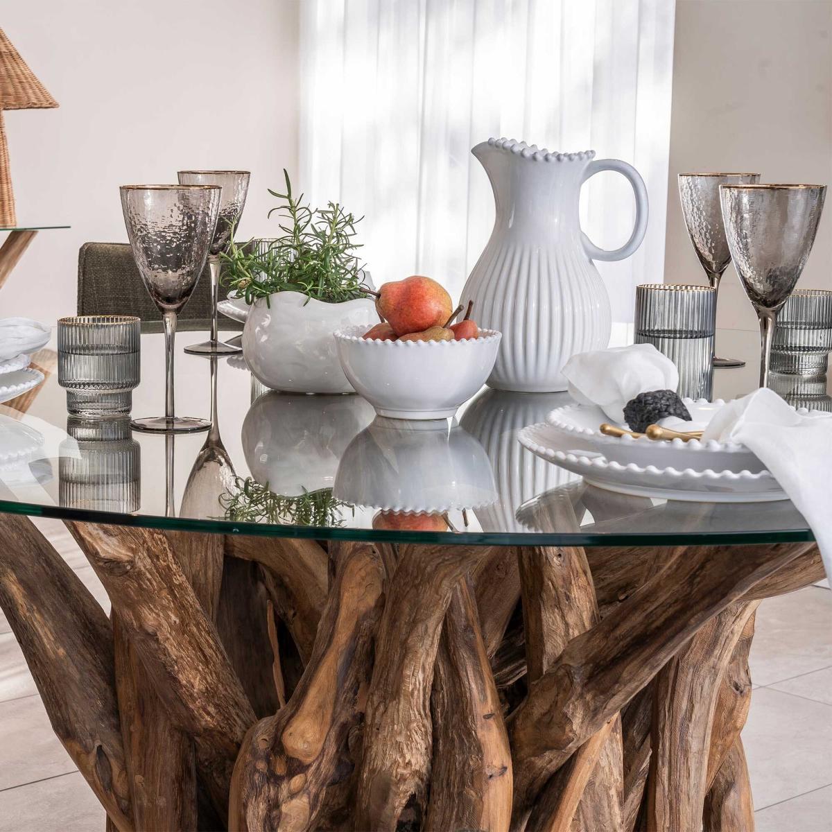 Make a bold statement in your dining area with this Whinfell Round Glass Top and Teak Root Wood Base 160cm Dining Table - a true blend of organic artistry and practical design. The table features a striking, hand-assembled base made from reclaimed teak root, each piece uniquely shaped by nature to create a one-of-a-kind sculptural foundation. Topped with a sleek tempered glass surface, the transparency beautifully highlights the intricate woodwork below, offering both visual lightness and tactile richness. Perfect for design-conscious interiors, eco-friendly homes, or anyone wanting to invest in timeless, sustainable craftsmanship. Bring natural elegance and refined character into your dining experience with a table that's as enduring as it is extraordinary