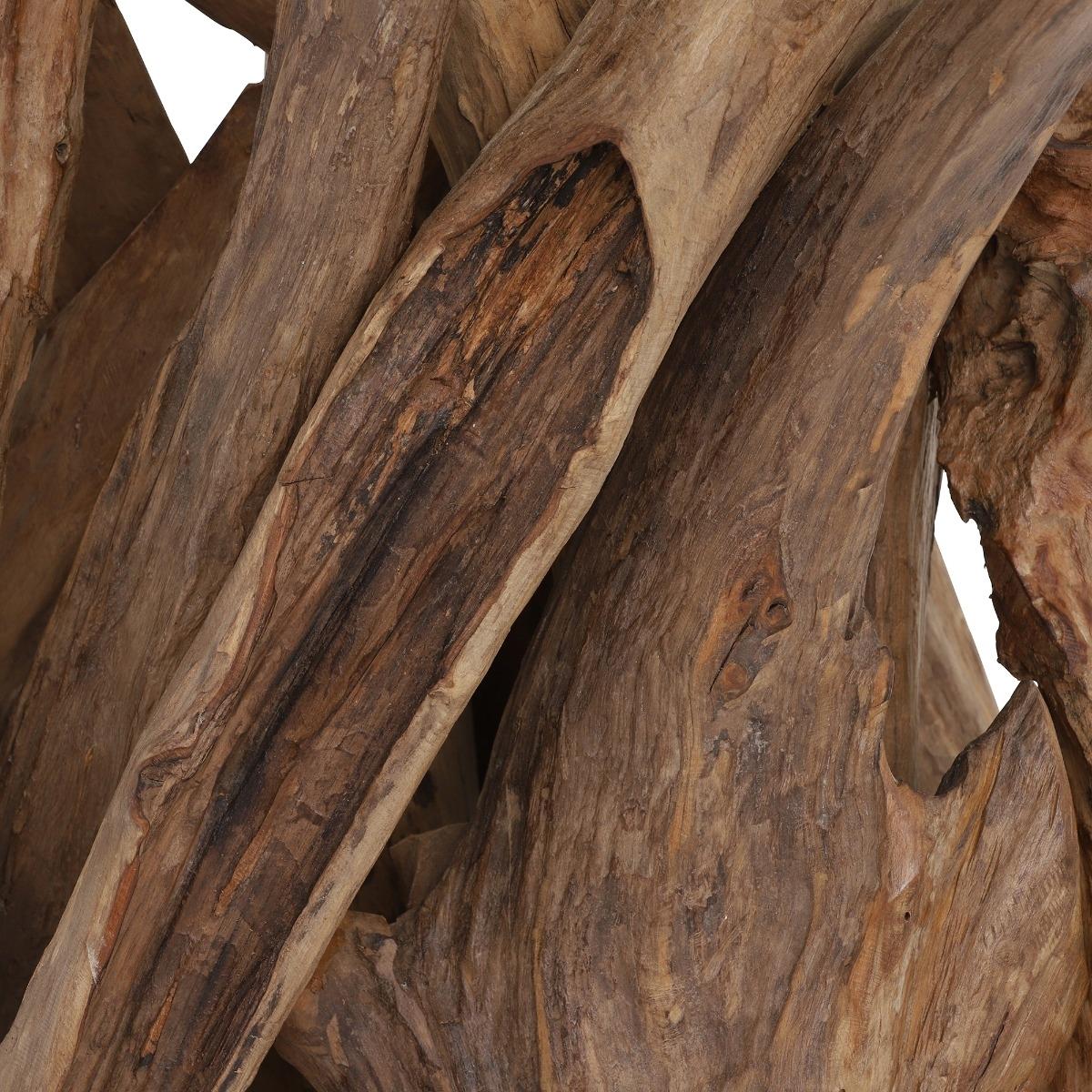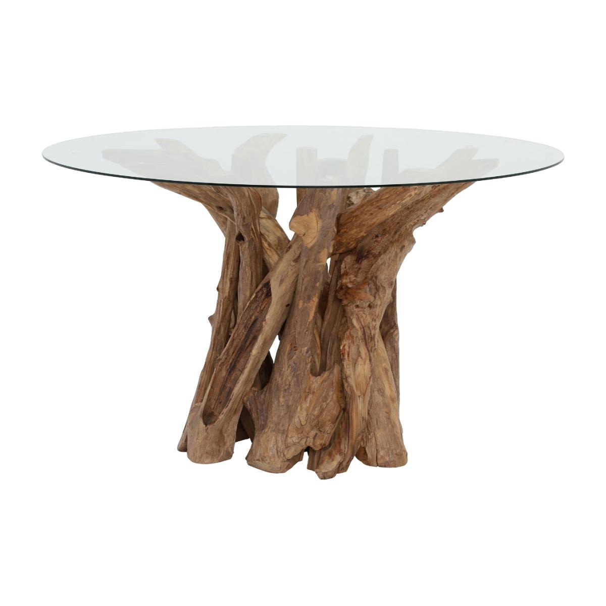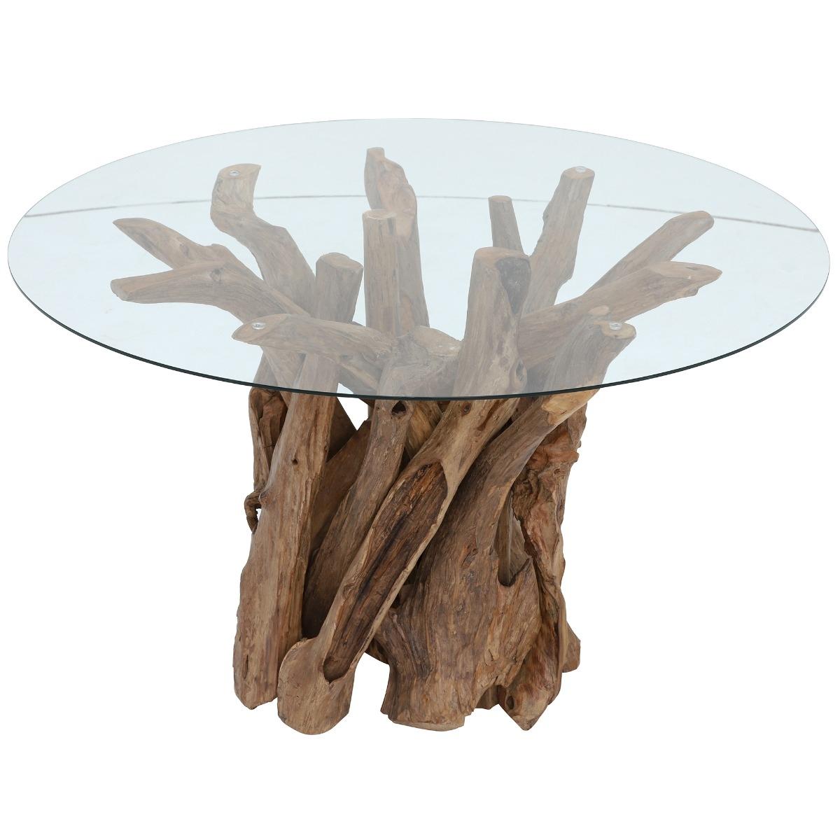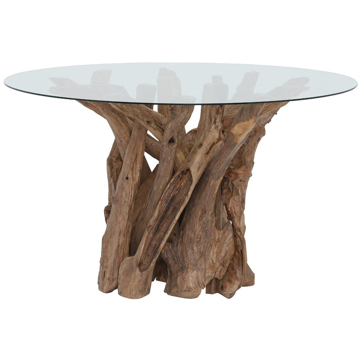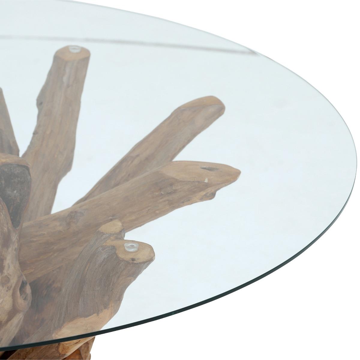 Design. This truly unique rustic piece will create a focal point in any dining space, drawing eyes and impressing all who dine around it. The Whinfell Round Dining Table provides an inviting space for day-to-day dining and is perfect for entertaining guests because of its round shape; ideal for squeezing a couple of extra seats around when needed. Reclaimed teak branches are a quirky feature allowing you to bring nature closer to home. Supporting a glass tabletop, the teak is a durable and sustainable choice which will add an element of eccentricity to your dining room.