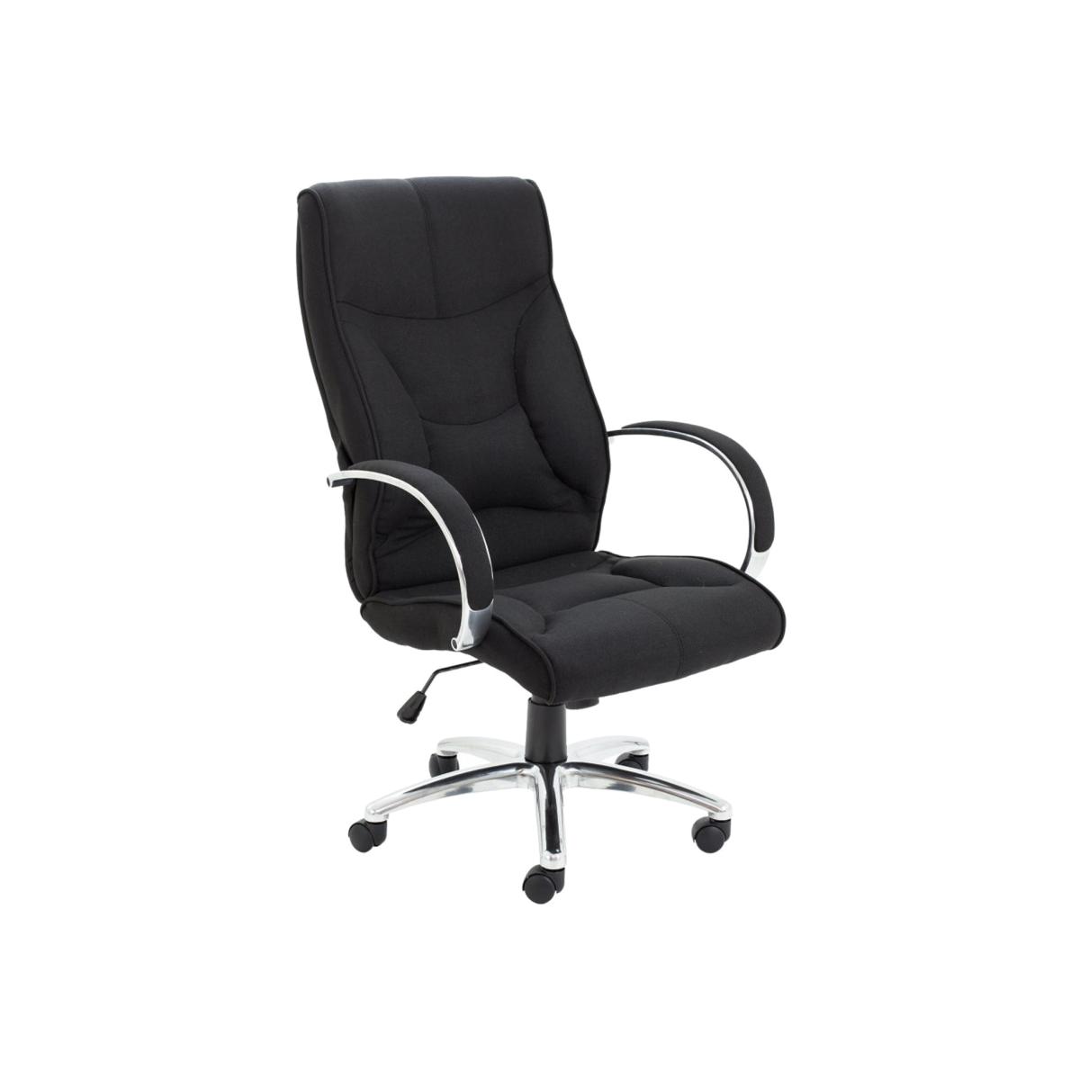 A quality executive manager's chair in black fabric with Chrome Base. A practical black fabric executive chair providing comfort and support. With a lock tilt mechanism. Featuring stylish curved padded arms and a sturdy chrome base.