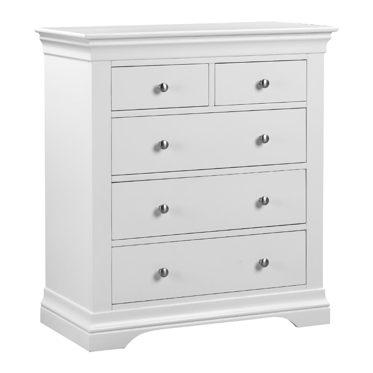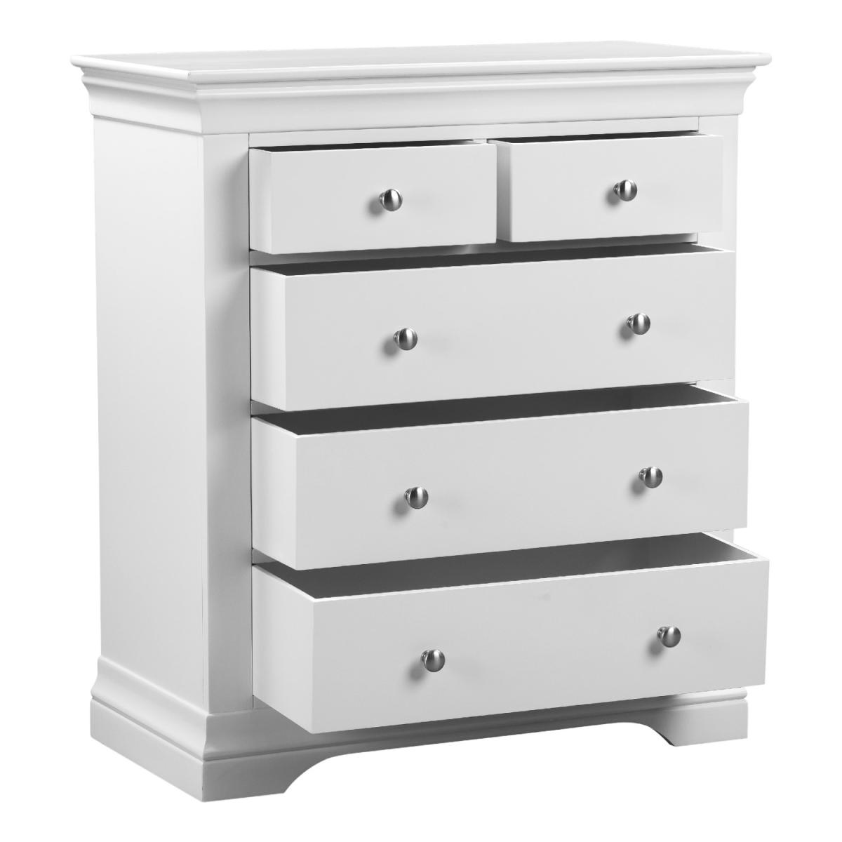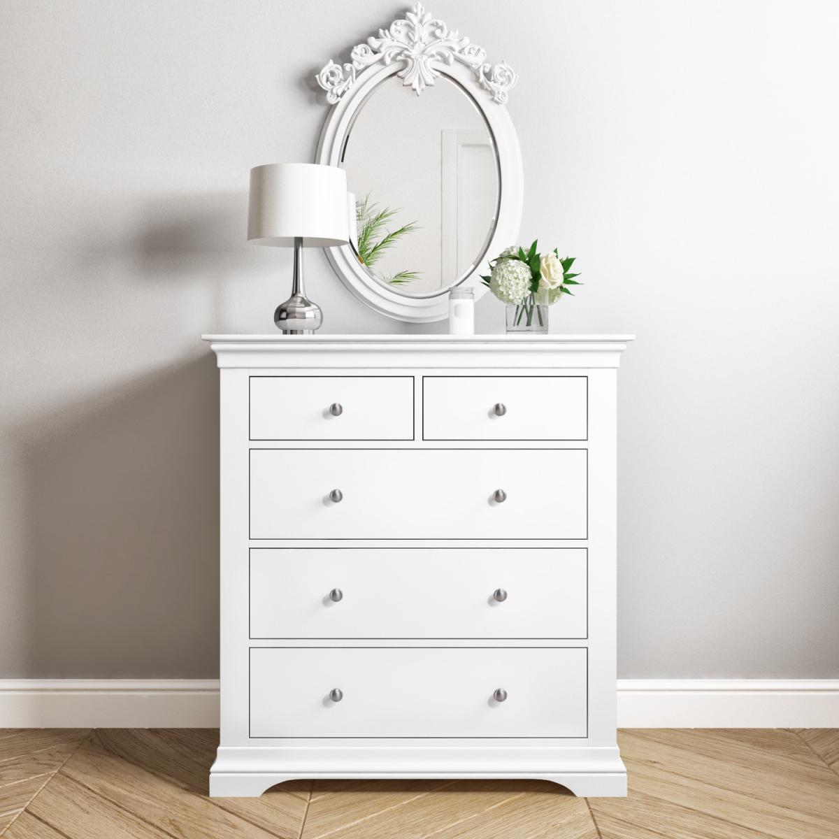 Elegant French design with a contemporary feel Finished with a white paint, suitable for any decor Five drawers to store and organize folded items Featuring high quality rounded, brushed silver handles Delivered fully assembled Need to know Colour: White Finish: Painted Material: Pine and MDF Weight: 39kg Assembly required: No