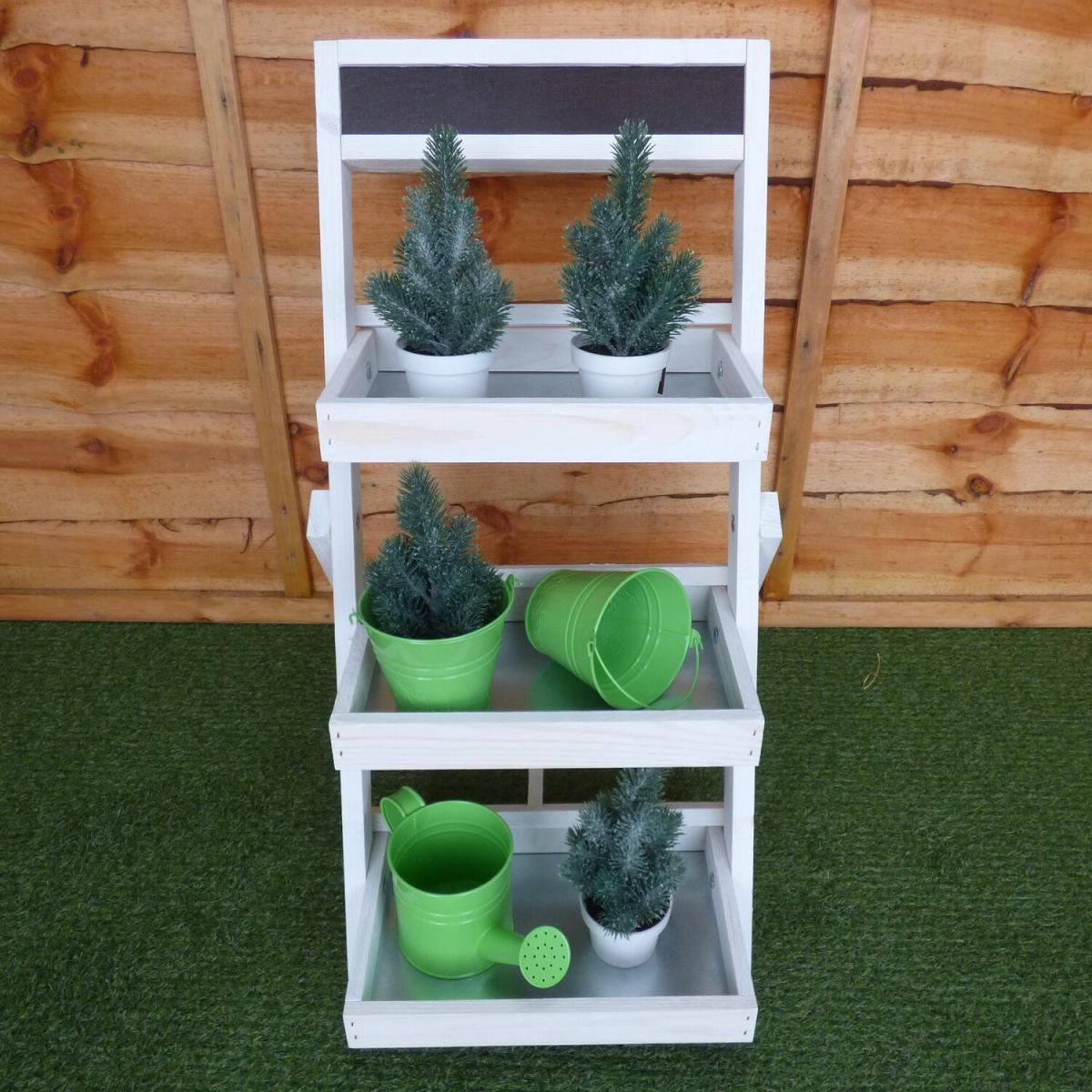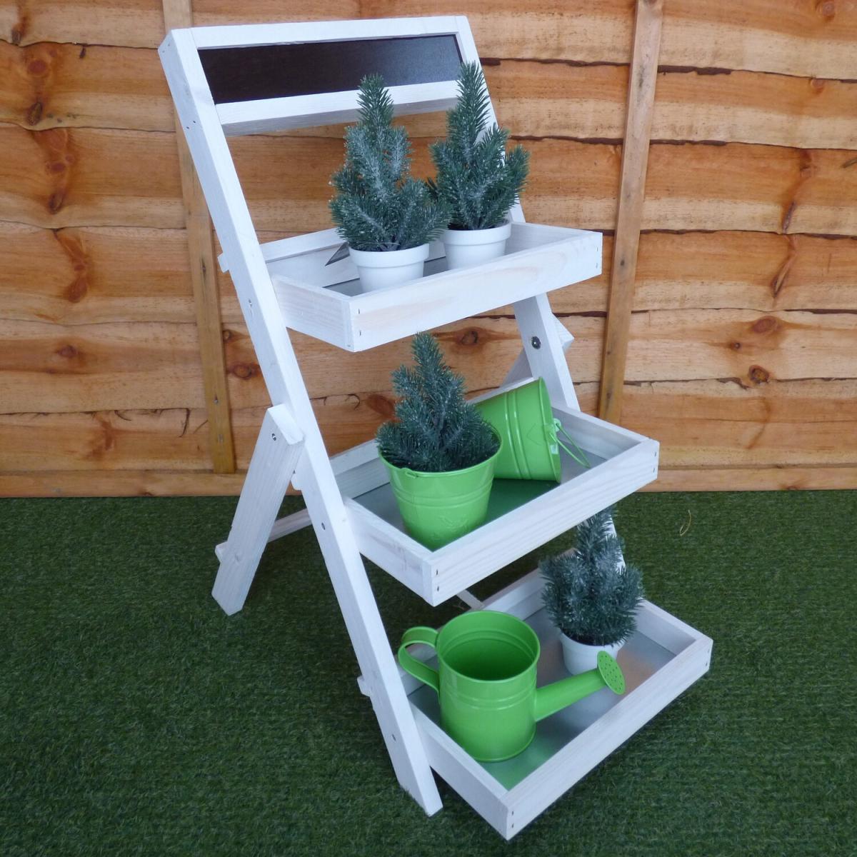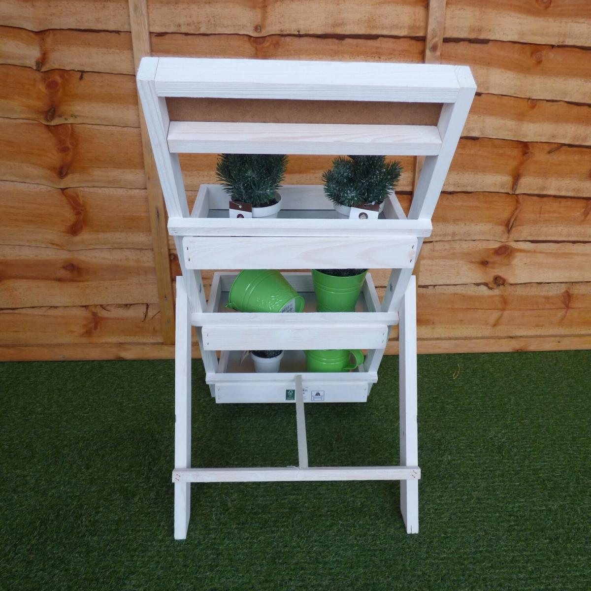 This natural whitewashed pinewood etagere is a durable and multifunctional storage solution. Suitable for both indoor and outdoor use, this 3-tier unit is ideal for displaying pots and plants, books and many other decorative ornaments around the home, patio or garden. Its easy folding frame makes the shelving unit easy to assemble, and quick and simple to store away when not in use. When opened out, the unit measures 69cm in height, 52cm in depth and 39cm in width at the widest and tallest points. Folding nice and compact to approximately L35.5cm x H78cm x D6cm. Featuring 3 shelves which individually fold away enabling you to display the unit in a variety of positions. Each shelf tray has an internal measurement of L29cm x W17.5cm x H4cm approximately an ideal size for smaller decorative ornaments and pots. Perfect for herbs! As well as use around the home, the unit also adds a classy touch to display memos, sweets, cakes and other flavours at a wedding, birthday, baby shower, Christening and other special occasions. (Plants and accessories not included) - For illustration purposes only.