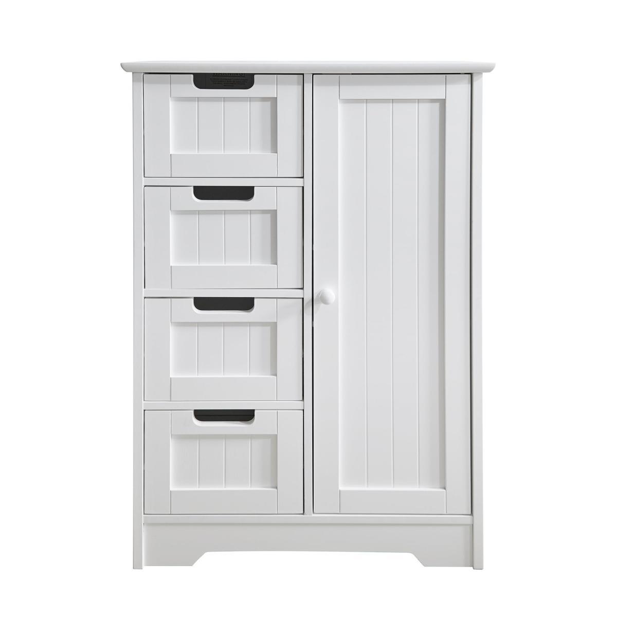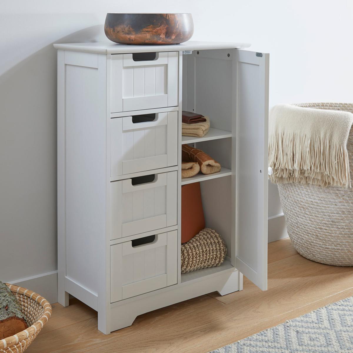 Boasting a traditional design this white 4 drawer storage cabinet provides you with ample storage for all your belongings. Thiswooden cabinet is easy to clean and assemble making it the ideal, classic addition to your home.