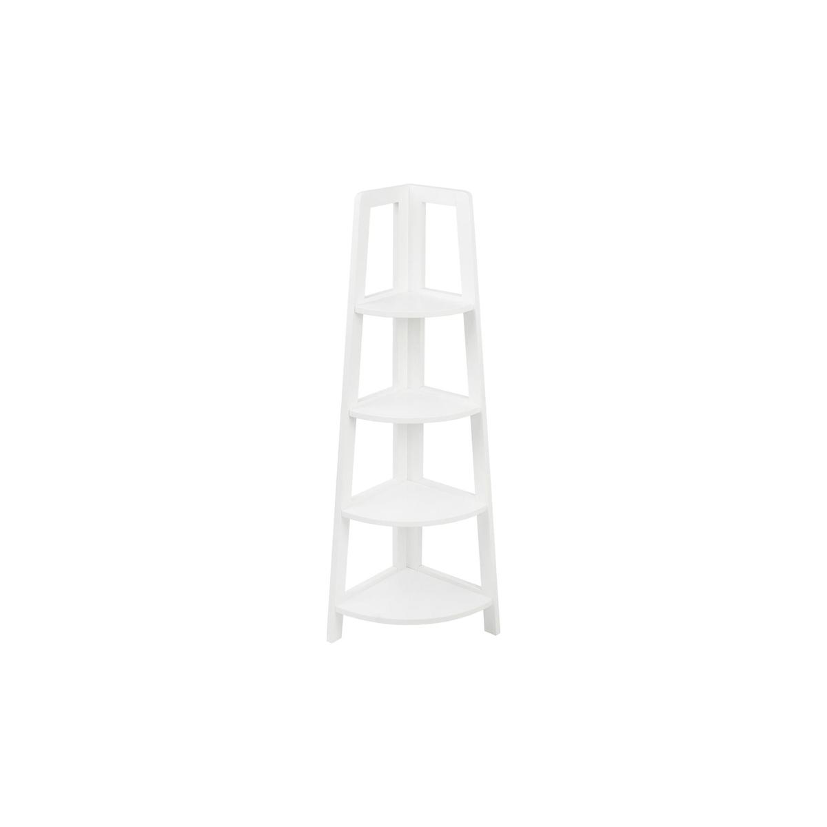 This contemporary white painted corner storage features four curved shelves to neatly hold all of your bathroom essentials. Self assembly required.
