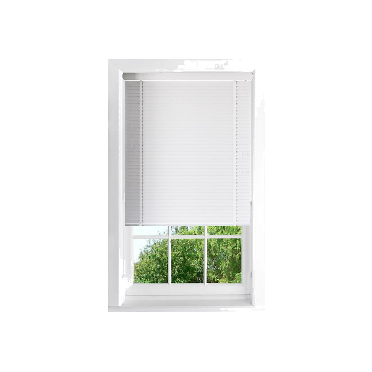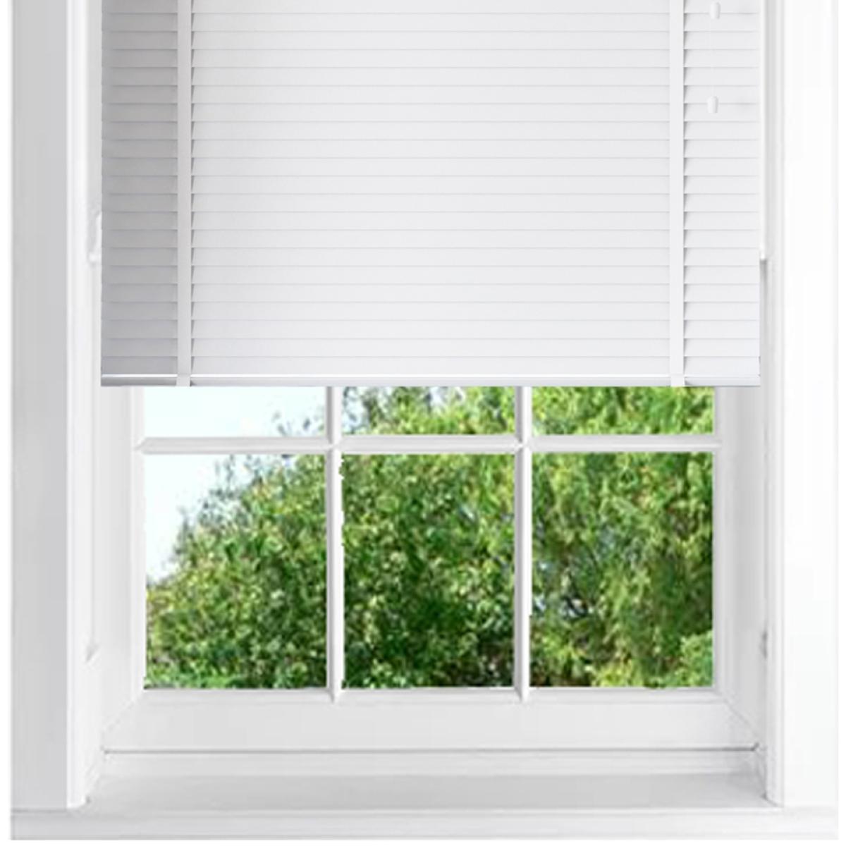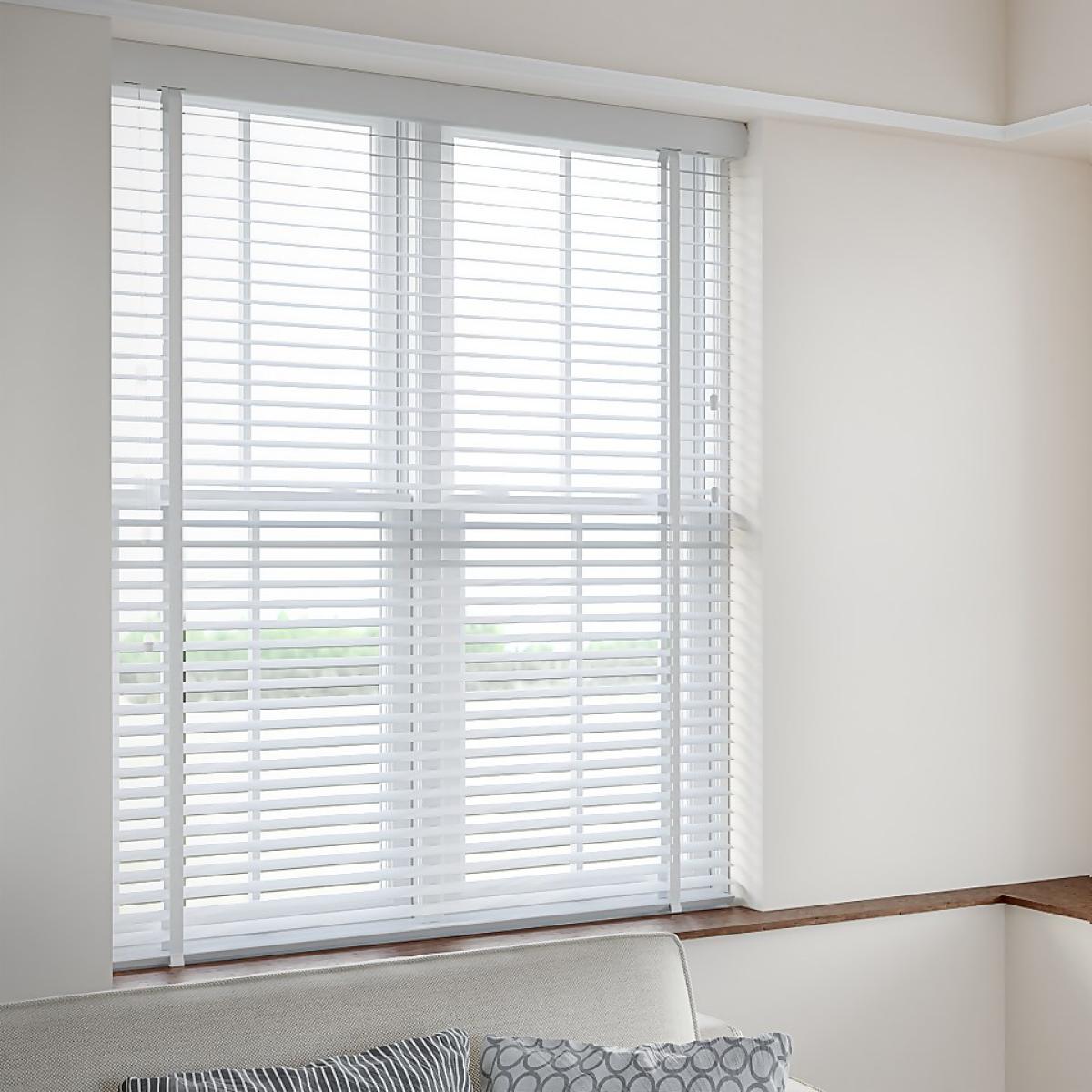 The white 50mm faux wood venetian blind with 50mm slats embossed with a wood grain effect has decorative fabric tapes matching the colour of the blind. The easy to fit system work for both inside and outside the window recess. This blind includes a clip on pelmet to complete the look. The blind utilises a two cord system, one set for lifting the blind up and down and the other is use adjusts the tilt of the slat to adjust your level of privacy to your room.