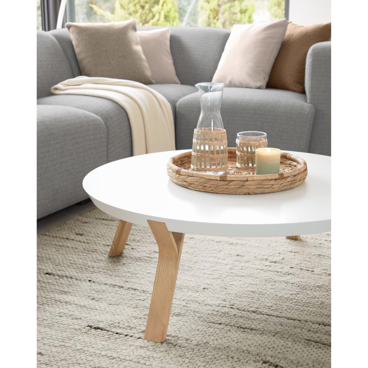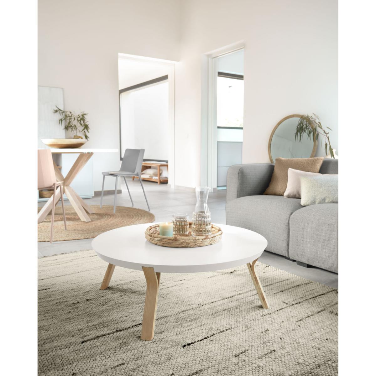 I love how this white-and-ash Dilos coffee table blends a crisp, round top with sculptural ash legs - ideal for Scandi, modern or minimalist living rooms. Its 90 cm diameter gives you enough surface without crowding the space; keep styling simple with a couple of oversized coffee-table books, a small ceramic vase of greenery and a slim tray to corral remotes or candles.