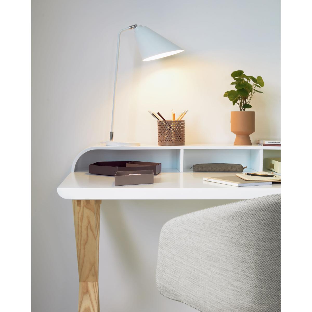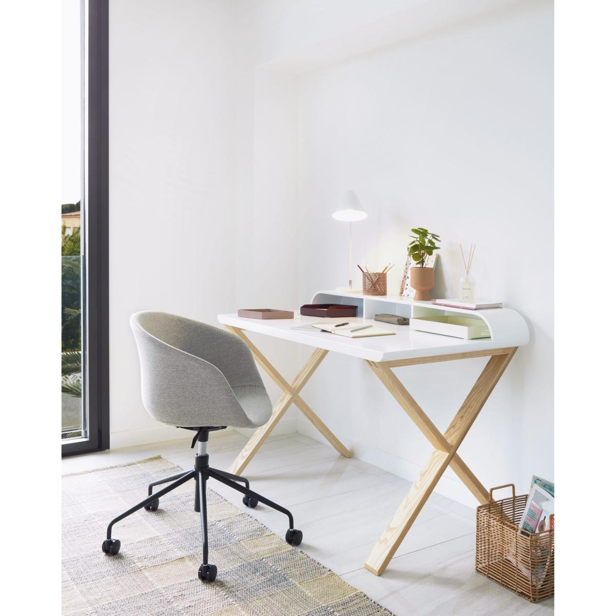 I’m a fan of this white and ash desk for its clean, modern lines and versatile neutral palette. It slots effortlessly into contemporary, Scandi‐inspired or minimalist home offices, pairing well with pale wood flooring and soft grey accents. To style it practically, keep the surface clutter‐free with a slim desk organiser and a small potted plant, then add a slim under‐desk drawer or wicker basket for extra storage. A muted desk mat and a simple black or brass lamp will complete the look without overpowering the light, airy feel.