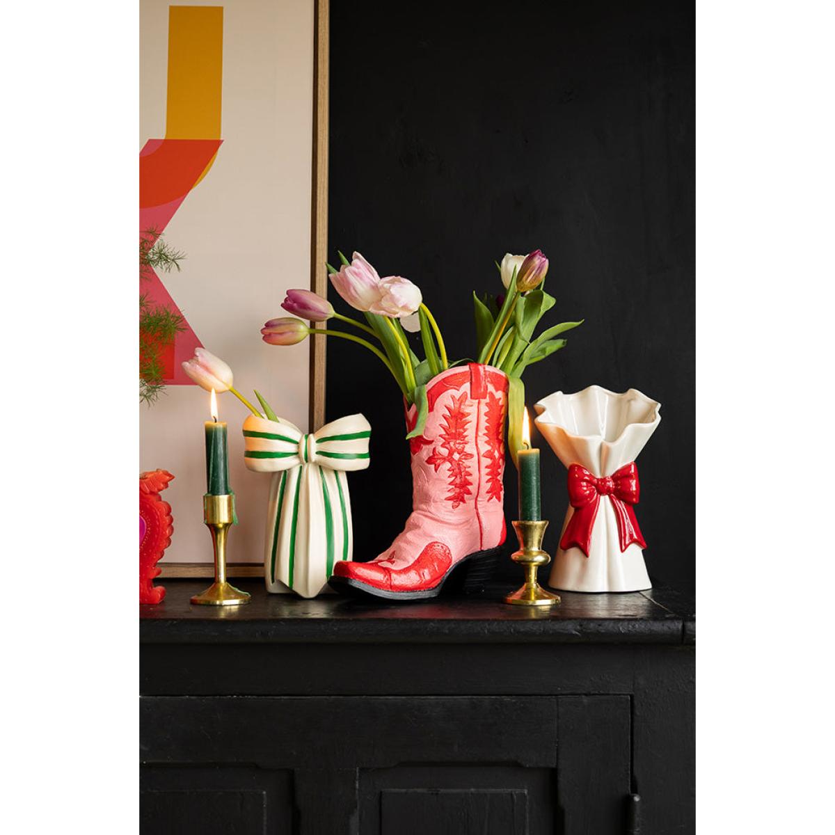 <!--td --> This super-pretty bud vase is the perfect ornament to welcome in the new season. Bringing a romantic and whimsical vibe to your home, it's a piece with versatility in spades - simply style in your living room, bedroom or on a kitchen dresser with pretty yellow and pink blooms for a pop of colour any maximalist would be proud of. There's no reason homeware should be staid or boring - and this is just the vase to bring fun and playfulness into your home. In fact, it's the epitome of Rockett St George's signature quirkiness, and does a terrific job of brightening up your day. Sold!- White & Green Beautiful Bow Bud Vase- Measures: W14cm x H19cm x L7cm- Material: Polyresin