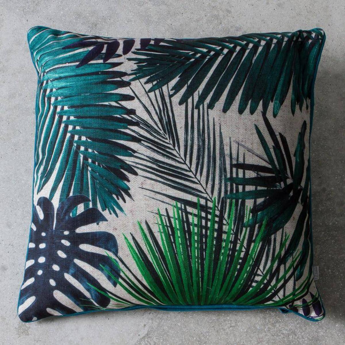 This is one of our absolute favourite cushions in our range. We love the striking palm leaf pattern in different greens contrasted with a neutral/off white background. The cushion is finished with contrasted turquoise piping on the edges and on the reverse and oozes luxury. We can picture this on some comfy seating in a kitchen-diner, on an occasional chair by a window or in a conservatory. Believe us, this cushion looks even better in real life.