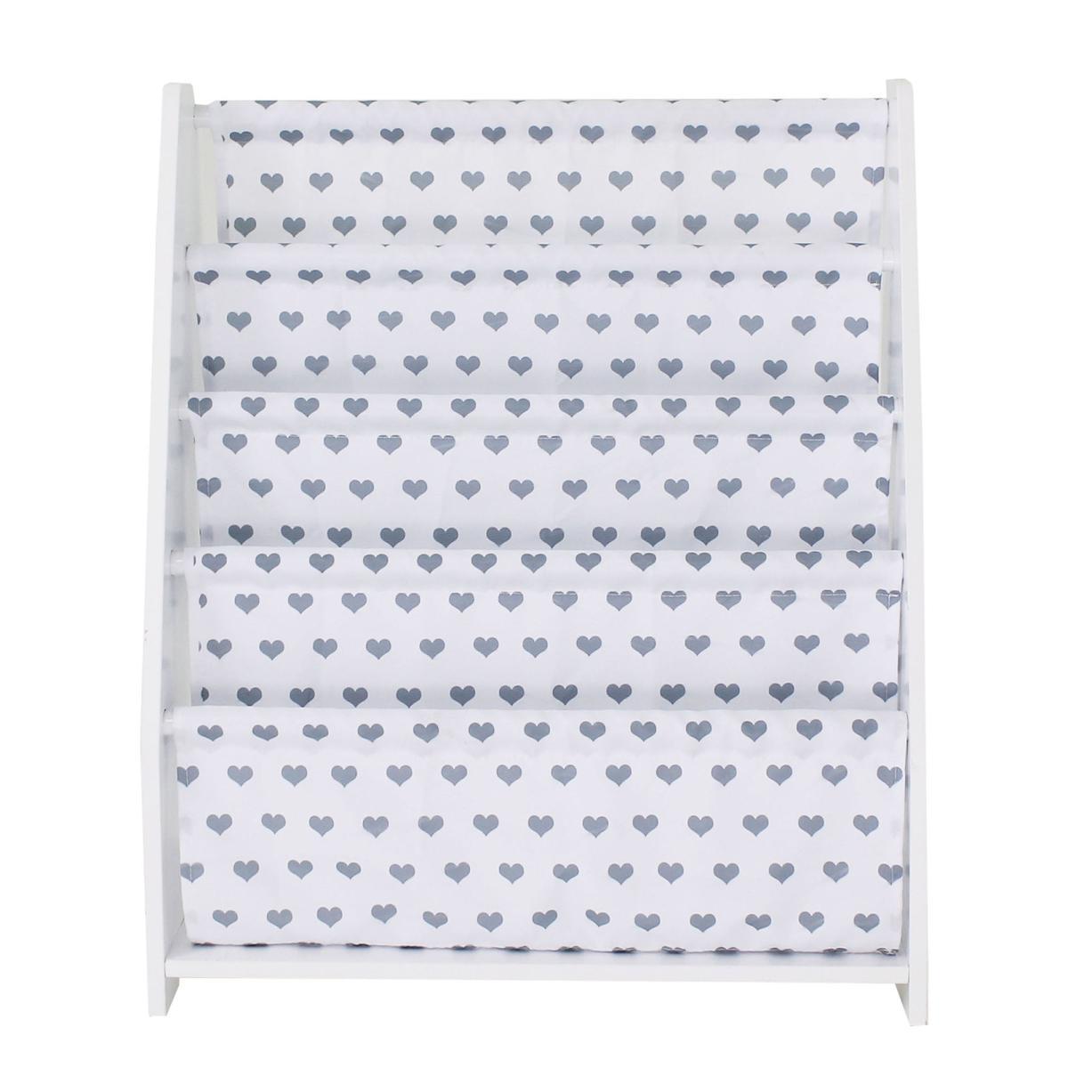 This kids hammock-style bookshelf, with white fabric and grey with printed grey hearts is ideal for bedrooms and playrooms. Easy to assemble this bookcase provides you and your kids with ample storage space for all their books, making reading time easier and more organised.